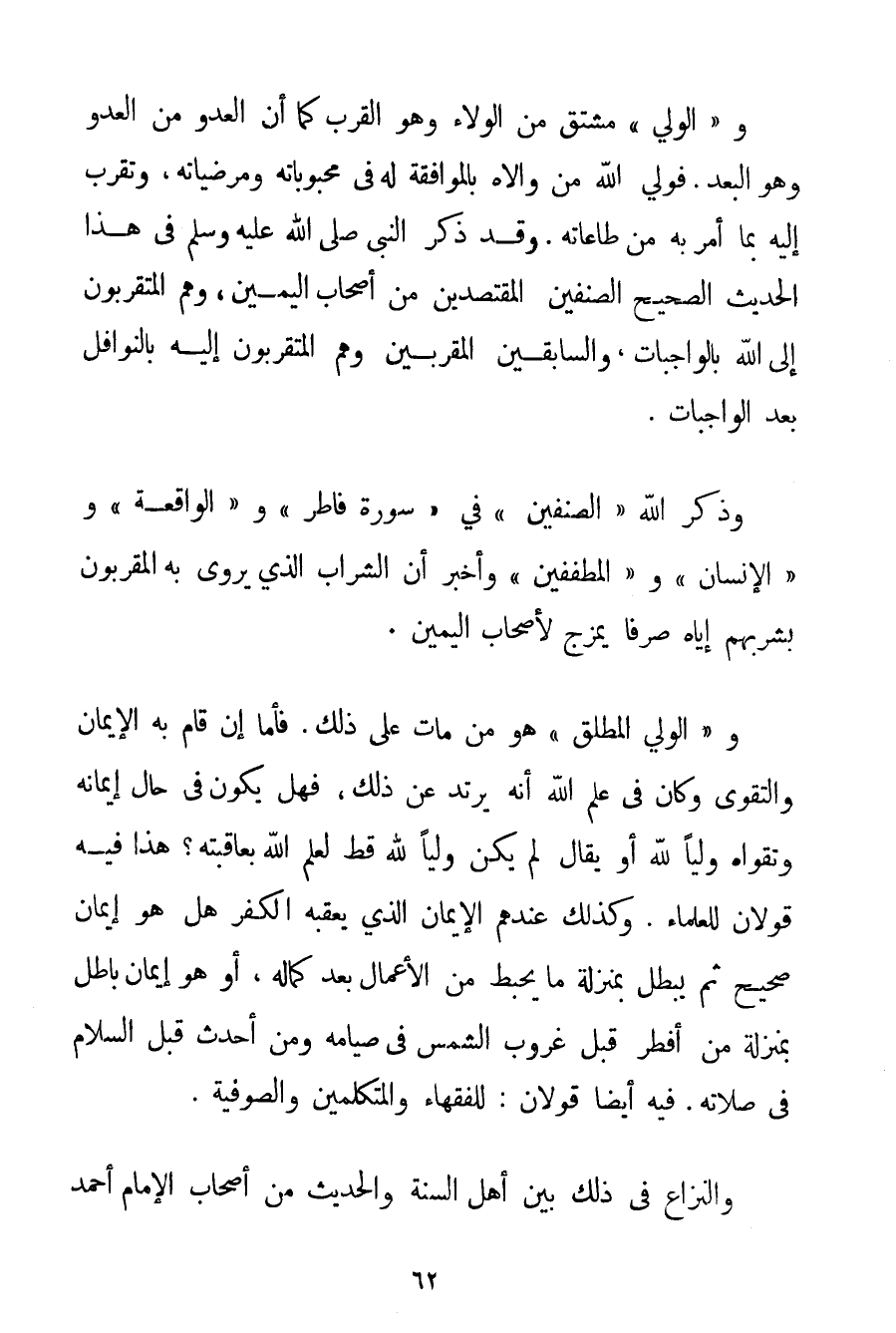 وَ " الْوَلِيُّ " مُشْتَقٌّ مِنْ الْوَلَاءِ وَهُوَ الْقُرْبُ كَمَا أَنَّ الْعَدُوَّ مِنْ الْعَدْوِ وَهُوَ الْبُعْدُ. فَوَلِيُّ اللَّهِ مَنْ وَالَاهُ بِالْمُوَافَقَةِ لَهُ فِي مَحْبُوبَاتِهِ وَمَرْضِيَّاتِهِ وَتَقَرَّبَ إلَيْهِ بِمَا أُمِرَ بِهِ مِنْ طَاعَاتِهِ. وَقَدْ ذَكَرَ النَّبِيُّ صَلَّى اللَّهُ عَلَيْهِ وَسَلَّمَ فِي هَذَا الْحَدِيثِ الصَّحِيحِ الصِّنْفَيْنِ الْمُقْتَصِدَيْنِ مِنْ أَصْحَابِ الْيَمِينِ وَهُمْ الْمُتَقَرِّبُونَ إلَى اللَّهِ بِالْوَاجِبَاتِ وَالسَّابِقِينَ الْمُقَرَّبِينَ وَهُمْ الْمُتَقَرِّبُونَ إلَيْهِ بِالنَّوَافِلِ بَعْدَ الْوَاجِبَاتِ. وَذَكَرَ اللَّهُ " الصِّنْفَيْنِ " فِي " سُورَةِ فَاطِرٍ " وَ " الْوَاقِعَةِ " وَ " الْإِنْسَانِ " وَ " الْمُطَفِّفِينَ " وَأَخْبَرَ أَنَّ الشَّرَابَ الَّذِي يُرْوَى بِهِ الْمُقَرَّبُونَ بِشُرْبِهِمْ إيَّاهُ صِرْفًا يُمْزَجُ لِأَصْحَابِ الْيَمِينِ. وَ " الْوَلِيُّ الْمُطْلَقُ " هُوَ مَنْ مَاتَ عَلَى ذَلِكَ. فَأَمَّا إنْ قَامَ بِهِ الْإِيمَانُ وَالتَّقْوَى وَكَانَ فِي عِلْمِ اللَّهِ أَنَّهُ يَرْتَدُّ عَنْ ذَلِكَ فَهَلْ يَكُونُ فِي حَالِ إيمَانِهِ وَتَقْوَاهُ وَلِيًّا لِلَّهِ أَوْ يُقَالُ لَمْ يَكُنْ وَلِيًّا لِلَّهِ قَطُّ لِعِلْمِ اللَّهِ بِعَاقِبَتِهِ؟ هَذَا فِيهِ قَوْلَانِ لِلْعُلَمَاءِ. وَكَذَلِكَ عِنْدَهُمْ الْإِيمَانُ الَّذِي يَعْقُبُهُ الْكُفْرُ هَلْ هُوَ إيمَانٌ صَحِيحٌ ثُمَّ يَبْطُلُ بِمَنْزِلَةِ مَا يُحْبَطُ مِنْ الْأَعْمَالِ بَعْدَ كَمَالِهِ أَوْ هُوَ إيمَانٌ بَاطِلٌ بِمَنْزِلَةِ مَنْ أَفْطَرَ قَبْلَ غُرُوبِ الشَّمْسِ فِي صِيَامِهِ وَمَنْ أَحْدَثَ قَبْلَ السَّلَامِ فِي صِلَاتِهِ. فِيهِ أَيْضًا قَوْلَانِ: لِلْفُقَهَاءِ وَالْمُتَكَلِّمِين وَالصُّوفِيَّةِ.