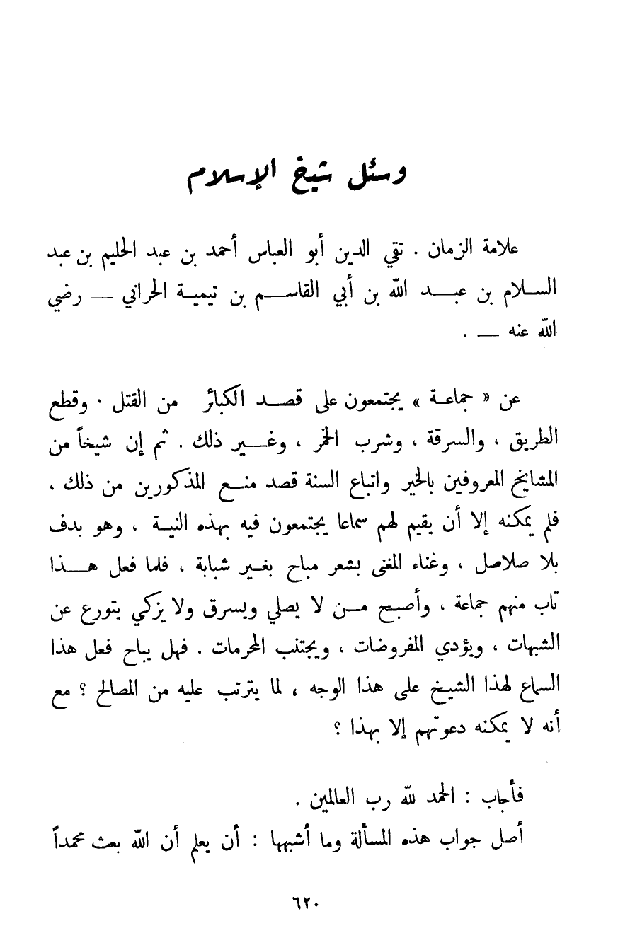 وَسُئِلَ شَيْخُ الْإِسْلَامِ عَلَّامَةُ الزَّمَانِ، تَقِيُّ الدِّينِ أَبُو الْعَبَّاسِ أَحْمَد بْنُ عَبْدِ الْحَلِيمِ بْنِ عَبْدِ السَّلَامِ بْنِ عَبْدِ اللَّهِ بْنِ أَبِي الْقَاسِمِ بْنِ تَيْمِيَّة الْحَرَّانِي - رَضِيَ اللَّهُ عَنْهُ -: