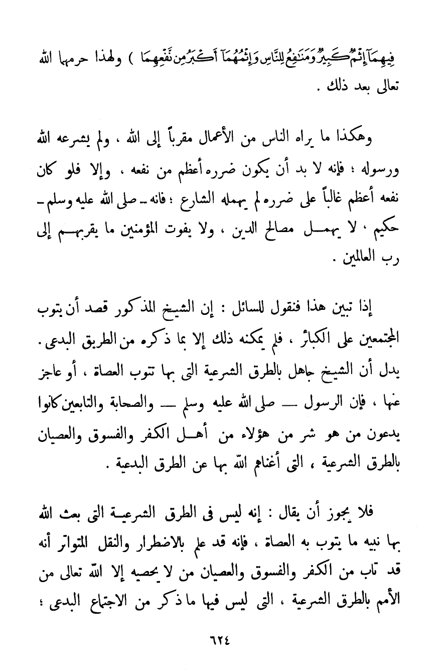عَنِ الْخَمْرِ وَالْمَيْسِرِ قُلْ فِيهِمَا إثْمٌ كَبِيرٌ وَمَنَافِعُ لِلنَّاسِ وَإِثْمُهُمَا أَكْبَرُ مِنْ نَفْعِهِمَا} وَلِهَذَا حَرَّمَهُمَا اللَّهُ تَعَالَى بَعْدَ ذَلِكَ. وَهَكَذَا مَا يَرَاهُ النَّاسُ مِنْ الْأَعْمَالِ مُقَرِّبًا إلَى اللَّهِ وَلَمْ يُشَرِّعْهُ اللَّهُ وَرَسُولُهُ؛ فَإِنَّهُ لَا بُدَّ أَنْ يَكُونَ ضَرَرُهُ أَعْظَمَ مِنْ نَفْعِهِ وَإِلَّا فَلَوْ كَانَ نَفْعُهُ أَعْظَمَ غَالِبًا عَلَى ضَرَرِهِ لَمْ يُهْمِلْهُ الشَّارِعُ؛ فَإِنَّهُ - صَلَّى اللَّهُ عَلَيْهِ وَسَلَّمَ - حَكِيمٌ لَا يُهْمِلُ مَصَالِحَ الدِّينِ وَلَا يُفَوِّتُ الْمُؤْمِنِينَ مَا يُقَرِّبُهُمْ إلَى رَبِّ الْعَالَمِينَ. إذَا تَبَيَّنَ هَذَا فَنَقُولُ لِلسَّائِلِ: إنَّ الشَّيْخَ الْمَذْكُورَ قَصَدَ أَنْ يتوب الْمُجْتَمِعِينَ عَلَى الْكَبَائِرِ فَلَمْ يُمْكِنْهُ ذَلِكَ إلَّا بِمَا ذَكَرَهُ مِنْ الطَّرِيقِ الْبِدْعِيِّ. يَدُلُّ أَنَّ الشَّيْخَ جَاهِلٌ بِالطُّرُقِ الشَّرْعِيَّةِ الَّتِي بِهَا تَتُوبُ الْعُصَاةُ أَوْ عَاجِزٌ عَنْهَا فَإِنَّ الرَّسُولَ - صَلَّى اللَّهُ عَلَيْهِ وَسَلَّمَ - وَالصَّحَابَةَ وَالتَّابِعِينَ كَانُوا يَدْعُونَ مَنْ هُوَ شَرٌّ مِنْ هَؤُلَاءِ مِنْ أَهْلِ الْكُفْرِ وَالْفُسُوقِ وَالْعِصْيَانِ بِالطُّرُقِ الشَّرْعِيَّةِ الَّتِي أَغْنَاهُمْ اللَّهُ بِهَا عَنْ الطُّرُقِ الْبِدْعِيَّةِ. فَلَا يَجُوزُ أَنْ يُقَالَ: إنَّهُ لَيْسَ فِي الطُّرُقِ الشَّرْعِيَّةِ الَّتِي بَعَثَ اللَّهُ بِهَا نَبِيَّهُ مَا يَتُوبُ بِهِ الْعُصَاةُ فَإِنَّهُ قَدْ عُلِمَ بِالِاضْطِرَارِ وَالنَّقْلِ الْمُتَوَاتِرِ أَنَّهُ قَدْ تَابَ مِنْ الْكُفْرِ وَالْفُسُوقِ وَالْعِصْيَانِ مَنْ لَا يُحْصِيه إلَّا اللَّهُ تَعَالَى مِنْ الْأُمَمِ بِالطُّرُقِ الشَّرْعِيَّةِ الَّتِي لَيْسَ فِيهَا مَا ذُكِرَ مِنْ الِاجْتِمَاعِ الْبِدْعِيِّ؛
