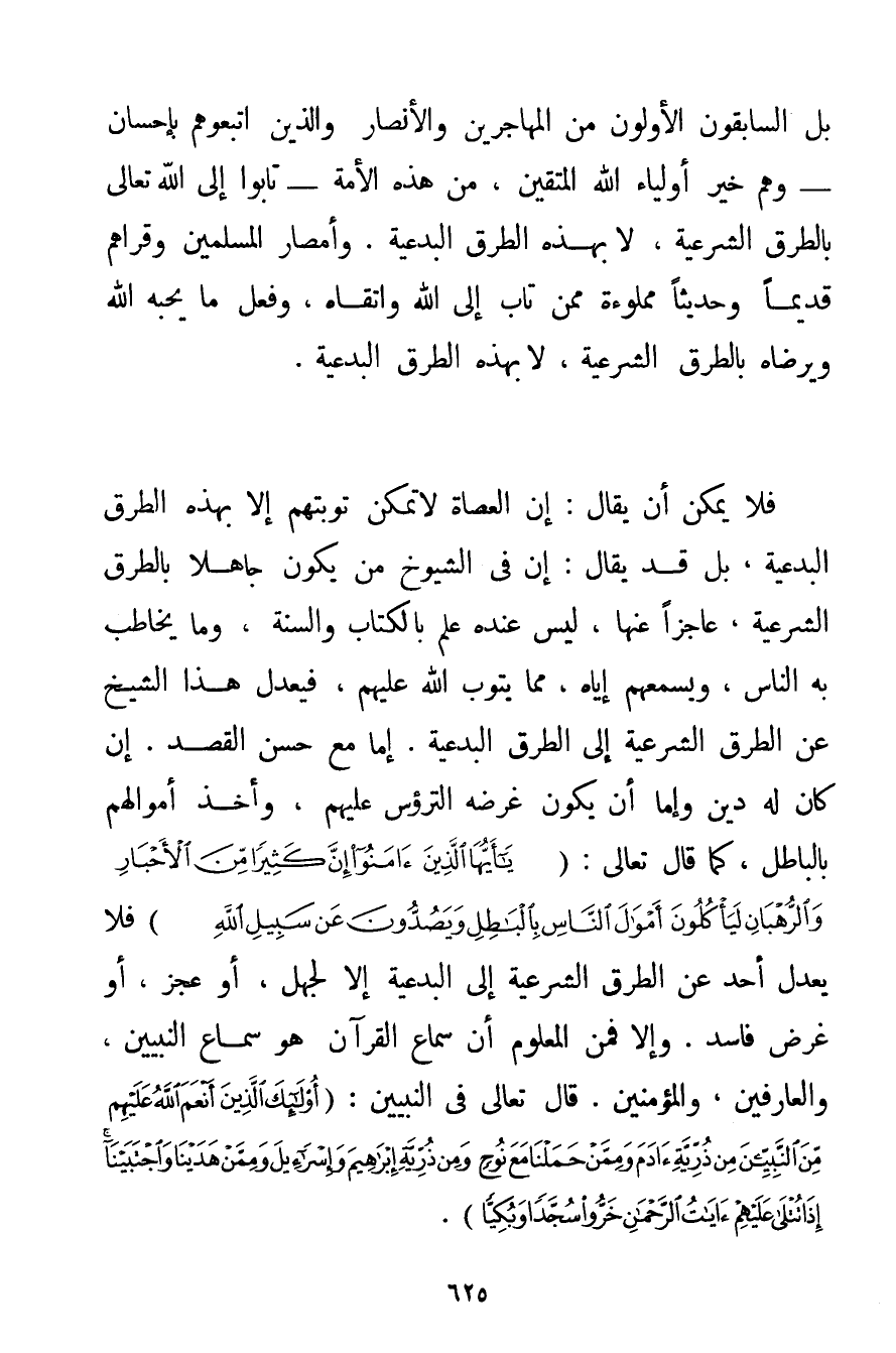 بَلْ السَّابِقُونَ الْأَوَّلُونَ مِنْ الْمُهَاجِرِينَ وَالْأَنْصَارِ وَاَلَّذِينَ اتَّبَعُوهُمْ بِإِحْسَانِ - وَهُمْ خَيْرُ أَوْلِيَاءِ اللَّهِ الْمُتَّقِينَ مِنْ هَذِهِ الْأُمَّةِ - تَابُوا إلَى اللَّهِ تَعَالَى بِالطُّرُقِ الشَّرْعِيَّةِ لَا بِهَذِهِ الطُّرُقِ الْبِدْعِيَّةِ. وَأَمْصَارُ الْمُسْلِمِينَ وَقُرَاهُمْ قَدِيمًا وَحَدِيثًا مَمْلُوءَةٌ مِمَّنْ تَابَ إلَى اللَّهِ وَاتَّقَاهُ وَفَعَلَ مَا يُحِبُّهُ اللَّهُ وَيَرْضَاهُ بِالطُّرُقِ الشَّرْعِيَّةِ لَا بِهَذِهِ الطُّرُقِ الْبِدْعِيَّةِ. فَلَا يُمْكِنُ أَنْ يُقَالُ: إنَّ الْعُصَاةَ لَا تُمْكِنُ تَوْبَتُهُمْ إلَّا بِهَذِهِ الطُّرُقِ الْبِدْعِيَّةِ بَلْ قَدْ يُقَالُ: إنَّ فِي الشُّيُوخِ مَنْ يَكُونُ جَاهِلًا بِالطُّرُقِ الشَّرْعِيَّةِ عَاجِزًا عَنْهَا لَيْسَ عِنْدَهُ عِلْمٌ بِالْكِتَابِ وَالسُّنَّةِ وَمَا يُخَاطِبُ بِهِ النَّاسَ وَيُسْمِعُهُمْ إيَّاهُ مِمَّا يَتُوبُ اللَّهُ عَلَيْهِمْ فَيَعْدِلُ هَذَا الشَّيْخُ عَنْ الطُّرُقِ الشَّرْعِيَّةِ إلَى الطُّرُقِ الْبِدْعِيَّةِ. إمَّا مَعَ حُسْنِ الْقَصْدِ. إنْ كَانَ لَهُ دِينٌ وَإِمَّا أَنْ يَكُونَ غَرَضُهُ التَّرَؤُّسَ عَلَيْهِمْ وَأَخْذَ أَمْوَالِهِمْ بِالْبَاطِلِ كَمَا قَالَ تَعَالَى: {يَا أَيُّهَا الَّذِينَ آمَنُوا إنَّ كَثِيرًا مِنَ الْأَحْبَارِ وَالرُّهْبَانِ لَيَأْكُلُونَ أَمْوَالَ النَّاسِ بِالْبَاطِلِ وَيَصُدُّونَ عَنْ سَبِيلِ اللَّهِ} فَلَا يَعْدِلُ أَحَدٌ عَنْ الطُّرُقِ الشَّرْعِيَّةِ إلَى الْبِدْعِيَّةِ إلَّا لِجَهْلِ أَوْ عَجْزٍ أَوْ غَرَضٍ فَاسِدٍ. وَإِلَّا فَمِنْ الْمَعْلُومِ أَنَّ سَمَاعَ الْقُرْآنِ هُوَ سَمَاعُ النَّبِيِّينَ وَالْعَارِفِينَ وَالْمُؤْمِنِينَ. قَالَ تَعَالَى فِي النَّبِيِّينَ: {أُولَئِكَ الَّذِينَ أَنْعَمَ اللَّهُ عَلَيْهِمْ مِنَ النَّبِيِّينَ مِنْ ذُرِّيَّةِ آدَمَ وَمِمَّنْ حَمَلْنَا مَعَ نُوحٍ وَمِنْ ذُرِّيَّةِ إبْرَاهِيمَ وَإِسْرَائِيلَ وَمِمَّنْ هَدَيْنَا وَاجْتَبَيْنَا إذَا تُتْلَى عَلَيْهِمْ آيَاتُ الرَّحْمَنِ خَرُّوا سُجَّدًا وَبُكِيًّا} .