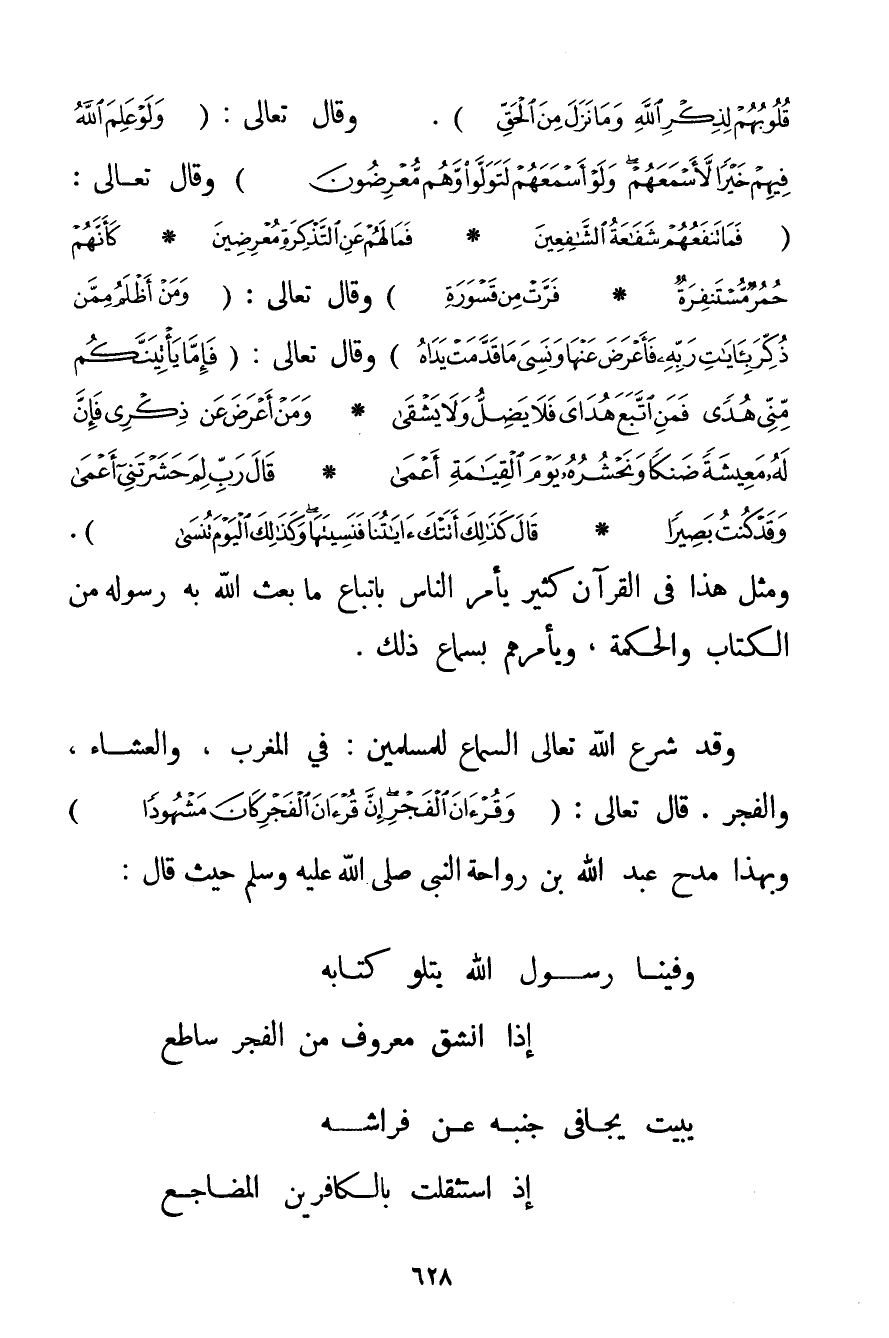 قُلُوبُهُمْ لِذِكْرِ اللَّهِ وَمَا نَزَلَ مِنَ الْحَقِّ} . وَقَالَ تَعَالَى: {وَلَوْ عَلِمَ اللَّهُ فِيهِمْ خَيْرًا لَأَسْمَعَهُمْ وَلَوْ أَسْمَعَهُمْ لَتَوَلَّوْا وَهُمْ مُعْرِضُونَ} وَقَالَ تَعَالَى: {فَمَا تَنْفَعُهُمْ شَفَاعَةُ الشَّافِعِينَ} {فَمَا لَهُمْ عَنِ التَّذْكِرَةِ مُعْرِضِينَ} {كَأَنَّهُمْ حُمُرٌ مُسْتَنْفِرَةٌ} {فَرَّتْ مِنْ قَسْوَرَةٍ} وَقَالَ تَعَالَى: {وَمَنْ أَظْلَمُ مِمَّنْ ذُكِّرَ بِآيَاتِ رَبِّهِ فَأَعْرَضَ عَنْهَا وَنَسِيَ مَا قَدَّمَتْ يَدَاهُ} وَقَالَ تَعَالَى: {فَإِمَّا يَأْتِيَنَّكُمْ مِنِّي هُدًى فَمَنِ اتَّبَعَ هُدَايَ فَلَا يَضِلُّ وَلَا يَشْقَى} {وَمَنْ أَعْرَضَ عَنْ ذِكْرِي فَإِنَّ لَهُ مَعِيشَةً ضَنْكًا وَنَحْشُرُهُ يَوْمَ الْقِيَامَةِ أَعْمَى} {قَالَ رَبِّ لِمَ حَشَرْتَنِي أَعْمَى وَقَدْ كُنْتُ بَصِيرًا} {قَالَ كَذَلِكَ أَتَتْكَ آيَاتُنَا فَنَسِيتَهَا وَكَذَلِكَ الْيَوْمَ تُنْسَى} . وَمِثْلُ هَذَا فِي الْقُرْآنِ كَثِيرٌ يَأْمُرُ النَّاسَ بِاتِّبَاعِ مَا بَعَثَ اللَّهُ بِهِ رَسُولَهُ مِنْ الْكِتَابِ وَالْحِكْمَةِ وَيَأْمُرُهُمْ بِسَمَاعِ ذَلِكَ. وَقَدْ شَرَعَ اللَّهُ تَعَالَى السَّمَاعَ لِلْمُسْلِمِينَ: فِي الْمَغْرِبِ وَالْعِشَاءِ وَالْفَجْرِ. قَالَ تَعَالَى: {وَقُرْآنَ الْفَجْرِ إنَّ قُرْآنَ الْفَجْرِ كَانَ مَشْهُودًا} وَبِهَذَا مَدَحَ عَبْدُ اللَّهِ بْنُ رَوَاحَةَ النَّبِيَّ حَيْثُ قَالَ: