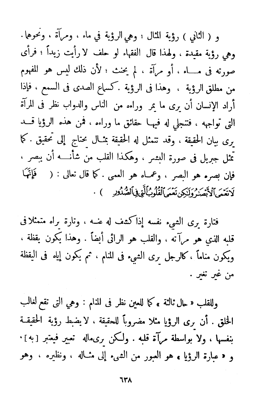 وَالثَّانِي: رُؤْيَةُ الْمِثَالِ؛ وَهِيَ الرُّؤْيَةُ فِي مَاءٍ وَمِرْآةٍ وَنَحْوِهِمَا. وَهِيَ رُؤْيَةٌ مُقَيَّدَةٌ وَلِهَذَا قَالَ الْفُقَهَاءُ لَوْ حَلَفَ لَا رَأَيْت زَيْدًا؛ فَرَأَى صُورَتَهُ فِي مَاءٍ أَوْ مِرْآةٍ لَمْ يَحْنَثْ؛ لِأَنَّ ذَلِكَ لَيْسَ هُوَ الْمَفْهُومُ مِنْ مُطْلَقِ الرُّؤْيَةِ وَهَذَا فِي الرُّؤْيَةِ. كَسَمَاعِ الصَّدَى فِي السَّمْعِ فَإِذَا أَرَادَ الْإِنْسَانُ أَنْ يَرَى مَا يَمُرُّ وَرَاءَهُ مِنْ النَّاسِ وَالدَّوَابِّ نَظَرَ فِي الْمِرْآةِ الَّتِي تُوَاجِهُهُ فَتَنْجَلِي لَهُ فِيهَا حَقَائِقُ مَا وَرَاءَهُ فَمِنْ هَذِهِ الرُّؤْيَا قَدْ يَرَى بَيَانَ الْحَقِيقَةِ وَقَدْ تَتَمَثَّلُ لَهُ الْحَقِيقَةُ بِمِثَالِ يَحْتَاجُ إلَى تَحْقِيقٍ. كَمَا تَمَثَّلَ جِبْرِيلُ فِي صُورَةِ الْبَشَرِ وَهَكَذَا الْقَلْبُ مِنْ شَأْنِهِ أَنْ يُبْصِرَ فَإِنَّ بَصَرَهُ هُوَ الْبَصَرُ وَعَمَاهُ هُوَ الْعَمَى. كَمَا قَالَ تَعَالَى: {فَإِنَّهَا لَا تَعْمَى الْأَبْصَارُ وَلَكِنْ تَعْمَى الْقُلُوبُ الَّتِي فِي الصُّدُورِ} . فَتَارَةً يَرَى الشَّيْءَ نَفْسَهُ إذَا كُشِفَ لَهُ عَنْهُ وَتَارَةً يَرَاهُ مُتَمَثِّلًا فِي قَلْبِهِ الَّذِي هُوَ مِرْآتُهُ وَالْقَلْبُ هُوَ الرَّائِي أَيْضًا. وَهَذَا يَكُونُ يَقَظَةً وَيَكُونُ مَنَامًا كَالرَّجُلِ يَرَى الشَّيْءَ فِي الْمَنَامِ ثُمَّ يَكُونُ إيَّاهُ فِي الْيَقَظَةِ مِنْ غَيْرِ تَغَيُّرٍ. وَلِلْقَلْبِ " حَالٌ ثَالِثَةٌ " كَمَا لِلْعَيْنِ نَظَرٌ فِي الْمَنَامِ: وَهِيَ الَّتِي تَقَعُ لِغَالِبِ الْخَلْقِ. أَنْ يَرَى الرُّؤْيَا مَثَلًا مَضْرُوبًا لِلْحَقِيقَةِ لَا يَضْبُطُ رُؤْيَةَ الْحَقِيقَةِ بِنَفْسِهَا وَلَا بِوَاسِطَةِ مِرْآةِ قَلْبِهِ. وَلَكِنْ يَرَى مَا لَهُ تَعْبِيرٌ فَيَعْتَبِرُ بِهِ وَ " عِبَارَةُ الرُّؤْيَا " هُوَ الْعُبُورُ مِنْ الشَّيْءِ إلَى مِثَالِهِ وَنَظِيرِهِ وَهُوَ