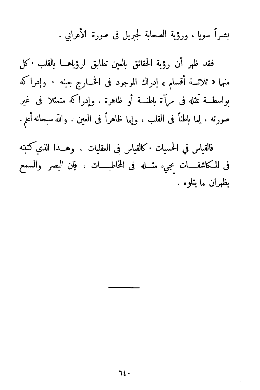 بَشَرًا سَوِيًّا وَرُؤْيَةِ الصَّحَابَةِ لِجِبْرِيلَ فِي صُورَةِ الْأَعْرَابِيِّ. فَقَدْ ظَهَرَ أَنَّ رُؤْيَةَ الْحَقَائِقِ بِالْعَيْنِ تُطَابِقُ لِرُؤْيَاهَا بِالْقَلْبِ كُلٌّ مِنْهُمَا " ثَلَاثَةُ أَقْسَامٍ " إدْرَاكُ الْمَوْجُودِ فِي الْخَارِجِ بِعَيْنِهِ وَإِدْرَاكُهُ بِوَاسِطَةِ تَمَثُّلِهِ فِي مِرْآةٍ بَاطِنَةٍ أَوْ ظَاهِرَةٍ وَإِدْرَاكُهُ مُتَمَثِّلًا فِي غَيْرِ صُورَتِهِ إمَّا بَاطِنًا فِي الْقَلْبِ وَإِمَّا ظَاهِرًا فِي الْعَيْنِ. وَاَللَّهُ سُبْحَانَهُ أَعْلَمُ. فَالْقِيَاسُ فِي الْحِسِّيَّاتِ كَالْقِيَاسِ فِي الْعَقْلِيَّاتِ وَهَذَا الَّذِي كَتَبْته فِي الْمُكَاشَفَاتِ يَجِيءُ مِثْلُهُ فِي الْمُخَاطَبَاتِ فَإِنَّ الْبَصَرَ وَالسَّمْعَ يُظْهِرَانِ مَا يَتْلُوهُ.