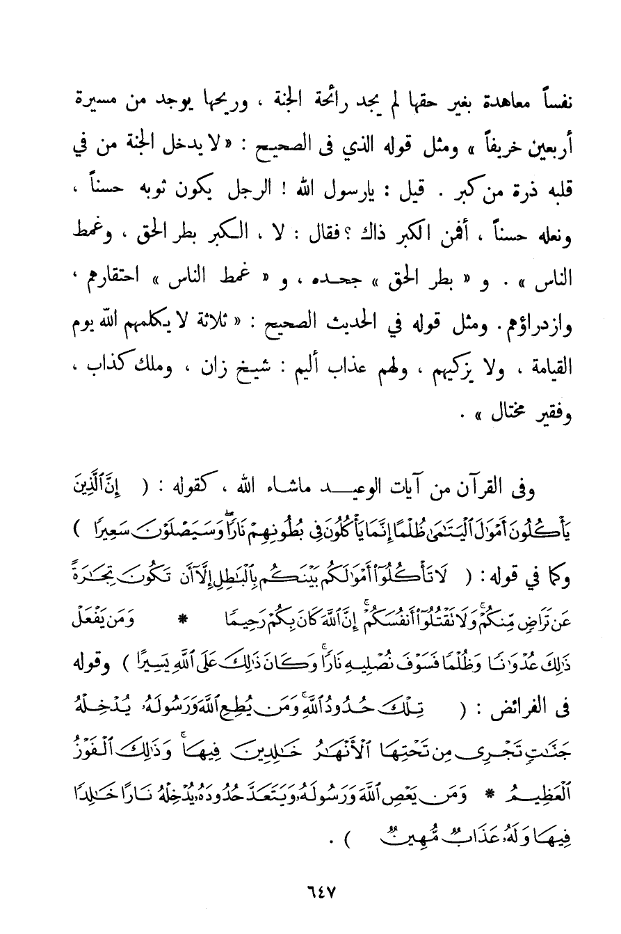 نَفْسًا مُعَاهَدَةً بِغَيْرِ حَقِّهَا لَمْ يَجِدْ رَائِحَةَ الْجَنَّةِ وَرِيحُهَا يُوجَدُ مِنْ مَسِيرَةِ أَرْبَعِينَ خَرِيفًا} " وَمِثْلُ قَوْلِهِ الَّذِي فِي الصَّحِيحِ: " {لَا يَدْخُلُ الْجَنَّةَ مَنْ فِي قَلْبِهِ ذَرَّةٌ مِنْ كِبْرٍ. قِيلَ: يَا رَسُولَ اللَّهِ الرَّجُلُ يَكُونُ ثَوْبُهُ حَسَنًا وَنَعْلُهُ حَسَنًا أَفَمِنْ الْكِبْرِ ذَاكَ؟ فَقَالَ: لَا الْكِبْرُ بَطَرُ الْحَقِّ وَغَمْطُ النَّاسِ} . وَ " بَطَرُ الْحَقِّ " جَحْدُهُ وَ " غَمْطُ النَّاسِ " احْتِقَارُهُمْ وَازْدِرَاؤُهُمْ. وَمِثْلُ قَوْلِهِ فِي الْحَدِيثِ الصَّحِيحِ: {ثَلَاثَةٌ لَا يُكَلِّمُهُمْ اللَّهُ يَوْمَ الْقِيَامَةِ وَلَا يُزَكِّيهِمْ وَلَهُمْ عَذَابٌ أَلِيمٌ: شَيْخٌ زَانٍ وَمَلِكٌ كَذَّابٌ وَفَقِيرٌ مُخْتَالٌ} ". وَفِي الْقُرْآنِ مِنْ آيَاتِ الْوَعِيدِ مَا شَاءَ اللَّهُ كَقَوْلِهِ: {إنَّ الَّذِينَ يَأْكُلُونَ أَمْوَالَ الْيَتَامَى ظُلْمًا إنَّمَا يَأْكُلُونَ فِي بُطُونِهِمْ نَارًا وَسَيَصْلَوْنَ سَعِيرًا} وَكَمَا فِي قَوْلِهِ: {لَا تَأْكُلُوا أَمْوَالَكُمْ بَيْنَكُمْ بِالْبَاطِلِ إلَّا أَنْ تَكُونَ تِجَارَةً عَنْ تَرَاضٍ مِنْكُمْ وَلَا تَقْتُلُوا أَنْفُسَكُمْ إنَّ اللَّهَ كَانَ بِكُمْ رَحِيمًا} {وَمَنْ يَفْعَلْ ذَلِكَ عُدْوَانًا وَظُلْمًا فَسَوْفَ نُصْلِيهِ نَارًا وَكَانَ ذَلِكَ عَلَى اللَّهِ يَسِيرًا} وَقَوْلُهُ فِي الْفَرَائِضِ: {تِلْكَ حُدُودُ اللَّهِ وَمَنْ يُطِعِ اللَّهَ وَرَسُولَهُ يُدْخِلْهُ جَنَّاتٍ تَجْرِي مِنْ تَحْتِهَا الْأَنْهَارُ خَالِدِينَ فِيهَا وَذَلِكَ الْفَوْزُ الْعَظِيمُ} {وَمَنْ يَعْصِ اللَّهَ وَرَسُولَهُ وَيَتَعَدَّ حُدُودَهُ يُدْخِلْهُ نَارًا خَالِدًا فِيهَا وَلَهُ عَذَابٌ مُهِينٌ} .