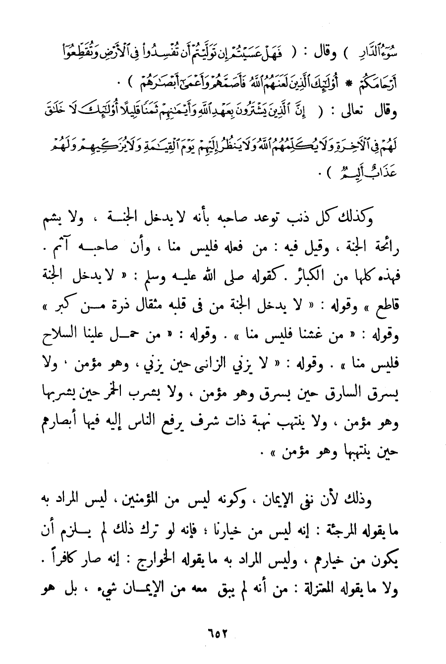أُولَئِكَ لَهُمُ اللَّعْنَةُ وَلَهُمْ سُوءُ الدَّارِ} وَقَالَ: {فَهَلْ عَسَيْتُمْ إنْ تَوَلَّيْتُمْ أَنْ تُفْسِدُوا فِي الْأَرْضِ وَتُقَطِّعُوا أَرْحَامَكُمْ} {أُولَئِكَ الَّذِينَ لَعَنَهُمُ اللَّهُ فَأَصَمَّهُمْ وَأَعْمَى أَبْصَارَهُمْ} . وَقَالَ تَعَالَى: {إنَّ الَّذِينَ يَشْتَرُونَ بِعَهْدِ اللَّهِ وَأَيْمَانِهِمْ ثَمَنًا قَلِيلًا أُولَئِكَ لَا خَلَاقَ لَهُمْ فِي الْآخِرَةِ وَلَا يُكَلِّمُهُمُ اللَّهُ وَلَا يَنْظُرُ إلَيْهِمْ يَوْمَ الْقِيَامَةِ وَلَا يُزَكِّيهِمْ وَلَهُمْ عَذَابٌ أَلِيمٌ} . وَكَذَلِكَ كُلُّ ذَنْبٍ تُوُعِّدَ صَاحِبُهُ بِأَنَّهُ لَا يَدْخُلُ الْجَنَّةَ وَلَا يَشُمُّ رَائِحَةَ الْجَنَّةِ وَقِيلَ فِيهِ: مَنْ فَعَلَهُ فَلَيْسَ مِنَّا وَأَنَّ صَاحِبَهُ آثِمٌ. فَهَذِهِ كُلُّهَا مِنْ الْكَبَائِرِ. كَقَوْلِهِ صَلَّى اللَّهُ عَلَيْهِ وَسَلَّمَ {لَا يَدْخُلُ الْجَنَّةَ قَاطِعٌ} " وَقَوْلُهُ: " {لَا يَدْخُلُ الْجَنَّةَ مَنْ فِي قَلْبِهِ مِثْقَالُ ذَرَّةٍ مِنْ كِبْرٍ} وَقَوْلُهُ: {مَنْ غَشَّنَا فَلَيْسَ مِنَّا} ". وَقَوْلُهُ: {مَنْ حَمَلَ عَلَيْنَا السِّلَاحَ فَلَيْسَ مِنَّا} ". وَقَوْلُهُ: " {لَا يَزْنِي الزَّانِي حِينَ يَزْنِي وَهُوَ مُؤْمِنٌ وَلَا يَسْرِقُ السَّارِقُ حِينَ يَسْرِقُ وَهُوَ مُؤْمِنٌ وَلَا يَشْرَبُ الْخَمْرَ حِينَ يَشْرَبُهَا وَهُوَ مُؤْمِنٌ وَلَا يَنْتَهِبُ نُهْبَةً ذَاتَ شَرَفٍ يَرْفَعُ النَّاسُ إلَيْهِ فِيهَا أَبْصَارَهُمْ حِينَ يَنْتَهِبُهَا وَهُوَ مُؤْمِنٌ} ". وَذَلِكَ لِأَنَّ نَفْيَ الْإِيمَانِ وَكَوْنَهُ لَيْسَ مِنْ الْمُؤْمِنِينَ لَيْسَ الْمُرَادُ بِهِ مَا يَقُولُهُ الْمُرْجِئَةُ: إنَّهُ لَيْسَ مِنْ خِيَارِنَا؛ فَإِنَّهُ لَوْ تَرَكَ ذَلِكَ لَمْ يَلْزَمْ أَنْ يَكُونَ مِنْ خِيَارِهِمْ وَلَيْسَ الْمُرَادُ بِهِ مَا يَقُولُهُ الْخَوَارِجُ: إنَّهُ صَارَ كَافِرًا. وَلَا مَا يَقُولُهُ الْمُعْتَزِلَةُ: مِنْ أَنَّهُ لَمْ يَبْقَ مَعَهُ مِنْ الْإِيمَانِ شَيْءٌ بَلْ