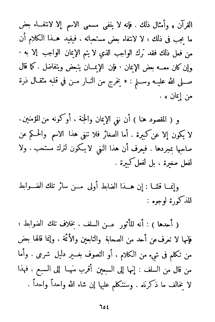 الْقُرْآنِ} " وَأَمْثَالِ ذَلِكَ. فَإِنَّهُ لَا يَنْفِي مُسَمَّى الِاسْمِ إلَّا لِانْتِفَاءِ بَعْضِ مَا يَجِبُ فِي ذَلِكَ؛ لَا لِانْتِفَاءِ بَعْضِ مُسْتَحَبَّاتِهِ فَيُفِيدُ هَذَا الْكَلَامُ أَنَّ مَنْ فَعَلَ ذَلِكَ فَقَدْ تَرَكَ الْوَاجِبَ الَّذِي لَا يَتِمُّ الْإِيمَانُ الْوَاجِبُ إلَّا بِهِ وَإِنْ كَانَ مَعَهُ بَعْضُ الْإِيمَانِ فَإِنَّ الْإِيمَانَ يَتَبَعَّضُ وَيَتَفَاضَلُ. كَمَا قَالَ صَلَّى اللَّهُ عَلَيْهِ وَسَلَّمَ " {يَخْرُجُ مَنْ النَّارِ مَنْ فِي قَلْبِهِ مِثْقَالُ ذَرَّةٍ مِنْ إيمَانٍ} ". وَ (الْمَقْصُودُ هُنَا أَنَّ نَفْيَ الْإِيمَانِ وَالْجَنَّةِ أَوْ كَوْنَهُ مِنْ الْمُؤْمِنِينَ لَا يَكُونُ إلَّا عَنْ كَبِيرَةٍ. أَمَّا الصَّغَائِرُ فَلَا تَنْفِي هَذَا الِاسْمَ وَالْحُكْمَ عَنْ صَاحِبِهَا بِمُجَرَّدِهَا. فَيُعْرَفُ أَنَّ هَذَا النَّفْيَ لَا يَكُونُ لِتَرْكِ مُسْتَحَبٍّ وَلَا لِفِعْلِ صَغِيرَةٍ بَلْ لِفِعْلِ كَبِيرَةٍ. وَإِنَّمَا قُلْنَا: إنَّ هَذَا الضَّابِطَ أَوْلَى مِنْ سَائِرِ تِلْكَ الضَّوَابِطِ الْمَذْكُورَةِ لِوُجُوهِ: