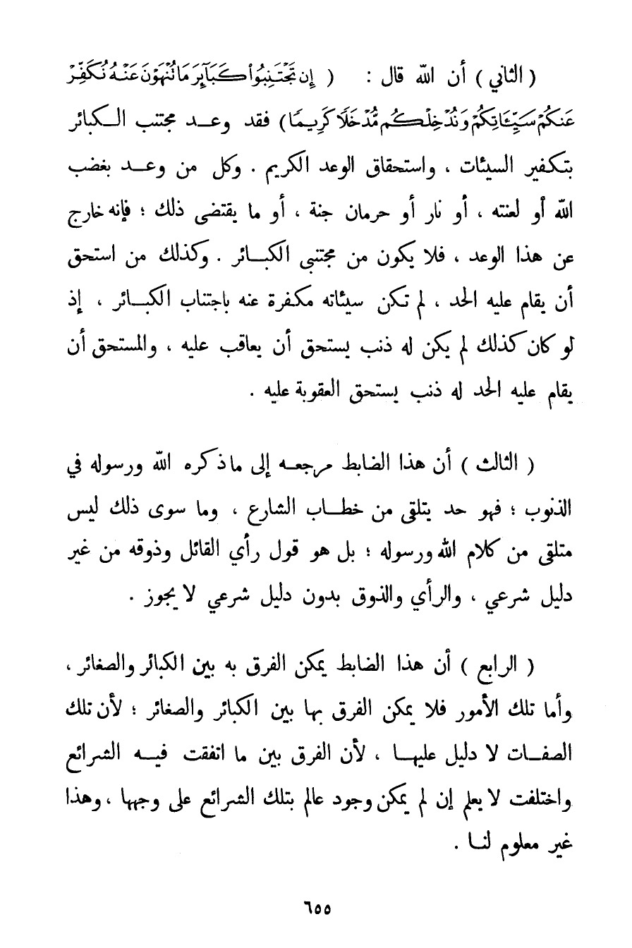 الثَّالِثُ: أَنَّ هَذَا الضَّابِطَ مَرْجِعُهُ إلَى مَا ذَكَرَهُ اللَّهُ وَرَسُولُهُ فِي الذُّنُوبِ؛ فَهُوَ حَدٌّ يُتَلَقَّى مِنْ خِطَابِ الشَّارِعِ وَمَا سِوَى ذَلِكَ لَيْسَ مُتَلَقًّى مِنْ كَلَامِ اللَّهِ وَرَسُولِهِ؛ بَلْ هُوَ قَوْلُ رَأْيِ الْقَائِلِ وَذَوْقِهِ مِنْ غَيْرِ دَلِيلٍ شَرْعِيٍّ وَالرَّأْيُ وَالذَّوْقُ بِدُونِ دَلِيلٍ شَرْعِيٍّ لَا يَجُوزُ.
