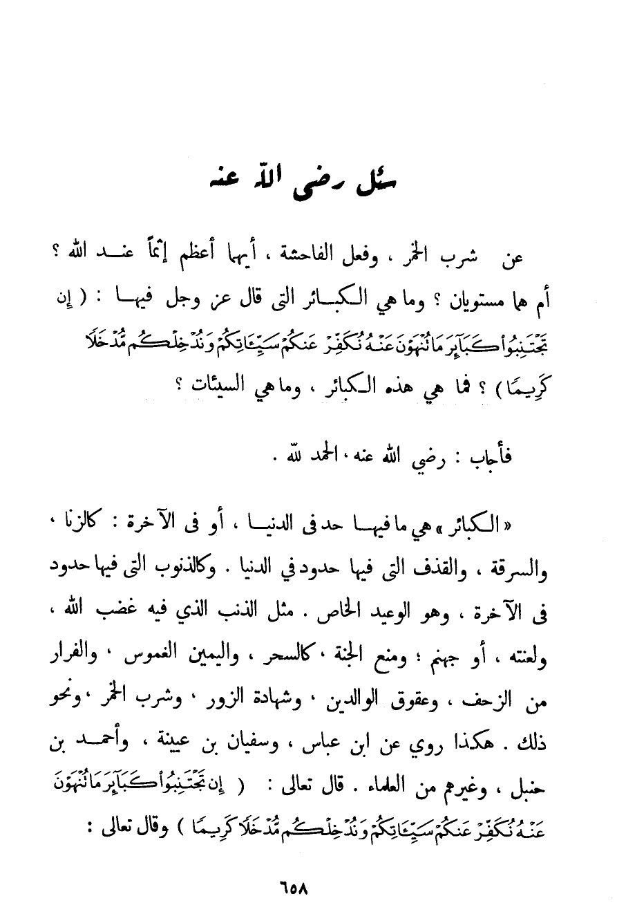 الْحَمْدُ لِلَّهِ، " الْكَبَائِرُ " هِيَ مَا فِيهَا حَدٌّ فِي الدُّنْيَا أَوْ فِي الْآخِرَةِ: كَالزِّنَا وَالسَّرِقَةِ وَالْقَذْفِ الَّتِي فِيهَا حُدُودٌ فِي الدُّنْيَا. وَكَالذُّنُوبِ الَّتِي فِيهَا حُدُودٌ فِي الْآخِرَةِ وَهُوَ الْوَعِيدُ الْخَاصُّ. مِثْلُ الذَّنْبِ الَّذِي فِيهِ غَضَبُ اللَّهِ وَلَعْنَتُهُ أَوْ جَهَنَّمُ؛ وَمَنْعُ الْجَنَّةِ كَالسِّحْرِ وَالْيَمِينِ الْغَمُوسِ وَالْفِرَارِ مِنْ الزَّحْفِ وَعُقُوقِ الْوَالِدَيْنِ وَشَهَادَةِ الزُّورِ وَشُرْبِ الْخَمْرِ وَنَحْوِ ذَلِكَ. هَكَذَا رُوِيَ عَنْ ابْنِ عَبَّاسٍ وَسُفْيَانَ بْنِ عُيَيْنَة وَأَحْمَد بْنِ حَنْبَلٍ وَغَيْرِهِمْ مِنْ الْعُلَمَاءِ. قَالَ تَعَالَى: {إنْ تَجْتَنِبُوا كَبَائِرَ مَا تُنْهَوْنَ عَنْهُ نُكَفِّرْ عَنْكُمْ سَيِّئَاتِكُمْ وَنُدْخِلْكُمْ مُدْخَلًا كَرِيمًا} وَقَالَ تَعَالَى: {الَّذِينَ