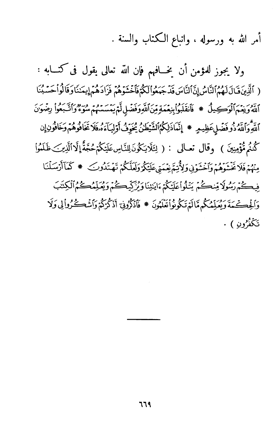 أَمَرَ اللَّهُ بِهِ وَرَسُولُهُ وَاتِّبَاعِ الْكِتَابِ وَالسُّنَّةِ وَلَا يَجُوزُ لِلْمُؤْمِنِ أَنْ يَخَافَهُمْ فَإِنَّ اللَّهَ تَعَالَى يَقُولُ فِي كِتَابِهِ: {الَّذِينَ قَالَ لَهُمُ النَّاسُ إنَّ النَّاسَ قَدْ جَمَعُوا لَكُمْ فَاخْشَوْهُمْ فَزَادَهُمْ إيمَانًا وَقَالُوا حَسْبُنَا اللَّهُ وَنِعْمَ الْوَكِيلُ} {فَانْقَلَبُوا بِنِعْمَةٍ مِنَ اللَّهِ وَفَضْلٍ لَمْ يَمْسَسْهُمْ سُوءٌ وَاتَّبَعُوا رِضْوَانَ اللَّهِ وَاللَّهُ ذُو فَضْلٍ عَظِيمٍ} {إنَّمَا ذَلِكُمُ الشَّيْطَانُ يُخَوِّفُ أَوْلِيَاءَهُ فَلَا تَخَافُوهُمْ وَخَافُونِ إنْ كُنْتُمْ مُؤْمِنِينَ} وَقَالَ تَعَالَى: {لِئَلَّا يَكُونَ لِلنَّاسِ عَلَيْكُمْ حُجَّةٌ إلَّا الَّذِينَ ظَلَمُوا مِنْهُمْ فَلَا تَخْشَوْهُمْ وَاخْشَوْنِي وَلِأُتِمَّ نِعْمَتِي عَلَيْكُمْ وَلَعَلَّكُمْ تَهْتَدُونَ} {كَمَا أَرْسَلْنَا فِيكُمْ رَسُولًا مِنْكُمْ يَتْلُو عَلَيْكُمْ آيَاتِنَا وَيُزَكِّيكُمْ وَيُعَلِّمُكُمُ الْكِتَابَ وَالْحِكْمَةَ وَيُعَلِّمُكُمْ مَا لَمْ تَكُونُوا تَعْلَمُونَ} {فَاذْكُرُونِي أَذْكُرْكُمْ وَاشْكُرُوا لِي وَلَا تَكْفُرُونِ} .