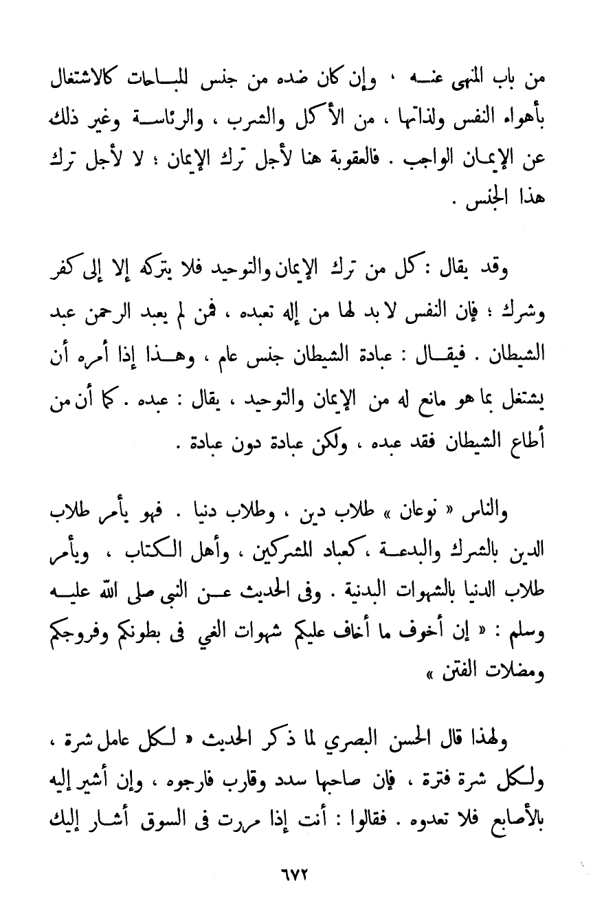 مِنْ بَابِ الْمَنْهِيِّ عَنْهُ وَإِنْ كَانَ ضِدُّهُ مِنْ جِنْسِ الْمُبَاحَاتِ كَالِاشْتِغَالِ بِأَهْوَاءِ النَّفْسِ وَلَذَّاتِهَا مِنْ الْأَكْلِ وَالشُّرْبِ وَالرِّئَاسَةِ وَغَيْرِ ذَلِكَ عَنْ الْإِيمَانِ الْوَاجِبِ. فَالْعُقُوبَةُ هُنَا لِأَجْلِ تَرْكِ الْإِيمَانِ؛ لَا لِأَجْلِ تَرْكِ هَذَا الْجِنْسِ. وَقَدْ يُقَالُ: كُلُّ مَنْ تَرَكَ الْإِيمَانَ وَالتَّوْحِيدَ فَلَا يَتْرُكُهُ إلَّا إلَى كُفْرٍ وَشِرْكٍ؛ فَإِنَّ النَّفْسَ لَا بُدَّ لَهَا مِنْ إلَهٍ تَعْبُدُهُ فَمَنْ لَمْ يَعْبُدْ الرَّحْمَنَ عَبَدَ الشَّيْطَانَ. فَيُقَالُ: عِبَادَةُ الشَّيْطَانِ جِنْسٌ عَامٌّ وَهَذَا إذَا أَمَرَهُ أَنْ يَشْتَغِلَ بِمَا هُوَ مَانِعٌ لَهُ مِنْ الْإِيمَانِ وَالتَّوْحِيدِ يُقَالُ: عَبَدَهُ. كَمَا أَنَّ مَنْ أَطَاعَ الشَّيْطَانَ فَقَدْ عَبَدَهُ وَلَكِنْ عِبَادَةٌ دُونَ عِبَادَةٍ. وَالنَّاسُ " نَوْعَانِ " طُلَّابُ دِينٍ وَطُلَّابُ دُنْيَا. فَهُوَ يَأْمُرُ طُلَّابَ الدِّينِ بِالشِّرْكِ وَالْبِدْعَةِ كَعُبَّادِ الْمُشْرِكِينَ وَأَهْلِ الْكِتَابِ وَيَأْمُرُ طُلَّابَ الدُّنْيَا بِالشَّهَوَاتِ الْبَدَنِيَّةِ. وَفِي الْحَدِيثِ عَنْ النَّبِيِّ صَلَّى اللَّهُ عَلَيْهِ وَسَلَّمَ {إنَّ أَخْوَفَ مَا أَخَافُ عَلَيْكُمْ شَهَوَاتِ الْغَيِّ فِي بُطُونِكُمْ وَفُرُوجِكُمْ وَمُضِلَّاتِ الْفِتَنِ} وَلِهَذَا قَالَ الْحَسَنُ الْبَصْرِيُّ لَمَّا ذَكَرَ الْحَدِيثَ " لِكُلِّ عَامِلٍ شِرَّةٌ وَلِكُلِّ شِرَّةٍ فَتْرَةٌ فَإِنَّ صَاحِبَهَا سَدَّدَ وَقَارَبَ فَارْجُوهُ وَإِنْ أُشِيرَ إلَيْهِ بِالْأَصَابِعِ فَلَا تَعُدُّوهُ. فَقَالُوا: أَنْتَ إذَا مَرَرْت فِي السُّوقِ أَشَارَ إلَيْك