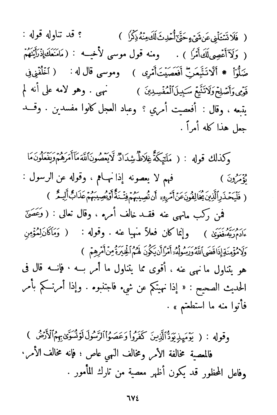 {فَلَا تَسْأَلْنِي عَنْ شَيْءٍ حَتَّى أُحْدِثَ لَكَ مِنْهُ ذِكْرًا} ؟ قَدْ تَنَاوَلَهُ قَوْلُهُ: {وَلَا أَعْصِي لَكَ أَمْرًا} . وَمِنْهُ قَوْلُ مُوسَى لِأَخِيهِ: {مَا مَنَعَكَ إذْ رَأَيْتَهُمْ ضَلُّوا} {أَلَّا تَتَّبِعَنِي أَفَعَصَيْتَ أَمْرِي} وَمُوسَى قَالَ لَهُ: {اخْلُفْنِي فِي قَوْمِي وَأَصْلِحْ وَلَا تَتَّبِعْ سَبِيلَ الْمُفْسِدِينَ} نَهْيٌ. وَهُوَ لَامَهُ عَلَى أَنَّهُ لَمْ يَتَّبِعْهُ وَقَالَ: أَفَعَصَيْت أَمْرِي؟ وَعُبَّادُ الْعِجْلِ كَانُوا مُفْسِدِينَ. وَقَدْ جَعَلَ هَذَا كُلَّهُ أَمْرًا. وَكَذَلِكَ قَوْلُهُ: {مَلَائِكَةٌ غِلَاظٌ شِدَادٌ لَا يَعْصُونَ اللَّهَ مَا أَمَرَهُمْ وَيَفْعَلُونَ مَا يُؤْمَرُونَ} فَهُمْ لَا يَعْصُونَهُ إذَا نَهَاهُمْ وَقَوْلُهُ عَنْ الرَّسُولِ: {فَلْيَحْذَرِ الَّذِينَ يُخَالِفُونَ عَنْ أَمْرِهِ أَنْ تُصِيبَهُمْ فِتْنَةٌ أَوْ يُصِيبَهُمْ عَذَابٌ أَلِيمٌ} فَمَنْ رَكِبَ مَا نُهِيَ عَنْهُ فَقَدْ خَالَفَ أَمْرَهُ وَقَالَ تَعَالَى: {وَعَصَى آدَمُ رَبَّهُ فَغَوَى} وَإِنَّمَا كَانَ فِعْلًا مَنْهِيًّا عَنْهُ. وَقَوْلُهُ: {وَمَا كَانَ لِمُؤْمِنٍ وَلَا مُؤْمِنَةٍ إذَا قَضَى اللَّهُ وَرَسُولُهُ أَمْرًا أَنْ يَكُونَ لَهُمُ الْخِيَرَةُ مِنْ أَمْرِهِمْ} هُوَ يَتَنَاوَلُ مَا نُهِيَ عَنْهُ أَقْوَى مِمَّا يَتَنَاوَلُ مَا أُمِرَ بِهِ فَإِنَّهُ قَالَ فِي الْحَدِيثِ الصَّحِيحِ: {إذَا نَهَيْتُكُمْ عَنْ شَيْءٍ فَاجْتَنِبُوهُ. وَإِذَا أَمَرْتُكُمْ بِأَمْرِ فَأْتُوا مِنْهُ مَا اسْتَطَعْتُمْ} ". وَقَوْلُهُ: {يَوْمَئِذٍ يَوَدُّ الَّذِينَ كَفَرُوا وَعَصَوُا الرَّسُولَ لَوْ تُسَوَّى بِهِمُ الْأَرْضُ} فَالْمَعْصِيَةُ مُخَالِفَةُ الْأَمْرِ وَمُخَالِفُ النَّهْيِ عَاصٍ؛ فَإِنَّهُ مُخَالِفُ الْأَمْرِ وَفَاعِلُ الْمَحْظُورِ قَدْ يَكُونُ أَظْهَرَ مَعْصِيَةً مِنْ تَارِكِ الْمَأْمُورِ.