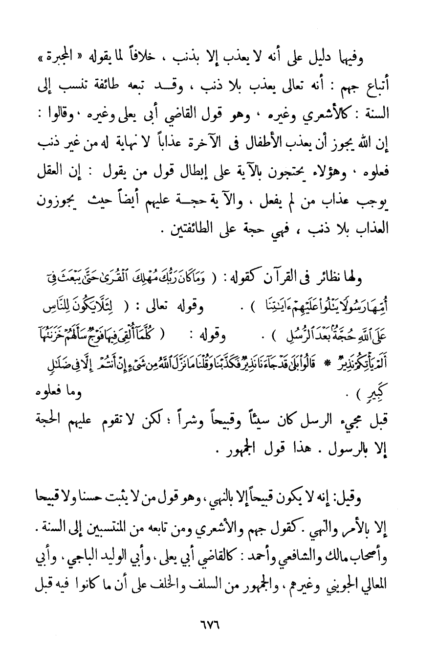 وَفِيهِمَا دَلِيلٌ عَلَى أَنَّهُ لَا يُعَذِّبُ إلَّا بِذَنْبِ خِلَافًا لِمَا يَقُولُهُ " الْمُجَبِّرَةُ " أَتْبَاعُ جَهْمٍ: أَنَّهُ تَعَالَى يُعَذِّبُ بِلَا ذَنْبٍ وَقَدْ تَبِعَهُ طَائِفَةٌ تُنْسَبُ إلَى السُّنَّةِ: كَالْأَشْعَرِيِّ وَغَيْرِهِ وَهُوَ قَوْلُ الْقَاضِي أَبِي يَعْلَى وَغَيْرِهِ وَقَالُوا: إنَّ اللَّهَ يَجُوزُ أَنْ يُعَذِّبَ الْأَطْفَالَ فِي الْآخِرَةِ عَذَابًا لَا نِهَايَةَ لَهُ مِنْ غَيْرِ ذَنْبٍ فَعَلُوهُ وَهَؤُلَاءِ يَحْتَجُّونَ بِالْآيَةِ عَلَى إبْطَالِ قَوْلِ مَنْ يَقُولُ: إنَّ الْعَقْلَ يُوجِبُ عَذَابَ مَنْ لَمْ يَفْعَلْ وَالْآيَةُ حُجَّةٌ عَلَيْهِمْ أَيْضًا حَيْثُ يُجَوِّزُونَ الْعَذَابَ بِلَا ذَنْبٍ فَهِيَ حُجَّةٌ عَلَى الطَّائِفَتَيْنِ. وَلَهَا نَظَائِرُ فِي الْقُرْآنِ كَقَوْلِهِ: {وَمَا كَانَ رَبُّكَ مُهْلِكَ الْقُرَى حَتَّى يَبْعَثَ فِي أُمِّهَا رَسُولًا يَتْلُو عَلَيْهِمْ آيَاتِنَا} . وقَوْله تَعَالَى {لِئَلَّا يَكُونَ لِلنَّاسِ عَلَى اللَّهِ حُجَّةٌ بَعْدَ الرُّسُلِ} . وَقَوْلُهُ: {كُلَّمَا أُلْقِيَ فِيهَا فَوْجٌ سَأَلَهُمْ خَزَنَتُهَا أَلَمْ يَأْتِكُمْ نَذِيرٌ} {قَالُوا بَلَى قَدْ جَاءَنَا نَذِيرٌ فَكَذَّبْنَا وَقُلْنَا مَا نَزَّلَ اللَّهُ مِنْ شَيْءٍ إنْ أَنْتُمْ إلَّا فِي ضَلَالٍ كَبِيرٍ} . وَمَا فَعَلُوهُ قَبْلَ مَجِيءِ الرُّسُلِ كَانَ سَيِّئًا وَقَبِيحًا وَشَرًّا؛ لَكِنْ لَا تَقُومُ عَلَيْهِمْ الْحُجَّةُ إلَّا بِالرَّسُولِ. هَذَا قَوْلُ الْجُمْهُورِ. وَقِيلَ: إنَّهُ لَا يَكُونُ قَبِيحًا إلَّا بِالنَّهْيِ وَهُوَ قَوْلُ مَنْ لَا يُثْبِتُ حَسَنًا وَلَا قَبِيحًا إلَّا بِالْأَمْرِ وَالنَّهْيِ. كَقَوْلِ جَهْمٍ وَالْأَشْعَرِيِّ وَمَنْ تَابَعَهُ مِنْ الْمُنْتَسِبِينَ إلَى السُّنَّةِ. وَأَصْحَابِ مَالِكٍ وَالشَّافِعِيِّ وَأَحْمَد: كَالْقَاضِي أَبِي يَعْلَى وَأَبِي الْوَلِيدِ الباجي وَأَبِي الْمَعَالِي الجُوَيْنِي وَغَيْرِهِمْ وَالْجُمْهُورِ مِنْ السَّلَفِ وَالْخَلَفِ عَلَى أَنَّ مَا كَانُوا فِيهِ قَبْلَ