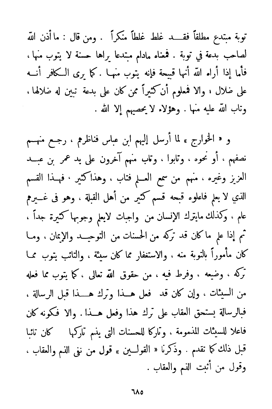 تَوْبَةُ مُبْتَدِعٍ مُطْلَقًا فَقَدْ غَلِطَ غَلَطًا مُنْكَرًا. وَمَنْ قَالَ: مَا أَذِنَ اللَّهُ لِصَاحِبِ بِدْعَةٍ فِي تَوْبَةٍ. فَمَعْنَاهُ مَا دَامَ مُبْتَدِعًا يَرَاهَا حَسَنَةً لَا يَتُوبُ مِنْهَا فَأَمَّا إذَا أَرَاهُ اللَّهُ أَنَّهَا قَبِيحَةٌ فَإِنَّهُ يَتُوبُ مِنْهَا كَمَا يَرَى الْكَافِرُ أَنَّهُ عَلَى ضَلَالٍ؛ وَإِلَّا فَمَعْلُومٌ أَنَّ كَثِيرًا مِمَّنْ كَانَ عَلَى بِدْعَةٍ تَبَيَّنَ لَهُ ضَلَالُهَا وَتَابَ اللَّهُ عَلَيْهِ مِنْهَا. وَهَؤُلَاءِ لَا يُحْصِيهِمْ إلَّا اللَّهُ. وَ " الْخَوَارِجُ " لَمَّا أُرْسِلَ إلَيْهِمْ ابْنُ عَبَّاسٍ فَنَاظَرَهُمْ رَجَعَ مِنْهُمْ نِصْفُهُمْ أَوْ نَحْوُهُ وَتَابُوا وَتَابَ مِنْهُمْ آخَرُونَ عَلَى يَدِ عُمَرَ بْنِ عَبْدِ الْعَزِيزِ وَغَيْرِهِ مِنْهُمْ مَنْ سَمِعَ الْعِلْمَ فَتَابَ وَهَذَا كَثِيرٌ فَهَذَا الْقِسْمُ الَّذِي لَا يَعْلَمُ فَاعِلُوهُ قُبْحَهُ قِسْمٌ كَثِيرٌ مِنْ أَهْلِ الْقِبْلَةِ وَهُوَ فِي غَيْرِهِمْ عَامٌّ وَكَذَلِكَ مَا يَتْرُكُ الْإِنْسَانُ مِنْ وَاجِبَاتٍ لَا يَعْلَمُ وُجُوبَهَا كَثِيرَةً جِدًّا ثُمَّ إذَا عَلِمَ مَا كَانَ قَدْ تَرَكَهُ مِنْ الْحَسَنَاتِ مِنْ التَّوْحِيدِ وَالْإِيمَانِ وَمَا كَانَ مَأْمُورًا بِالتَّوْبَةِ مِنْهُ وَالِاسْتِغْفَارِ مِمَّا كَانَ سَيِّئَةً وَالتَّائِبُ يَتُوبُ مِمَّا تَرَكَهُ وَضَيَّعَهُ وَفَرَّطَ فِيهِ مِنْ حُقُوقِ اللَّهِ تَعَالَى كَمَا يَتُوبُ مِمَّا فَعَلَهُ مِنْ السَّيِّئَاتِ وَإِنْ كَانَ قَدْ فَعَلَ هَذَا وَتَرَكَ هَذَا قَبْلَ الرِّسَالَةِ فَبِالرِّسَالَةِ يَسْتَحِقُّ الْعِقَابَ عَلَى تَرْكِ هَذَا وَفِعْلِ هَذَا. وَإِلَّا فَكَوْنُهُ كَانَ فَاعِلًا لِلسَّيِّئَاتِ الْمَذْمُومَةِ وَتَارِكًا لِلْحَسَنَاتِ الَّتِي يُذَمُّ تَارِكُهَا كَانَ تَائِبًا قَبْلَ ذَلِكَ كَمَا تَقَدَّمَ. وَذَكَرْنَا " الْقَوْلَيْنِ " قَوْلَ مَنْ نَفَى الذَّمَّ وَالْعِقَابَ وَقَوْلَ مَنْ أَثْبَتَ الذَّمَّ وَالْعِقَابَ.