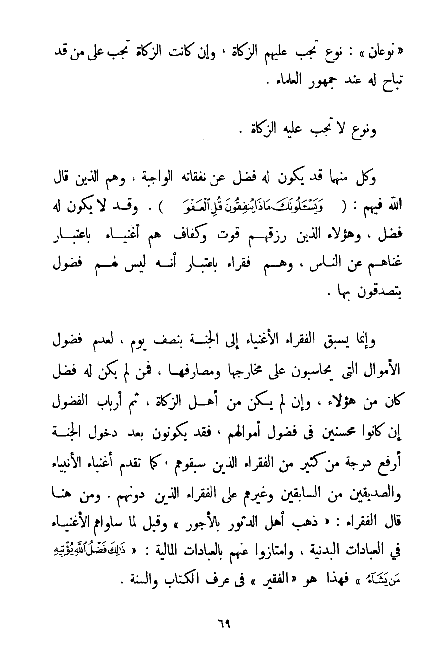 " نَوْعَانِ ": نَوْعٌ تَجِبُ عَلَيْهِمْ الزَّكَاةُ وَإِنْ كَانَتْ الزَّكَاةُ تَجِبُ عَلَى مَنْ قَدْ تُبَاحُ لَهُ عِنْدَ جُمْهُورِ الْعُلَمَاءِ. وَنَوْعٌ لَا تَجِبُ عَلَيْهِ الزَّكَاةُ. وَكُلٌّ مِنْهُمَا قَدْ يَكُونُ لَهُ فَضْلٌ عَنْ نَفَقَاتِهِ الْوَاجِبَةِ وَهُمْ الَّذِينَ قَالَ اللَّهُ فِيهِمْ: {وَيَسْأَلُونَكَ مَاذَا يُنْفِقُونَ قُلِ الْعَفْوَ} . وَقَدْ لَا يَكُونُ لَهُ فَضْلٌ وَهَؤُلَاءِ الَّذِينَ رِزْقُهُمْ قُوتٌ وَكَفَافٌ هُمْ أَغْنِيَاءُ بِاعْتِبَارِ غِنَاهُمْ عَنْ النَّاسِ وَهُمْ فُقَرَاءُ بِاعْتِبَارِ أَنَّهُ لَيْسَ لَهُمْ فُضُولٌ يَتَصَدَّقُونَ بِهَا.