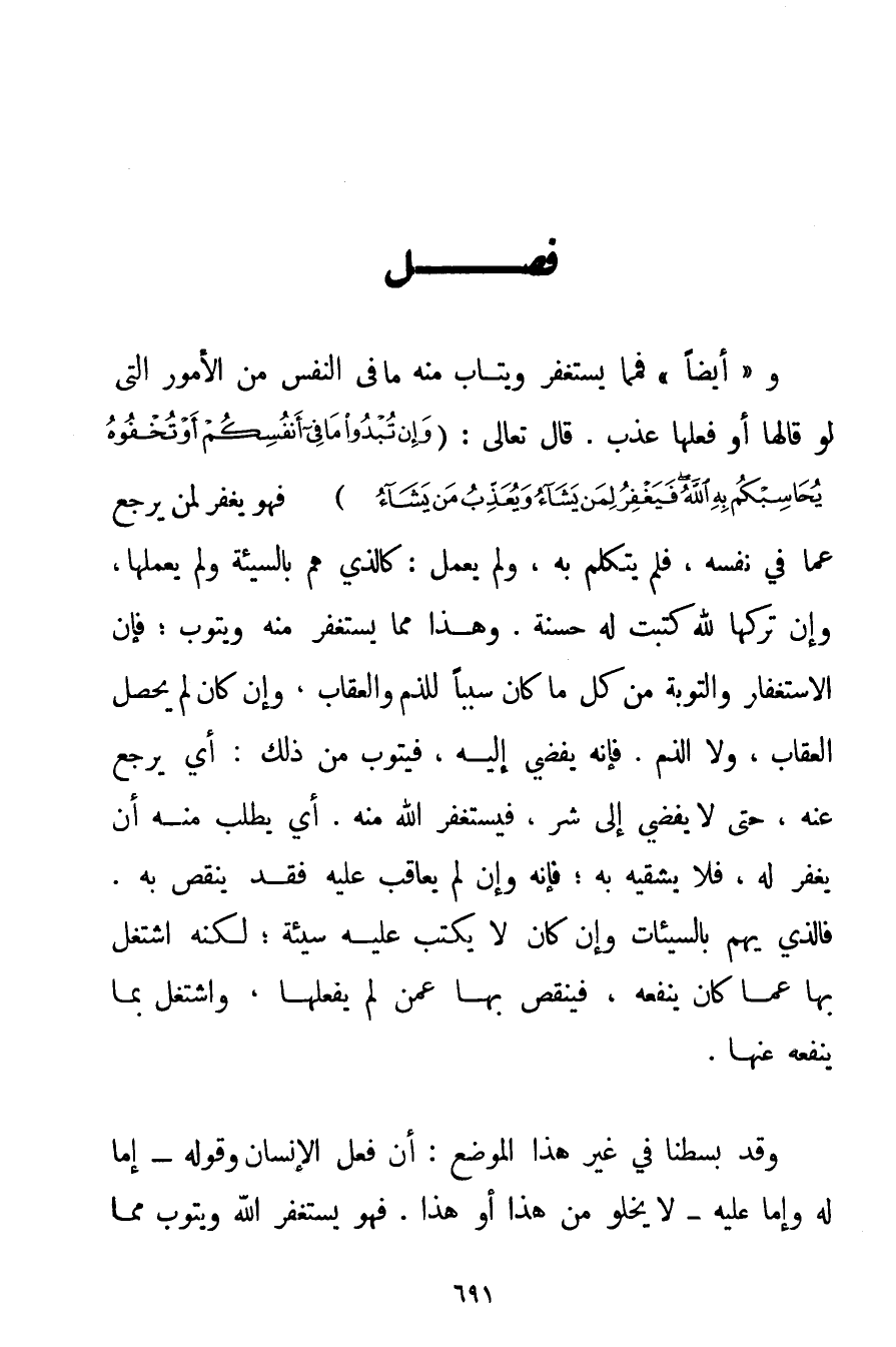 وَ " أَيْضًا " فَمِمَّا يَسْتَغْفِرُ وَيُتَابُ مِنْهُ مَا فِي النَّفْسِ مِنْ الْأُمُورِ الَّتِي لَوْ قَالَهَا أَوْ فَعَلَهَا عُذِّبَ. قَالَ تَعَالَى: {وَإِنْ تُبْدُوا مَا فِي أَنْفُسِكُمْ أَوْ تُخْفُوهُ يُحَاسِبْكُمْ بِهِ اللَّهُ فَيَغْفِرُ لِمَنْ يَشَاءُ وَيُعَذِّبُ مَنْ يَشَاءُ} فَهُوَ يَغْفِرُ لِمَنْ يَرْجِعُ عَمَّا فِي نَفْسِهِ فَلَمْ يَتَكَلَّمْ بِهِ وَلَمْ يَعْمَلْ: كَاَلَّذِي هَمَّ بِالسَّيِّئَةِ وَلَمْ يَعْمَلْهَا وَإِنْ تَرَكَهَا لِلَّهِ كُتِبَتْ لَهُ حَسَنَةٌ. وَهَذَا مِمَّا يُسْتَغْفَرُ مِنْهُ وَيَتُوبُ؛ فَإِنَّ الِاسْتِغْفَارَ وَالتَّوْبَةَ مِنْ كُلِّ مَا كَانَ سَبَبًا لِلذَّمِّ وَالْعِقَابِ وَإِنْ كَانَ لَمْ يَحْصُلْ الْعِقَابُ وَلَا الذَّمُّ. فَإِنَّهُ يُفْضِي إلَيْهِ فَيَتُوبُ مِنْ ذَلِكَ: أَيْ يَرْجِعُ عَنْهُ حَتَّى لَا يُفْضِيَ إلَى شَرٍّ فَيَسْتَغْفِرُ اللَّهَ مِنْهُ. أَيْ يَطْلُبُ مِنْهُ أَنْ يَغْفِرَ لَهُ فَلَا يُشْقِيه بِهِ؛ فَإِنَّهُ وَإِنْ لَمْ يُعَاقَبْ عَلَيْهِ فَقَدْ يَنْقُصُ بِهِ. فَاَلَّذِي يَهُمُّ بِالسَّيِّئَاتِ وَإِنْ كَانَ لَا يُكْتَبُ عَلَيْهِ سَيِّئَةٌ؛ لَكِنَّهُ اشْتَغَلَ بِهَا عَمَّا كَانَ يَنْفَعُهُ فَيَنْقُصُ بِهَا عَمَّنْ لَمْ يَفْعَلْهَا وَاشْتَغَلَ بِمَا يَنْفَعُهُ عَنْهَا. وَقَدْ بَسَطْنَا فِي غَيْرِ هَذَا الْمَوْضِعِ: أَنَّ فِعْلَ الْإِنْسَانِ وَقَوْلَهُ - إمَّا لَهُ وَإِمَّا عَلَيْهِ - لَا يَخْلُو مِنْ هَذَا أَوْ هَذَا. فَهُوَ يَسْتَغْفِرُ اللَّهَ وَيَتُوبُ مِمَّا
