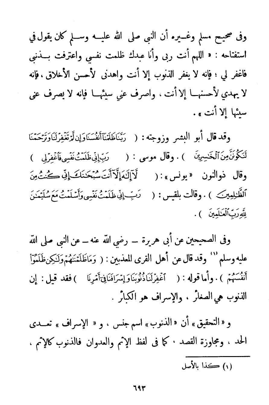 وَفِي صَحِيحِ مُسْلِمٍ وَغَيْرِهِ {أَنَّ النَّبِيَّ صَلَّى اللَّهُ عَلَيْهِ وَسَلَّمَ كَانَ يَقُولُ فِي اسْتِفْتَاحِهِ: اللَّهُمَّ أَنْتَ رَبِّي وَأَنَا عَبْدُك ظَلَمْت نَفْسِي وَاعْتَرَفْت بِذَنْبِي فَاغْفِرْ لِي؛ فَإِنَّهُ لَا يَغْفِرُ الذُّنُوبَ إلَّا أَنْتَ وَاهْدِنِي لِأَحْسَنِ الْأَخْلَاقِ فَإِنَّهُ لَا يَهْدِي لِأَحْسَنِهَا إلَّا أَنْتَ وَاصْرِفْ عَنِّي سَيِّئَهَا فَإِنَّهُ لَا يَصْرِفُ عَنِّي سَيِّئَهَا إلَّا أَنْتَ} ". وَقَدْ قَالَ أَبُو الْبِشْرِ وَزَوْجَتُهُ: {رَبَّنَا ظَلَمْنَا أَنْفُسَنَا وَإِنْ لَمْ تَغْفِرْ لَنَا وَتَرْحَمْنَا لَنَكُونَنَّ مِنَ الْخَاسِرِينَ} . وَقَالَ مُوسَى: {رَبِّ إنِّي ظَلَمْتُ نَفْسِي فَاغْفِرْ لِي} وَقَالَ ذُو النُّونِ " يُونُسُ ": {لَا إلَهَ إلَّا أَنْتَ سُبْحَانَكَ إنِّي كُنْتُ مِنَ الظَّالِمِينَ} . وَقَالَتْ بلقيس: {رَبِّ إنِّي ظَلَمْتُ نَفْسِي وَأَسْلَمْتُ مَعَ سُلَيْمَانَ لِلَّهِ رَبِّ الْعَالَمِينَ} . وَفِي الصَّحِيحَيْنِ عَنْ أَبِي هُرَيْرَةَ - رَضِيَ اللَّهُ عَنْهُ - عَنْ النَّبِيِّ صَلَّى اللَّهُ عَلَيْهِ وَسَلَّمَ (1) وَقَدْ قَالَ عَنْ أَهْلِ الْقُرَى الْمُعَذَّبِينَ: {وَمَا ظَلَمْنَاهُمْ وَلَكِنْ ظَلَمُوا أَنْفُسَهُمْ} . وَأَمَّا قَوْلُهُ: {اغْفِرْ لَنَا ذُنُوبَنَا وَإِسْرَافَنَا فِي أَمْرِنَا} فَقَدْ قِيلَ: إنَّ الذُّنُوبَ هِيَ الصَّغَائِرُ وَالْإِسْرَافُ هُوَ الْكَبَائِرُ. وَ " التَّحْقِيقُ " أَنَّ " الذُّنُوبَ " اسْمُ جِنْسٍ وَ " الْإِسْرَافَ " تَعَدِّي الْحَدِّ وَمُجَاوَزَةُ الْقَصْدِ كَمَا فِي لَفْظِ الْإِثْمِ وَالْعُدْوَانِ فَالذُّنُوبُ كَالْإِثْمِ