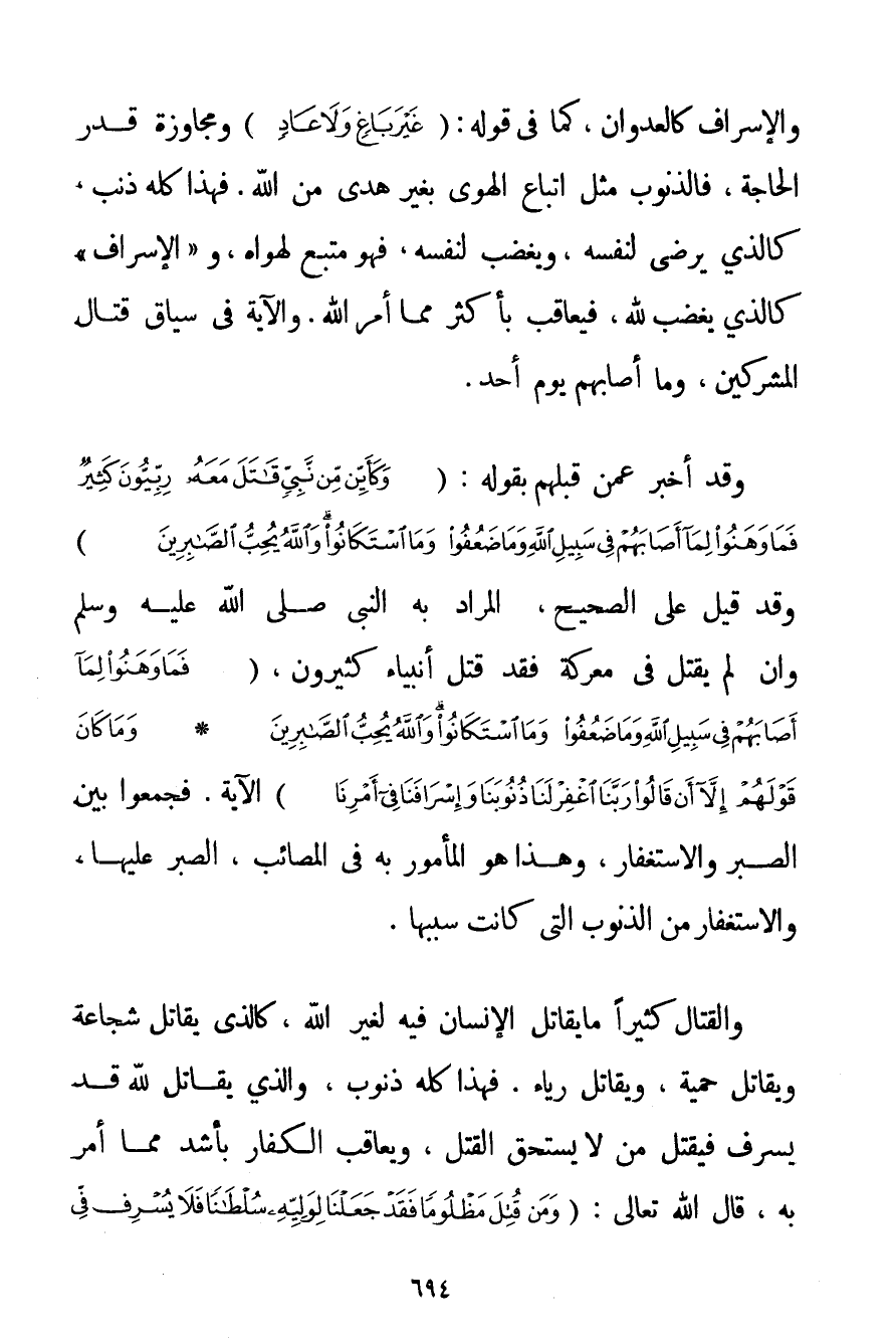 وَالْإِسْرَافُ كَالْعُدْوَانِ كَمَا فِي قَوْلِهِ: {غَيْرَ بَاغٍ وَلَا عَادٍ} وَمُجَاوَزَةُ قَدْرِ الْحَاجَةِ فَالذُّنُوبُ مِثْلُ اتِّبَاعِ الْهَوَى بِغَيْرِ هُدًى مِنْ اللَّهِ. فَهَذَا كُلُّهُ ذَنْبٌ كَاَلَّذِي يَرْضَى لِنَفْسِهِ وَيَغْضَبُ لِنَفْسِهِ فَهُوَ مُتَّبِعٌ لِهَوَاهُ وَ " الْإِسْرَافُ " كَاَلَّذِي يَغْضَبُ لِلَّهِ فَيُعَاقَبُ بِأَكْثَرَ مِمَّا أَمَرَ اللَّهُ. وَالْآيَةُ فِي سِيَاقِ قِتَالِ الْمُشْرِكِينَ وَمَا أَصَابَهُمْ يَوْمَ أُحُدٍ. وَقَدْ أَخْبَرَ عَمَّنْ قَبْلَهُمْ بِقَوْلِهِ: {وَكَأَيِّنْ مِنْ نَبِيٍّ قَاتَلَ مَعَهُ رِبِّيُّونَ كَثِيرٌ فَمَا وَهَنُوا لِمَا أَصَابَهُمْ فِي سَبِيلِ اللَّهِ وَمَا ضَعُفُوا وَمَا اسْتَكَانُوا وَاللَّهُ يُحِبُّ الصَّابِرِينَ} وَقَدْ قِيلَ عَلَى الصَّحِيحِ الْمُرَادُ بِهِ النَّبِيُّ صَلَّى اللَّهُ عَلَيْهِ وَسَلَّمَ وَإِنْ لَمْ يُقْتَلْ فِي مَعْرَكَةٍ فَقَدْ قُتِلَ أَنْبِيَاءُ كَثِيرُونَ {فَمَا وَهَنُوا لِمَا أَصَابَهُمْ فِي سَبِيلِ اللَّهِ وَمَا ضَعُفُوا وَمَا اسْتَكَانُوا وَاللَّهُ يُحِبُّ الصَّابِرِينَ} {وَمَا كَانَ قَوْلَهُمْ إلَّا أَنْ قَالُوا رَبَّنَا اغْفِرْ لَنَا ذُنُوبَنَا وَإِسْرَافَنَا فِي أَمْرِنَا} الْآيَةَ. فَجَمَعُوا بَيْنَ الصَّبْرِ وَالِاسْتِغْفَارِ وَهَذَا هُوَ الْمَأْمُورُ بِهِ فِي الْمَصَائِبِ الصَّبْرُ عَلَيْهَا وَالِاسْتِغْفَارُ مِنْ الذُّنُوبِ الَّتِي كَانَتْ سَبَبَهَا. وَالْقِتَالُ كَثِيرًا مَا يُقَاتِلُ الْإِنْسَانُ فِيهِ لِغَيْرِ اللَّهِ كَاَلَّذِي يُقَاتِلُ شَجَاعَةً وَيُقَاتِلُ حَمِيَّةً وَيُقَاتِلُ رِيَاءً. فَهَذَا كُلُّهُ ذُنُوبٌ وَاَلَّذِي يُقَاتِلُ لِلَّهِ قَدْ يُسْرِفُ فَيَقْتُلُ مَنْ لَا يَسْتَحِقُّ الْقَتْلَ وَيُعَاقِبُ الْكُفَّارَ بِأَشَدِّ مِمَّا أُمِرَ بِهِ قَالَ اللَّهُ تَعَالَى: {وَمَنْ قُتِلَ مَظْلُومًا فَقَدْ جَعَلْنَا لِوَلِيِّهِ سُلْطَانًا فَلَا