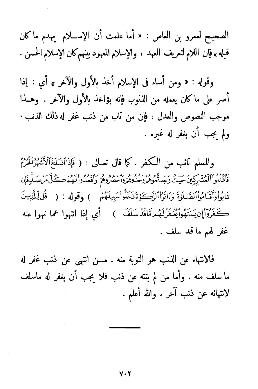 الصَّحِيحِ لِعَمْرِو بْنِ العاص: {أَمَا عَلِمْت أَنَّ الْإِسْلَامَ يَهْدِمُ مَا كَانَ قَبْلَهُ} " فَإِنَّ اللَّامَ لِتَعْرِيفِ الْعَهْدِ وَالْإِسْلَامُ الْمَعْهُودُ بَيْنَهُمْ كَانَ الْإِسْلَامَ الْحَسَنَ. وَقَوْلُهُ: " {وَمَنْ أَسَاءَ فِي الْإِسْلَامِ أُخِذَ بِالْأَوَّلِ وَالْآخَرِ} " أَيْ: إذَا أَصَرَّ عَلَى مَا كَانَ يَعْمَلُهُ مِنْ الذُّنُوبِ فَإِنَّهُ يُؤَاخَذُ بِالْأَوَّلِ وَالْآخَرِ. وَهَذَا مُوجَبُ النُّصُوصِ وَالْعَدْلِ فَإِنَّ مَنْ تَابَ مِنْ ذَنْبٍ غُفِرَ لَهُ ذَلِكَ الذَّنْبُ وَلَمْ يَجِبْ أَنْ يُغْفَرَ لَهُ غَيْرُهُ. وَالْمُسْلِمُ تَائِبٌ مِنْ الْكُفْرِ كَمَا قَالَ تَعَالَى: {فَإِذَا انْسَلَخَ الْأَشْهُرُ الْحُرُمُ فَاقْتُلُوا الْمُشْرِكِينَ حَيْثُ وَجَدْتُمُوهُمْ وَخُذُوهُمْ وَاحْصُرُوهُمْ وَاقْعُدُوا لَهُمْ كُلَّ مَرْصَدٍ فَإِنْ تَابُوا وَأَقَامُوا الصَّلَاةَ وَآتَوُا الزَّكَاةَ فَخَلُّوا سَبِيلَهُمْ} وَقَوْلُهُ: {قُلْ لِلَّذِينَ كَفَرُوا إنْ يَنْتَهُوا يُغْفَرْ لَهُمْ مَا قَدْ سَلَفَ} أَيْ إذَا انْتَهَوْا عَمَّا نُهُوا عَنْهُ غُفِرَ لَهُمْ مَا قَدْ سَلَفَ. فَالِانْتِهَاءُ عَنْ الذَّنْبِ هُوَ التَّوْبَةُ مِنْهُ. مَنْ انْتَهَى عَنْ ذَنْبٍ غُفِرَ لَهُ مَا سَلَفَ مِنْهُ. وَأَمَّا مَنْ لَمْ يَنْتَهِ عَنْ ذَنْبٍ فَلَا يَجِبُ أَنْ يُغْفَرَ لَهُ مَا سَلَفَ لِانْتِهَائِهِ عَنْ ذَنْبٍ آخَرَ. وَاَللَّهُ أَعْلَمُ.