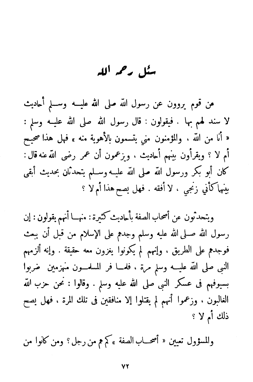 عَنْ قَوْمٍ يَرْوُونَ عَنْ رَسُولِ اللَّهِ صَلَّى اللَّهُ عَلَيْهِ وَسَلَّمَ أَحَادِيثَ لَا سَنَدَ لَهُمْ بِهَا. فَيَقُولُونَ: قَالَ رَسُولُ اللَّهِ صَلَّى اللَّهُ عَلَيْهِ وَسَلَّمَ {أَنَا مِنْ اللَّهِ وَالْمُؤْمِنُونَ مِنِّي يَتَّسِمُونَ بِالْأَهْوِيَةِ مِنْهُ} فَهَلْ هَذَا صَحِيحٌ أَمْ لَا؟ وَيَقْرَءُونَ بَيْنَهُمْ أَحَادِيثَ وَيَزْعُمُونَ أَنَّ عُمَرَ رَضِيَ اللَّهُ عَنْهُ قَالَ: كَانَ أَبُو بَكْرٍ وَرَسُولُ اللَّهِ صَلَّى اللَّهُ عَلَيْهِ وَسَلَّمَ يَتَحَدَّثَانِ بِحَدِيثِ أَبْقَى بَيْنِهِمَا كَأَنِّي زِنْجِيٌّ لَا أَفْقَهَ. فَهَلْ يَصِحُّ هَذَا أَمْ لَا؟ وَيَتَحَدَّثُونَ عَنْ أَصْحَابِ الصُّفَّةِ بِأَحَادِيثَ كَثِيرَةٍ: مِنْهَا أَنَّهُمْ يَقُولُونَ: إنَّ رَسُولَ اللَّهِ صَلَّى اللَّهُ عَلَيْهِ وَسَلَّمَ وَجَدَهُمْ عَلَى الْإِسْلَامِ مِنْ قَبْلِ أَنْ يُبْعَثَ فَوَجَدَهُمْ عَلَى الطَّرِيقِ وَإِنَّهُمْ لَمْ يَكُونُوا يَغْزُونَ مَعَهُ حَقِيقَةً. وَإِنَّهُ أَلْزَمَهُمْ النَّبِيُّ صَلَّى اللَّهُ عَلَيْهِ وَسَلَّمَ مَرَّةً فَلَمَّا فَرَّ الْمُسْلِمُونَ مُنْهَزِمِينَ ضَرَبُوا بِسُيُوفِهِمْ فِي عَسْكَرِ النَّبِيِّ صَلَّى اللَّهُ عَلَيْهِ وَسَلَّمَ. وَقَالُوا: نَحْنُ حِزْبُ اللَّهِ الْغَالِبُونَ وَزَعَمُوا أَنَّهُمْ لَمْ يَقْتُلُوا إلَّا مُنَافِقِينَ فِي تِلْكَ الْمَرَّةِ فَهَلْ يَصِحُّ ذَلِكَ أَمْ لَا؟ وَالْمَسْئُولُ تَعْيِينُ " أَصْحَابِ الصُّفَّةِ " كَمْ هُمْ مِنْ رَجُلٍ؟ وَمَنْ كَانُوا مِنْ