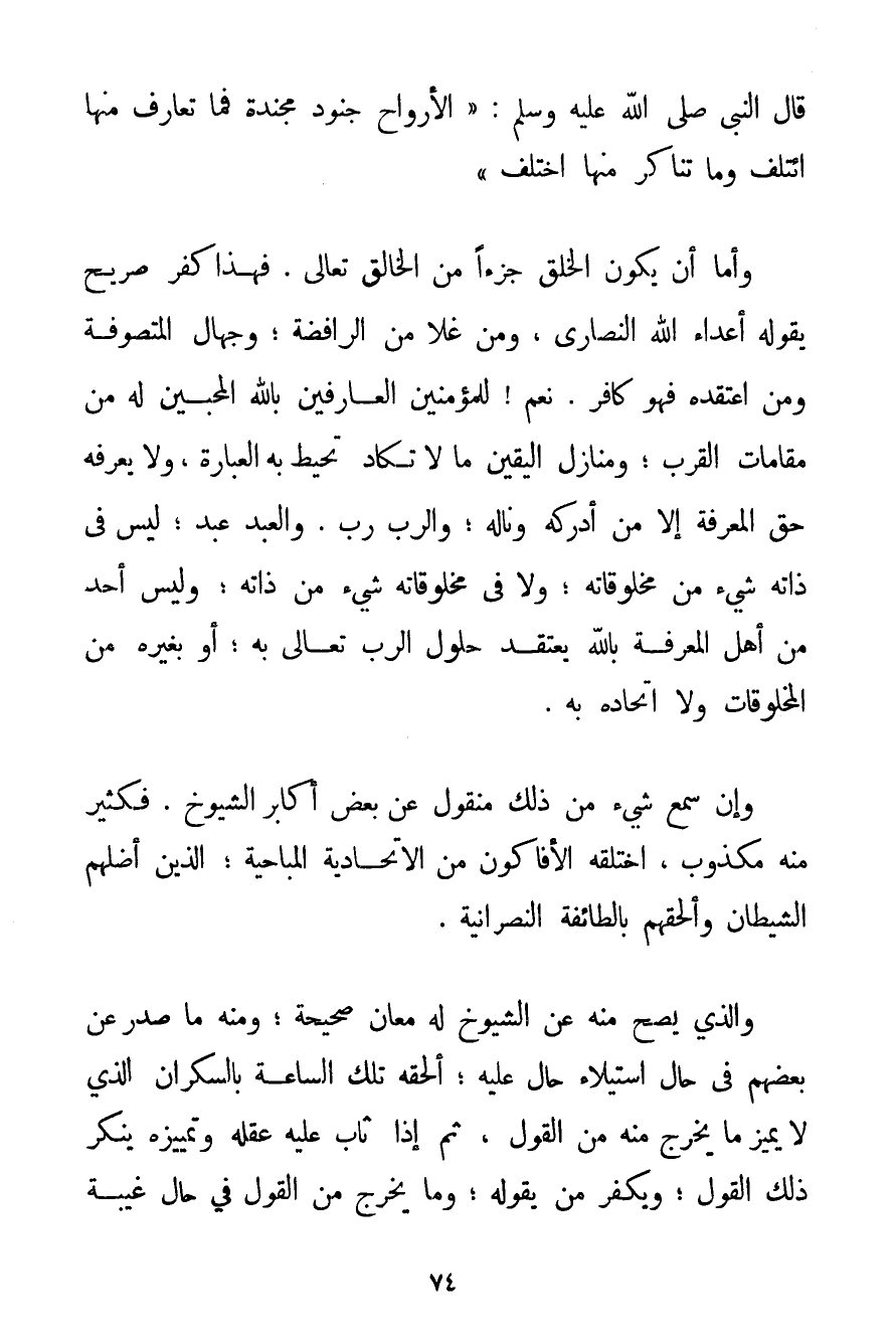قَالَ النَّبِيُّ صَلَّى اللَّهُ عَلَيْهِ وَسَلَّمَ {الْأَرْوَاحُ جُنُودٌ مُجَنَّدَةٌ فَمَا تَعَارَفَ مِنْهَا ائْتَلَفَ وَمَا تَنَاكَرَ مِنْهَا اخْتَلَفَ} وَأَمَّا أَنْ يَكُونَ الْخَلْقُ جُزْءًا مِنْ الْخَالِقِ تَعَالَى. فَهَذَا كُفْرٌ صَرِيحٌ يَقُولُهُ أَعْدَاءُ اللَّهِ النَّصَارَى وَمَنْ غَلَا مِنْ الرَّافِضَةِ؛ وَجُهَّالُ الْمُتَصَوِّفَةِ وَمَنْ اعْتَقَدَهُ فَهُوَ كَافِرٌ. نَعَمْ لِلْمُؤْمِنِينَ الْعَارِفِينَ بِاَللَّهِ الْمُحِبِّينَ لَهُ مِنْ مَقَامَاتِ الْقُرْبِ؛ وَمَنَازِلِ الْيَقِينِ مَا لَا تَكَادُ تُحِيطُ بِهِ الْعِبَارَةُ وَلَا يَعْرِفُهُ حَقَّ الْمَعْرِفَةِ إلَّا مَنْ أَدْرَكَهُ وَنَالَهُ؛ وَالرَّبُّ رَبٌّ. وَالْعَبْدُ عَبْدٌ. لَيْسَ فِي ذَاتِهِ شَيْءٌ مِنْ مَخْلُوقَاتِهِ؛ وَلَا فِي مَخْلُوقَاتِهِ شَيْءٌ مِنْ ذَاتِهِ: وَلَيْسَ أَحَدٌ مِنْ أَهْلِ الْمَعْرِفَةِ بِاَللَّهِ يَعْتَقِدُ حُلُولَ الرَّبِّ تَعَالَى بِهِ؛ أَوْ بِغَيْرِهِ مِنْ الْمَخْلُوقَاتِ وَلَا اتِّحَادَهُ بِهِ. وَإِنَّ سَمْعَ شَيْءٍ مِنْ ذَلِكَ مَنْقُولٌ عَنْ بَعْضِ أَكَابِرِ الشُّيُوخِ. فَكَثِيرٌ مِنْهُ مَكْذُوبٌ اخْتَلَقَهُ الْأَفَّاكُونَ مِنْ الِاتِّحَادِيَّةِ المباحية؛ الَّذِينَ أَضَلَّهُمْ الشَّيْطَانُ وَأَلْحَقَهُمْ بِالطَّائِفَةِ النَّصْرَانِيَّةِ. وَاَلَّذِي يَصِحُّ مِنْهُ عَنْ الشُّيُوخِ لَهُ مَعَانٍ صَحِيحَةٌ؛ وَمِنْهُ مَا صَدَرَ عَنْ بَعْضِهِمْ فِي حَالِ اسْتِيلَاءِ حَالٍ عَلَيْهِ؛ أَلْحَقَهُ تِلْكَ السَّاعَةَ بِالسَّكْرَانِ الَّذِي لَا يُمَيِّزُ مَا يَخْرُجُ مِنْهُ مِنْ الْقَوْلِ ثُمَّ إذَا ثَابَ عَلَيْهِ عَقْلُهُ وَتَمْيِيزُهُ يُنْكِرُ ذَلِكَ الْقَوْلَ؛ وَيُكَفِّرُ مَنْ يَقُولُهُ؛ وَمَا يَخْرُجُ مِنْ الْقَوْلِ فِي حَالِ غَيْبَةِ
