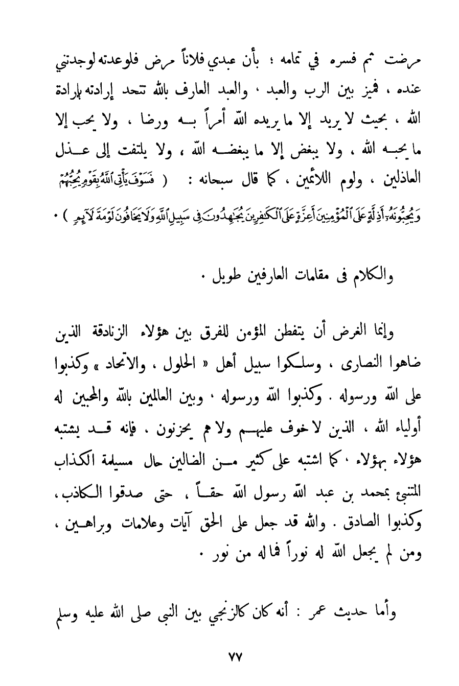 مَرِضْت ثُمَّ فَسَّرَهُ فِي تَمَامِهِ؛ بِأَنَّ عَبْدِي فُلَانًا مَرِضَ فَلَوْ عُدْته لَوَجَدْتنِي عِنْدَهُ فَمَيَّزَ بَيْنَ الرَّبِّ وَالْعَبْدِ وَالْعَبْدُ الْعَارِفُ بِاَللَّهِ تَتَّحِدُ إرَادَتُهُ بِإِرَادَةِ اللَّهِ بِحَيْثُ لَا يُرِيدُ إلَّا مَا يُرِيدُهُ اللَّهُ أَمْرًا بِهِ وَرِضًا وَلَا يُحِبُّ إلَّا مَا يُحِبُّهُ اللَّهُ وَلَا يُبْغِضُ إلَّا مَا يُبْغِضُهُ اللَّهُ وَلَا يَلْتَفِتُ إلَى عَذْلِ الْعَاذِلِينَ وَلَوْمِ اللَّائِمِينَ كَمَا قَالَ سُبْحَانَهُ: {فَسَوْفَ يَأْتِي اللَّهُ بِقَوْمٍ يُحِبُّهُمْ وَيُحِبُّونَهُ أَذِلَّةً عَلَى الْمُؤْمِنِينَ أَعِزَّةً عَلَى الْكَافِرِينَ يُجَاهِدُونَ فِي سَبِيلِ اللَّهِ وَلَا يَخَافُونَ لَوْمَةَ لَائِمٍ} . وَالْكَلَامُ فِي مَقَامَاتِ الْعَارِفِينَ طَوِيلٌ. وَإِنَّمَا الْغَرَضُ أَنْ يَتَفَطَّنَ الْمُؤْمِنُ لِلْفَرْقِ بَيْنَ هَؤُلَاءِ الزَّنَادِقَةِ الَّذِينَ ضَاهُوا النَّصَارَى وَسَلَكُوا سَبِيلَ أَهْلِ " الْحُلُولِ وَالِاتِّحَادِ " وَكَذَبُوا عَلَى اللَّهِ وَرَسُولِهِ. وَكَذَّبُوا اللَّهَ وَرَسُولَهُ وَبَيْنَ الْعَالِمِينَ بِاَللَّهِ وَالْمُحِبِّينَ لَهُ أَوْلِيَاءِ اللَّهِ الَّذِينَ لَا خَوْفٌ عَلَيْهِمْ وَلَا هُمْ يَحْزَنُونَ فَإِنَّهُ قَدْ يُشْتَبَهُ هَؤُلَاءِ بِهَؤُلَاءِ كَمَا اشْتَبَهَ عَلَى كَثِيرٍ مِنْ الضَّالِّينَ حَالُ مُسَيْلِمَةَ الْكَذَّابِ الْمُتَنَبِّئِ بِمُحَمَّدِ بْنِ عَبْدِ اللَّهِ رَسُولِ اللَّهِ حَقًّا حَتَّى صَدَّقُوا الْكَاذِبَ وَكَذَّبُوا الصَّادِقَ. وَاَللَّهُ قَدْ جَعَلَ عَلَى الْحَقِّ آيَاتٍ وَعَلَامَاتٍ وَبَرَاهِينَ وَمَنْ لَمْ يَجْعَلْ اللَّهُ لَهُ نُورًا فَمَا لَهُ مِنْ نُورٍ.