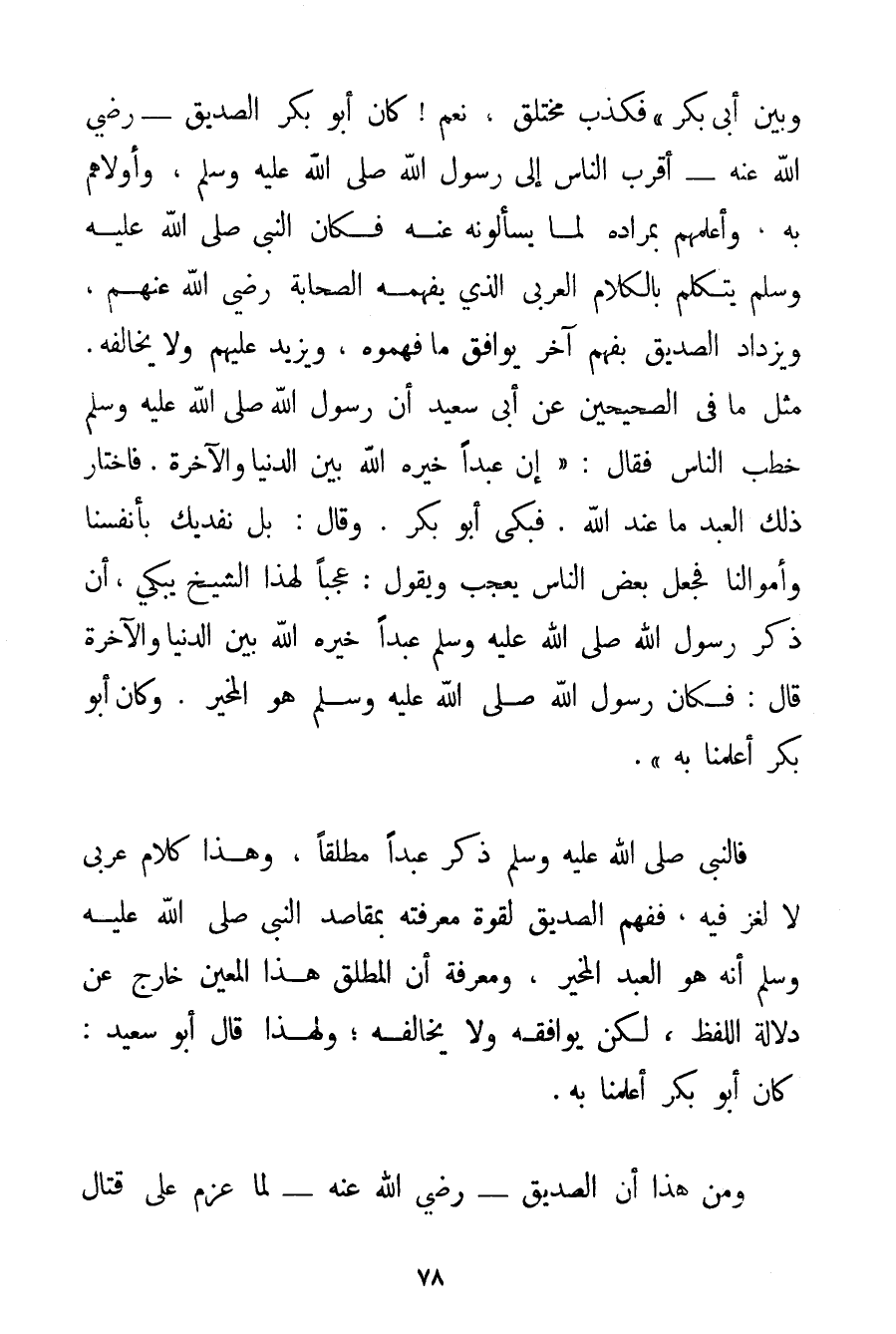 وَبَيْنَ أَبِي بَكْرٍ " فَكَذِبٌ مُخْتَلَقٌ نَعَمْ كَانَ أَبُو بَكْرٍ الصِّدِّيقُ - رَضِيَ اللَّهُ عَنْهُ - أَقْرَبَ النَّاسِ إلَى رَسُولِ اللَّهِ صَلَّى اللَّهُ عَلَيْهِ وَسَلَّمَ وَأَوْلَاهُمْ بِهِ وَأَعْلَمَهُمْ بِمُرَادِهِ لِمَا يَسْأَلُونَهُ عَنْهُ فَكَانَ النَّبِيُّ صَلَّى اللَّهُ عَلَيْهِ وَسَلَّمَ يَتَكَلَّمُ بِالْكَلَامِ الْعَرَبِيِّ الَّذِي يَفْهَمُهُ الصَّحَابَةُ رَضِيَ اللَّهُ عَنْهُمْ وَيَزْدَادُ الصِّدِّيقُ بِفَهْمِ آخَرَ يُوَافِقُ مَا فَهِمُوهُ وَيَزِيدُ عَلَيْهِمْ وَلَا يُخَالِفُهُ. مِثْلُ مَا فِي الصَّحِيحَيْنِ عَنْ أَبِي سَعِيدٍ {أَنَّ رَسُولَ اللَّهِ صَلَّى اللَّهُ عَلَيْهِ وَسَلَّمَ خَطَبَ النَّاسَ فَقَالَ: إنَّ عَبْدًا خَيَّرَهُ اللَّهُ بَيْنَ الدُّنْيَا وَالْآخِرَةِ. فَاخْتَارَ ذَلِكَ الْعَبْدُ مَا عِنْدَ اللَّهِ. فَبَكَى أَبُو بَكْرٍ. وَقَالَ: بَلْ نَفْدِيك بِأَنْفُسِنَا وَأَمْوَالِنَا فَجَعَلَ بَعْضُ النَّاسِ يَعْجَبُ وَيَقُولُ: عَجَبًا لِهَذَا الشَّيْخِ يَبْكِي أَنْ ذَكَرَ رَسُولُ اللَّهِ صَلَّى اللَّهُ عَلَيْهِ وَسَلَّمَ عَبْدًا خَيَّرَهُ اللَّهُ بَيْنَ الدُّنْيَا وَالْآخِرَةِ قَالَ: فَكَانَ رَسُولُ اللَّهِ صَلَّى اللَّهُ عَلَيْهِ وَسَلَّمَ هُوَ الْمُخَيَّرُ. وَكَانَ أَبُو بَكْرٍ أَعْلَمَنَا بِهِ} . فَالنَّبِيُّ صَلَّى اللَّهُ عَلَيْهِ وَسَلَّمَ ذَكَرَ عَبْدًا مُطْلَقًا وَهَذَا كَلَامٌ عَرَبِيٌّ لَا لُغْزَ فِيهِ فَفَهِمَ الصِّدِّيقُ لِقُوَّةِ مَعْرِفَتِهِ بِمَقَاصِدِ النَّبِيِّ صَلَّى اللَّهُ عَلَيْهِ وَسَلَّمَ أَنَّهُ هُوَ الْعَبْدُ الْمُخَيَّرُ وَمَعْرِفَةُ أَنَّ الْمُطْلَقَ هَذَا الْمُعَيَّنَ خَارِجٌ عَنْ دَلَالَةِ اللَّفْظِ لَكِنْ يُوَافِقُهُ وَلَا يُخَالِفُهُ؛ وَلِهَذَا قَالَ أَبُو سَعِيدٍ: كَانَ أَبُو بَكْرٍ أَعْلَمَنَا بِهِ. وَمِنْ هَذَا أَنَّ الصِّدِّيقَ - رَضِيَ اللَّهُ عَنْهُ - لَمَّا عَزَمَ عَلَى قِتَالِ