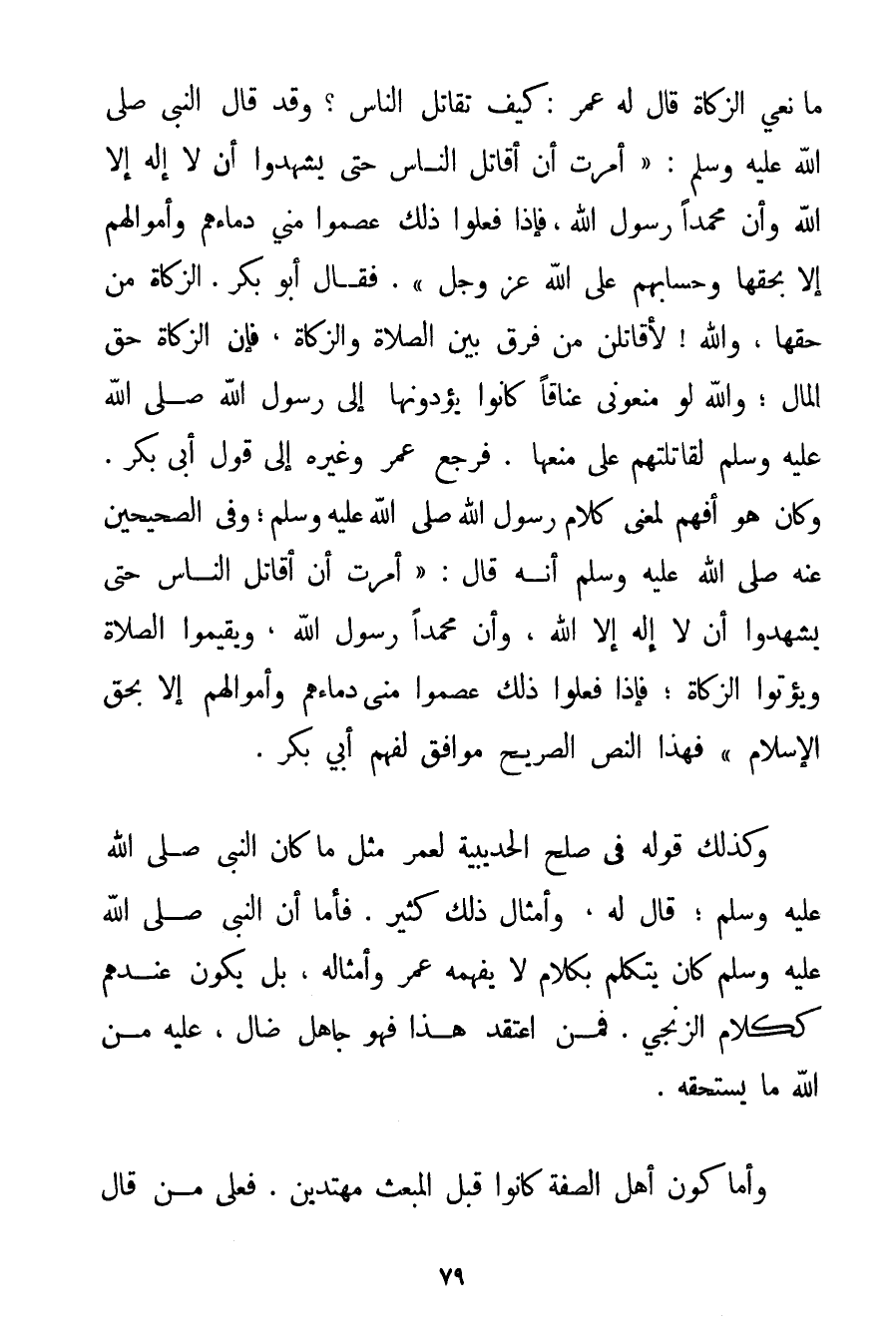 مَانِعِي الزَّكَاةِ قَالَ لَهُ عُمَرُ: كَيْفَ تُقَاتِلُ النَّاسَ؟ وَقَدْ قَالَ النَّبِيُّ صَلَّى اللَّهُ عَلَيْهِ وَسَلَّمَ {أُمِرْت أَنْ أُقَاتِلَ النَّاسَ حَتَّى يَشْهَدُوا أَنْ لَا إلَهَ إلَّا اللَّهُ وَأَنَّ مُحَمَّدًا رَسُولُ اللَّهِ فَإِذَا فَعَلُوا ذَلِكَ عَصَمُوا مِنِّي دِمَاءَهُمْ وَأَمْوَالَهُمْ إلَّا بِحَقِّهَا وَحِسَابُهُمْ عَلَى اللَّهِ عَزَّ وَجَلَّ} . فَقَالَ أَبُو بَكْرٍ. الزَّكَاةُ مِنْ حَقِّهَا وَاَللَّهِ؛ لَأُقَاتِلَن مَنْ فَرَّقَ بَيْنَ الصَّلَاةِ وَالزَّكَاةِ فَإِنَّ الزَّكَاةَ حَقُّ الْمَالِ؛ وَاَللَّهُ لَوْ مَنَعُونِي عَنَاقًا كَانُوا يُؤَدُّونَهَا إلَى رَسُولِ اللَّهِ صَلَّى اللَّهُ عَلَيْهِ وَسَلَّمَ لَقَاتَلْتهمْ عَلَى مَنْعِهَا. فَرَجَعَ عُمَرُ وَغَيْرُهُ إلَى قَوْلِ أَبِي بَكْرٍ. وَكَانَ هُوَ أَفْهَمَ لِمَعْنَى كَلَامِ رَسُولِ اللَّهِ صَلَّى اللَّهُ عَلَيْهِ وَسَلَّمَ وَفِي الصَّحِيحَيْنِ عَنْهُ صَلَّى اللَّهُ عَلَيْهِ وَسَلَّمَ أَنَّهُ قَالَ: {أُمِرْت أَنْ أُقَاتِلَ النَّاسَ حَتَّى يَشْهَدُوا أَنْ لَا إلَهَ إلَّا اللَّهُ وَأَنَّ مُحَمَّدًا رَسُولُ اللَّهِ وَيُقِيمُوا الصَّلَاةَ وَيُؤْتُوا الزَّكَاةَ؛ فَإِذَا فَعَلُوا ذَلِكَ عَصَمُوا مِنِّي دِمَاءَهُمْ وَأَمْوَالَهُمْ إلَّا بِحَقِّ الْإِسْلَامِ} فَهَذَا النَّصُّ الصَّرِيحُ مُوَافِقٌ لِفَهْمِ أَبِي بَكْرٍ. وَكَذَلِكَ قَوْلُهُ فِي صُلْحِ الْحُدَيْبِيَةِ لِعُمَرِ مِثْلُ مَا كَانَ النَّبِيُّ صَلَّى اللَّهُ عَلَيْهِ وَسَلَّمَ قَالَ لَهُ وَأَمْثَالُ ذَلِكَ كَثِيرٌ. فَأَمَّا أَنَّ النَّبِيَّ صَلَّى اللَّهُ عَلَيْهِ وَسَلَّمَ كَانَ يَتَكَلَّمُ بِكَلَامِ لَا يَفْهَمُهُ عُمَرُ وَأَمْثَالُهُ بَلْ يَكُونُ عِنْدَهُمْ كَكَلَامِ الزِّنْجِيِّ. فَمَنْ اعْتَقَدَ هَذَا فَهُوَ جَاهِلٌ ضَالٌّ عَلَيْهِ مِنْ اللَّهِ مَا يَسْتَحِقُّهُ.