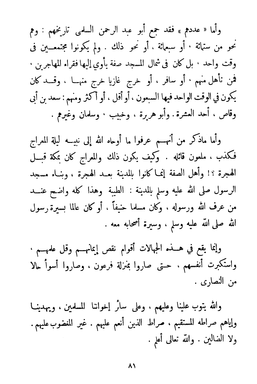 وَأَمَّا " عَدَدُهُمْ " فَقَدْ جَمَعَ أَبُو عَبْدِ الرَّحْمَنِ السُّلَمِي تَارِيخَهُمْ: وَهُمْ نَحْوٌ مِنْ سِتِّمِائَةٍ أَوْ سَبْعِمِائَةٍ أَوْ نَحْوِ ذَلِكَ. وَلَمْ يَكُونُوا مُجْتَمِعِينَ فِي وَقْتٍ وَاحِدٍ بَلْ كَانَ فِي شَمَالِ الْمَسْجِدِ صُفَّةً يَأْوِي إلَيْهَا فُقَرَاءُ الْمُهَاجِرِينَ فَمَنْ تَأَهَّلَ مِنْهُمْ أَوْ سَافَرَ أَوْ خَرَجَ غَازِيًا خَرَجَ مِنْهَا وَقَدْ كَانَ يَكُونُ فِي الْوَقْتِ الْوَاحِدِ فِيهَا السَّبْعُونَ أَوْ أَقَلُّ أَوْ أَكْثَرُ وَمِنْهُمْ: سَعْدُ بْنُ أَبِي وَقَّاصٍ أَحَدُ الْعَشْرَةِ. وَأَبُو هُرَيْرَةَ وخبيب وَسَلْمَانُ وَغَيْرُهُمْ. وَأَمَّا مَا ذُكِرَ مِنْ أَنَّهُمْ عَرَفُوا مَا أَوْحَاهُ اللَّهُ إلَى نَبِيِّهِ لَيْلَةَ الْمِعْرَاجِ فَكَذِبٌ مَلْعُونٌ قَائِلُهُ. وَكَيْفَ يَكُونُ ذَلِكَ وَالْمِعْرَاجُ كَانَ بِمَكَّةَ قَبْلَ الْهِجْرَةِ وَأَهْلُ الصُّفَّةِ إنَّمَا كَانُوا بِالْمَدِينَةِ بَعْدَ الْهِجْرَةِ وَبِنَاءِ مَسْجِدِ الرَّسُولِ صَلَّى اللَّهُ عَلَيْهِ وَسَلَّمَ بِالْمَدِينَةِ: الطَّيِّبَةِ وَهَذَا كُلُّهُ وَاضِحٌ عِنْدَ مَنْ عَرَفَ اللَّهَ وَرَسُولَهُ وَكَانَ مُسْلِمًا حَنِيفًا أَوْ كَانَ عَالِمًا بِسِيرَةِ رَسُولِ اللَّهِ صَلَّى اللَّهُ عَلَيْهِ وَسَلَّمَ وَسِيرَةِ أَصْحَابِهِ مَعَهُ. وَإِنَّمَا يَقَعُ فِي هَذِهِ الْجَهَالَاتِ أَقْوَامٌ نَقَصَ إيمَانُهُمْ وَقَلَّ عِلْمُهُمْ وَاسْتَكْبَرَتْ أَنْفُسُهُمْ حَتَّى صَارُوا بِمَنْزِلَةِ فِرْعَوْنَ وَصَارُوا أَسْوَأَ حَالًا مِنْ النَّصَارَى. وَاَللَّهُ يَتُوبُ عَلَيْنَا وَعَلَيْهِمْ وَعَلَى سَائِرِ إخْوَانِنَا الْمُسْلِمِينَ وَيَهْدِينَا وَإِيَّاهُمْ صِرَاطَهُ الْمُسْتَقِيمَ صِرَاطَ الَّذِينَ أَنْعَمَ عَلَيْهِمْ. غَيْرِ الْمَغْضُوبِ عَلَيْهِمْ. وَلَا الضَّالِّينَ. وَاَللَّهُ تَعَالَى أَعْلَمُ.