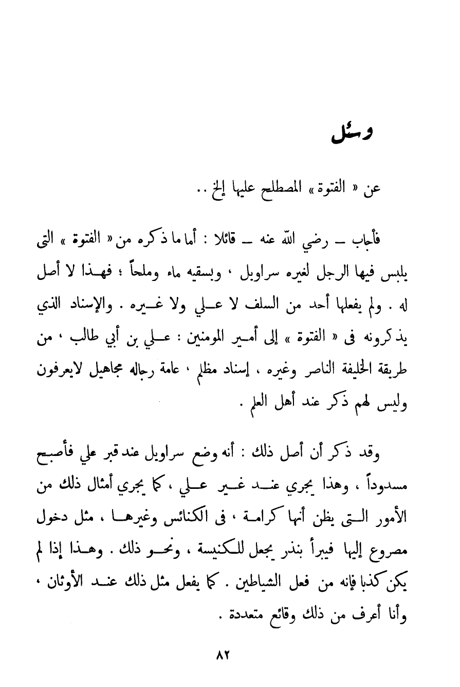 أَمَّا مَا ذَكَرَهُ مِنْ " الْفُتُوَّةِ " الَّتِي يَلْبَسُ فِيهَا الرَّجُلُ لِغَيْرِهِ سَرَاوِيلَ وَيَسْقِيه مَاءً وَمِلْحًا؛ فَهَذَا لَا أَصْلَ لَهُ. وَلَمْ يَفْعَلْهَا أَحَدٌ مِنْ السَّلَفِ لَا عَلِيٌّ وَلَا غَيْرُهُ. وَالْإِسْنَادُ الَّذِي يَذْكُرُونَهُ فِي " الْفُتُوَّةِ " إلَى أَمِيرِ الْمُؤْمِنِينَ: عَلِيِّ بْنِ أَبِي طَالِبٍ مِنْ طَرِيقَةِ الْخَلِيفَةِ النَّاصِرِ وَغَيْرِهِ إسْنَادٌ مُظْلِمٌ عَامَّةُ رِجَالِهِ مَجَاهِيلُ لَا يُعْرَفُونَ وَلَيْسَ لَهُمْ ذِكْرٌ عِنْدَ أَهْلِ الْعِلْمِ. وَقَدْ ذُكِرَ أَنَّ أَصْلَ ذَلِكَ: أَنَّهُ وَضَعَ سَرَاوِيلَ عِنْدَ قَبْرِ عَلِيٍّ فَأَصْبَحَ مَسْدُودًا وَهَذَا يَجْرِي عِنْدَ غَيْرِ عَلِيٍّ كَمَا يَجْرِي أَمْثَالُ ذَلِكَ مِنْ الْأُمُورِ الَّتِي يُظَنُّ أَنَّهَا كَرَامَةٌ فِي الْكَنَائِسِ وَغَيْرِهَا مِثْلُ دُخُولِ مَصْرُوعٍ إلَيْهَا فَيَبْرَأُ بِنَذْرِ يُجْعَلُ لِلْكَنِيسَةِ وَنَحْوِ ذَلِكَ. وَهَذَا إذَا لَمْ يَكُنْ كَذِبًا فَإِنَّهُ مِنْ فِعْلِ الشَّيَاطِينِ. كَمَا يُفْعَلُ مِثْلُ ذَلِكَ عِنْدَ الْأَوْثَانِ وَأَنَا أَعْرِفُ مِنْ ذَلِكَ وَقَائِعَ مُتَعَدِّدَةً.