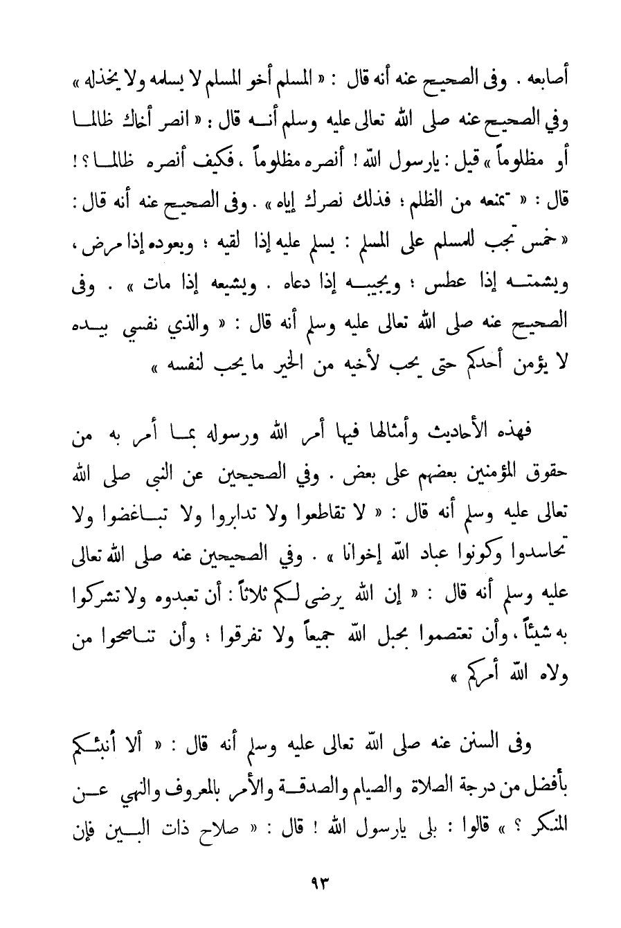 أَصَابِعِهِ. وَفِي الصَّحِيحِ عَنْهُ أَنَّهُ قَالَ: {الْمُسْلِمُ أَخُو الْمُسْلِمِ لَا يُسْلِمْهُ وَلَا يَخْذُلْهُ} وَفِي الصَّحِيحِ عَنْهُ صَلَّى اللَّهُ تَعَالَى عَلَيْهِ وَسَلَّمَ أَنَّهُ قَالَ: {اُنْصُرْ أَخَاك ظَالِمًا أَوْ مَظْلُومًا قِيلَ: يَا رَسُولَ اللَّهِ أَنْصُرُهُ مَظْلُومًا فَكَيْفَ أَنْصُرُهُ ظَالِمًا قَالَ: تَمْنَعُهُ مِنْ الظُّلْمِ؛ فَذَلِكَ نَصْرُك إيَّاهُ} . وَفِي الصَّحِيحِ عَنْهُ أَنَّهُ قَالَ: {خَمْسٌ تَجِبُ لِلْمُسْلِمِ عَلَى الْمُسْلِمِ: يُسَلِّمُ عَلَيْهِ إذَا لَقِيَهُ؛ وَيَعُودُهُ إذَا مَرِضَ وَيُشَمِّتُهُ إذَا عَطَسَ؛ وَيُجِيبُهُ إذَا دَعَاهُ. وَيُشَيِّعُهُ إذَا مَاتَ} . وَفِي الصَّحِيحِ عَنْهُ صَلَّى اللَّهُ تَعَالَى عَلَيْهِ وَسَلَّمَ أَنَّهُ قَالَ: {وَاَلَّذِي نَفْسِي بِيَدِهِ لَا يُؤْمِنُ أَحَدُكُمْ حَتَّى يُحِبَّ لِأَخِيهِ مِنْ الْخَيْرِ مَا يُحِبُّ لِنَفْسِهِ} فَهَذِهِ الْأَحَادِيثُ وَأَمْثَالُهَا فِيهَا أَمْرُ اللَّهِ وَرَسُولِهِ بِمَا أَمَرَ بِهِ مِنْ حُقُوقِ الْمُؤْمِنِينَ بَعْضِهِمْ عَلَى بَعْضٍ. وَفِي الصَّحِيحَيْنِ عَنْ النَّبِيِّ صَلَّى اللَّهُ تَعَالَى عَلَيْهِ وَسَلَّمَ أَنَّهُ قَالَ: {لَا تَقَاطَعُوا وَلَا تَدَابَرُوا وَلَا تَبَاغَضُوا وَلَا تَحَاسَدُوا وَكُونُوا عِبَادَ اللَّهِ إخْوَانًا} . وَفِي الصَّحِيحَيْنِ عَنْهُ صَلَّى اللَّهُ تَعَالَى عَلَيْهِ وَسَلَّمَ أَنَّهُ قَالَ: {إنَّ اللَّهَ يَرْضَى لَكُمْ ثَلَاثًا: أَنْ تَعْبُدُوهُ وَلَا تُشْرِكُوا بِهِ شَيْئًا وَأَنْ تَعْتَصِمُوا بِحَبْلِ اللَّهِ جَمِيعًا وَلَا تَفَرَّقُوا؛ وَأَنْ تَنَاصَحُوا مَنْ وَلَّاهُ اللَّهُ أَمْرَكُمْ} وَفِي السُّنَنِ عَنْهُ صَلَّى اللَّهُ تَعَالَى عَلَيْهِ وَسَلَّمَ أَنَّهُ قَالَ: {أَلَا أُنَبِّئُكُمْ بِأَفْضَلَ مِنْ دَرَجَةِ الصَّلَاةِ وَالصِّيَامِ وَالصَّدَقَةِ وَالْأَمْرِ بِالْمَعْرُوفِ وَالنَّهْيِ عَنْ الْمُنْكَرِ؟ قَالُوا: بَلَى يَا رَسُولَ اللَّهِ قَالَ: صَلَاحُ ذَاتِ الْبَيْنِ فَإِنَّ
