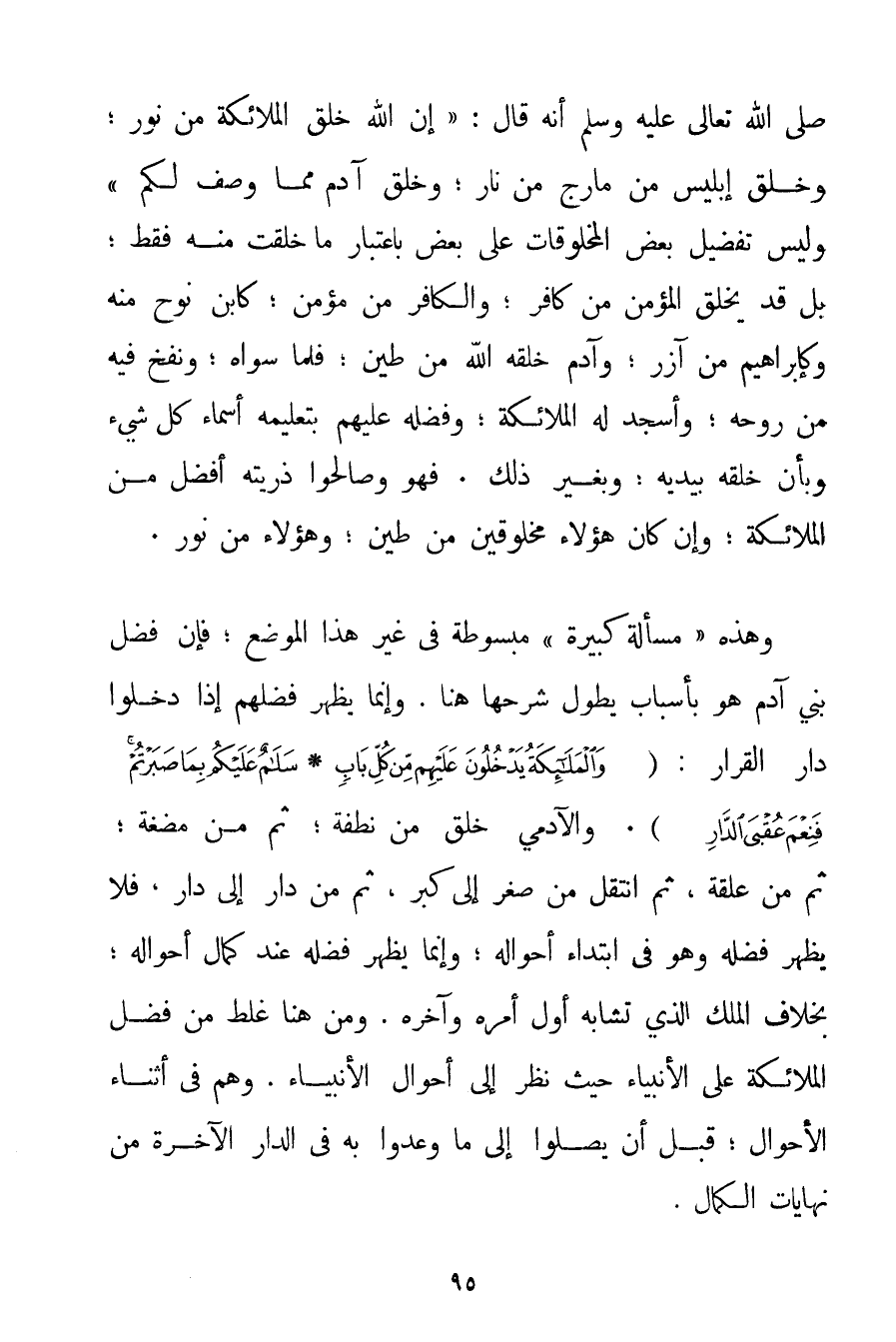 صَلَّى اللَّهُ تَعَالَى عَلَيْهِ وَسَلَّمَ أَنَّهُ قَالَ: {إنَّ اللَّهَ خَلَقَ الْمَلَائِكَةَ مِنْ نُورٍ؛ وَخَلَقَ إبْلِيسَ مِنْ مَارِجٍ مِنْ نَارٍ؛ وَخَلَقَ آدَمَ مِمَّا وَصَفَ لَكُمْ} وَلَيْسَ تَفْضِيلُ بَعْضِ الْمَخْلُوقَاتِ عَلَى بَعْضٍ بِاعْتِبَارِ مَا خُلِقَتْ مِنْهُ فَقَطْ؛ بَلْ قَدْ يُخْلَقُ الْمُؤْمِنُ مِنْ كَافِرٍ؛ وَالْكَافِرُ مِنْ مُؤْمِنٍ؛ كَابْنِ نُوحٍ مِنْهُ وَكَإِبْرَاهِيمَ مِنْ آزَرَ؛ وَآدَمُ خَلَقَهُ اللَّهُ مِنْ طِينٍ: فَلَمَّا سَوَّاهُ؛ وَنَفَخَ فِيهِ مِنْ رُوحِهِ؛ وَأَسْجَدَ لَهُ الْمَلَائِكَةَ؛ وَفَضَّلَهُ عَلَيْهِمْ بِتَعْلِيمِهِ أَسْمَاءَ كُلِّ شَيْءٍ وَبِأَنْ خَلَقَهُ بِيَدَيْهِ؛ وَبِغَيْرِ ذَلِكَ. فَهُوَ وَصَالِحُو ذُرِّيَّتِهِ أَفْضَلُ مِنْ الْمَلَائِكَةِ؛ وَإِنْ كَانَ هَؤُلَاءِ مَخْلُوقِينَ مِنْ طِينٍ؛ وَهَؤُلَاءِ مِنْ نُورٍ. وَهَذِهِ " مَسْأَلَةٌ كَبِيرَةٌ " مَبْسُوطَةٌ فِي غَيْرِ هَذَا الْمَوْضِعِ؛ فَإِنَّ فَضْلَ بَنِي آدَمَ هُوَ بِأَسْبَابِ يَطُولُ شَرْحُهَا هُنَا. وَإِنَّمَا يَظْهَرُ فَضْلُهُمْ إذَا دَخَلُوا دَارَ الْقَرَارِ: {وَالْمَلَائِكَةُ يَدْخُلُونَ عَلَيْهِمْ مِنْ كُلِّ بَابٍ سَلَامٌ عَلَيْكُمْ بِمَا صَبَرْتُمْ فَنِعْمَ عُقْبَى الدَّارِ} . وَالْآدَمِيُّ خُلِقَ مِنْ نُطْفَةٍ؛ ثُمَّ مِنْ مُضْغَةٍ؛ ثُمَّ مِنْ عَلَقَةٍ ثُمَّ انْتَقَلَ مَنْ صِغَرٍ إلَى كِبَرٍ ثُمَّ مِنْ دَارٍ إلَى دَارٍ فَلَا يَظْهَرُ فَضْلُهُ وَهُوَ فِي ابْتِدَاءِ أَحْوَالِهِ؛ وَإِنَّمَا يَظْهَرُ فَضْلُهُ عِنْدَ كَمَالِ أَحْوَالِهِ؛ بِخِلَافِ الْمَلَكِ الَّذِي تَشَابَهَ أَوَّلُ أَمْرِهِ وَآخِرِهِ. وَمِنْ هُنَا غَلِطَ مَنْ فَضَّلَ الْمَلَائِكَةَ عَلَى الْأَنْبِيَاءِ حَيْثُ نَظَرَ إلَى أَحْوَالِ الْأَنْبِيَاءِ. وَهُمْ فِي أَثْنَاءِ الْأَحْوَالِ. قَبْلَ أَنْ يَصِلُوا إلَى مَا وُعِدُوا بِهِ فِي الدَّارِ الْآخِرَةِ مِنْ نِهَايَاتِ الْكَمَالِ.