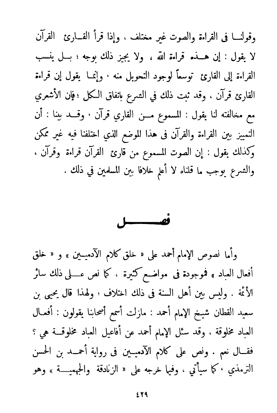 وَقَوْلُنَا فِي الْقِرَاءَةِ وَالصَّوْتِ غَيْرُ مُخْتَلِفٍ وَإِذَا قَرَأَ الْقَارِئُ الْقُرْآنَ لَا يَقُولُ: إنَّ هَذِهِ قِرَاءَةُ اللَّهِ وَلَا يُجِيزُ ذَلِكَ بِوَجْهِ: بَلْ يَنْسُبُ الْقِرَاءَةَ إلَى الْقَارِئِ تَوَسُّعًا لِوُجُودِ التَّحْوِيلِ مِنْهُ وَإِنَّمَا يَقُولُ إنَّ قِرَاءَةَ الْقَارِي قُرْآنٌ وَقَدْ ثَبَتَ ذَلِكَ فِي الشَّرْعِ بِاتِّفَاقِ الْكُلِّ؛ فَإِنَّ الْأَشْعَرِيَّ مَعَ مُخَالَفَتِهِ لَنَا يَقُولُ: الْمَسْمُوعُ مِنْ الْقَارِي قُرْآنٌ وَقَدْ بَيَّنَّا: أَنَّ التَّمْيِيزَ بَيْنَ الْقِرَاءَةِ وَالْقُرْآنِ فِي هَذَا الْمَوْضِعِ الَّذِي اخْتَلَفْنَا فِيهِ غَيْرُ مُمْكِنٍ وَكَذَلِكَ يَقُولُ: إنَّ الصَّوْتَ الْمَسْمُوعَ مِنْ قَارِئِ الْقُرْآنِ قِرَاءَةٌ وَقُرْآنٌ وَالشَّرْعُ يُوجِبُ مَا قُلْنَاهُ لَا أَعْلَمُ خِلَافًا بَيْنَ الْمُسْلِمِينَ فِي ذَلِكَ.