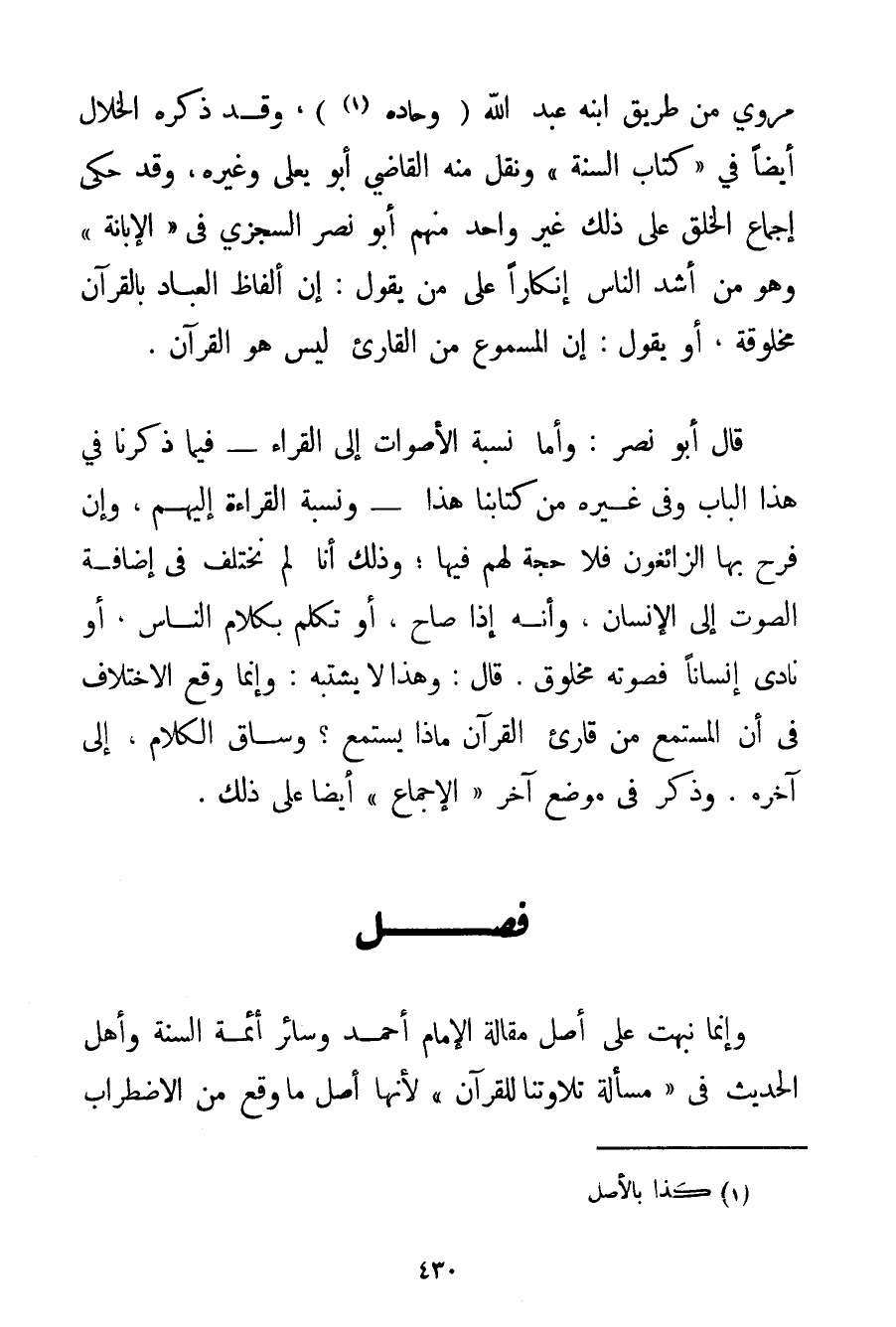 وَقَدْ ذَكَرَهُ الْخَلَّالُ أَيْضًا فِي " كِتَابِ السُّنَّةِ " وَنَقَلَ مِنْهُ الْقَاضِي أَبُو يَعْلَى وَغَيْرُهُ وَقَدْ حَكَى إجْمَاعَ الْخَلْقِ عَلَى ذَلِكَ غَيْرُ وَاحِدٍ مِنْهُمْ أَبُو نَصْرٍ السجزي فِي " الْإِبَانَةِ " وَهُوَ مَنْ أَشَدِّ النَّاسِ إنْكَارًا عَلَى مَنْ يَقُولُ: إنَّ أَلْفَاظَ الْعِبَادِ بِالْقُرْآنِ مَخْلُوقَةٌ أَوْ يَقُولُ: إنَّ الْمَسْمُوعَ مِنْ الْقَارِئِ لَيْسَ هُوَ الْقُرْآنَ. قَالَ أَبُو نَصْرٍ: وَأَمَّا نِسْبَةُ الْأَصْوَاتِ إلَى الْقُرَّاءِ - فِيمَا ذَكَرْنَا فِي هَذَا الْبَابِ وَفِي غَيْرِهِ مِنْ كِتَابِنَا هَذَا - وَنِسْبَةُ الْقِرَاءَةِ إلَيْهِمْ وَإِنْ فَرِحَ بِهَا الزَّائِغُونَ فَلَا حُجَّةَ لَهُمْ فِيهَا؛ وَذَلِكَ أَنَّا لَمْ نَخْتَلِفْ فِي إضَافَةِ الصَّوْتِ إلَى الْإِنْسَانِ وَأَنَّهُ إذَا صَاحَ أَوْ تَكَلَّمَ بِكَلَامِ النَّاسِ أَوْ نَادَى إنْسَانًا فَصَوْتُهُ مَخْلُوقٌ. قَالَ: وَهَذَا لَا يَشْتَبِهُ: وَإِنَّمَا وَقَعَ الِاخْتِلَافُ فِي أَنَّ الْمُسْتَمِعَ مِنْ قَارِئِ الْقُرْآنِ مَاذَا يَسْتَمِعُ؟ وَسَاقَ الْكَلَامَ إلَى آخِرِهِ. وَذَكَرَ فِي مَوْضِعٍ آخَرَ " الْإِجْمَاعَ " أَيْضًا عَلَى ذَلِكَ.