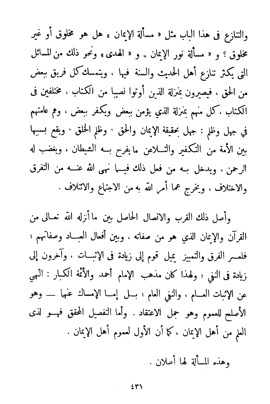 وَالتَّنَازُعِ فِي هَذَا الْبَابِ مِثْلُ " مَسْأَلَةِ الْإِيمَانِ " هَلْ هُوَ مَخْلُوقٌ أَوْ غَيْرُ مَخْلُوقٍ؟ وَ " مَسْأَلَةِ نُورِ الْإِيمَانِ " وَ " الْهُدَى " وَنَحْوِ ذَلِكَ مِنْ الْمَسَائِلِ الَّتِي يَكْثُرُ تَنَازُعُ أَهْلِ الْحَدِيثِ وَالسُّنَّةِ فِيهَا وَيَتَمَسَّكُ كُلُّ فَرِيقٍ بِبَعْضِ مِنْ الْحَقِّ فَيَصِيرُونَ بِمَنْزِلَةِ الَّذِينَ أُوتُوا نَصِيبًا مِنْ الْكِتَابِ مُخْتَلِفِينَ فِي الْكِتَابِ كُلٌّ مِنْهُمْ بِمَنْزِلَةِ الَّذِي يُؤْمِنُ بِبَعْضِ وَيَكْفُرُ بِبَعْضِ وَهُمْ عَامَّتُهُمْ فِي جَهْلٍ وَظُلْمٍ: جَهْلٍ بِحَقِيقَةِ الْإِيمَانِ وَالْحَقِّ وَظُلْمِ الْخَلْقِ وَيَقَعُ بِسَبَبِهَا بَيْنَ الْأُمَّةِ مِنْ التَّكْفِيرِ وَالتَّلَاعُنِ مَا يَفْرَحُ بِهِ الشَّيْطَانُ وَيَغْضَبُ لَهُ الرَّحْمَنُ وَيَدْخُلُ بِهِ مَنْ فَعَلَ ذَلِكَ فِيمَا نَهَى اللَّهُ عَنْهُ مِنْ التَّفَرُّقِ وَالِاخْتِلَافِ وَيَخْرُجُ عَمَّا أَمَرَ اللَّهُ بِهِ مِنْ الِاجْتِمَاعِ والائتلاف. وَأَصْلُ ذَلِكَ الْقُرْبُ وَالِاتِّصَالُ الْحَاصِلُ بَيْنَ مَا أَنْزَلَهُ اللَّهُ تَعَالَى مِنْ الْقُرْآنِ وَالْإِيمَانِ الَّذِي هُوَ مِنْ صِفَاتِهِ وَبَيْنَ أَفْعَالِ الْعِبَادِ وَصِفَاتِهِمْ؛ فَلِعُسْرِ الْفَرْقِ وَالتَّمْيِيزِ يَمِيلُ قَوْمٌ إلَى زِيَادَةٍ فِي الْإِثْبَاتِ. وَآخَرُونَ إلَى زِيَادَةٍ فِي النَّفْيِ؛ وَلِهَذَا كَانَ مَذْهَبُ الْإِمَامِ أَحْمَد وَالْأَئِمَّةِ الْكِبَارِ: النَّهْيُ عَنْ الْإِثْبَاتِ الْعَامِّ وَالنَّفْيِ الْعَامِّ؛ بَلْ إمَّا الْإِمْسَاكُ عَنْهُمَا - وَهُوَ الْأَصْلَحُ لِلْعُمُومِ وَهُوَ جُمَلُ الِاعْتِقَادِ. وَأَمَّا التَّفْصِيلُ الْمُحَقَّقُ فَهُوَ لِذِي الْعِلْمِ مِنْ أَهْلِ الْإِيمَانِ كَمَا أَنَّ الْأَوَّلَ لِعُمُومِ أَهْلِ الْإِيمَانِ. وَهَذِهِ الْمَسْأَلَةُ لَهَا أَصْلَانِ: