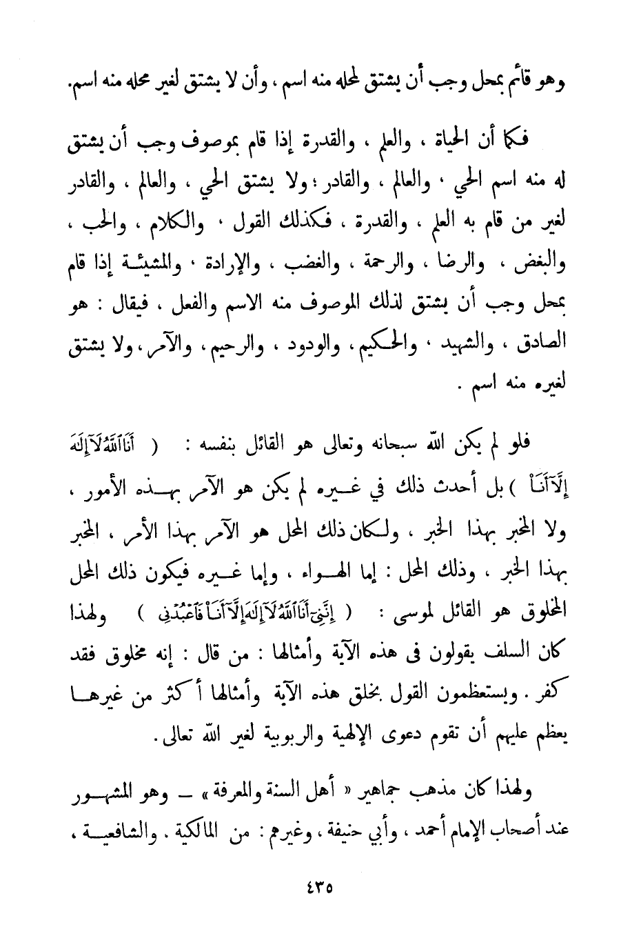 وَهُوَ قَائِمٌ بِمَحَلِّ وَجَبَ أَنْ يُشْتَقَّ لِمَحَلِّهِ مِنْهُ اسْمٌ وَأَنْ لَا يُشْتَقَّ لِغَيْرِ مَحَلِّهِ مِنْهُ اسْمٌ. فَكَمَا أَنَّ الْحَيَاةَ وَالْعِلْمَ وَالْقُدْرَةَ إذَا قَامَ بِمَوْصُوفِ وَجَبَ أَنْ يُشْتَقَّ لَهُ مِنْهُ اسْمُ الْحَيِّ وَالْعَالَمِ وَالْقَادِرِ؛ وَلَا يُشْتَقُّ الْحَيُّ وَالْعَالَمُ وَالْقَادِرُ لِغَيْرِ مَنْ قَامَ بِهِ الْعِلْمُ وَالْقُدْرَةُ فَكَذَلِكَ الْقَوْلُ وَالْكَلَامُ وَالْحُبُّ وَالْبُغْضُ وَالرِّضَا وَالرَّحْمَةُ وَالْغَضَبُ وَالْإِرَادَةُ وَالْمَشِيئَةُ إذَا قَامَ بِمَحَلِّ وَجَبَ أَنْ يُشْتَقَّ لِذَلِكَ الْمَوْصُوفِ مِنْهُ الِاسْمُ وَالْفِعْلُ فَيُقَالُ: هُوَ الصَّادِقُ وَالشَّهِيدُ وَالْحَكِيمُ وَالْوَدُودُ وَالرَّحِيمُ وَالْآمِرُ وَلَا يُشْتَقُّ لِغَيْرِهِ مِنْهُ اسْمٌ. فَلَوْ لَمْ يَكُنْ اللَّهُ سُبْحَانَهُ وَتَعَالَى هُوَ الْقَائِلَ بِنَفْسِهِ: {أَنَا اللَّهُ لَا إلَهَ إلَّا أَنَا} بَلْ أَحْدَثَ ذَلِكَ فِي غَيْرِهِ لَمْ يَكُنْ هُوَ الْآمِرَ بِهَذِهِ الْأُمُورِ وَلَا الْمُخْبِرَ بِهَذَا الْخَبَرِ وَلَكَانَ ذَلِكَ الْمَحَلُّ هُوَ الْآمِرَ بِهَذَا الْأَمْرِ الْمُخْبِرَ بِهَذَا الْخَبَرِ وَذَلِكَ الْمَحَلُّ: إمَّا الْهَوَاءُ وَإِمَّا غَيْرُهُ فَيَكُونُ ذَلِكَ الْمَحَلُّ الْمَخْلُوقُ هُوَ الْقَائِلُ لِمُوسَى: {إنَّنِي أَنَا اللَّهُ لَا إلَهَ إلَّا أَنَا فَاعْبُدْنِي} وَلِهَذَا كَانَ السَّلَفُ يَقُولُونَ فِي هَذِهِ الْآيَةِ وَأَمْثَالِهَا: مَنْ قَالَ: إنَّهُ مَخْلُوقٌ فَقَدْ كَفَرَ. وَيَسْتَعْظِمُونَ الْقَوْلَ بِخَلْقِ هَذِهِ الْآيَةِ وَأَمْثَالِهَا أَكْثَرَ مِنْ غَيْرِهَا يَعْظُمُ عَلَيْهِمْ أَنْ تَقُومَ دَعْوَى الْإِلَهِيَّةِ وَالرُّبُوبِيَّةِ لِغَيْرِ اللَّهِ تَعَالَى. وَلِهَذَا كَانَ مَذْهَبُ جَمَاهِيرِ " أَهْلِ السُّنَّةِ وَالْمَعْرِفَةِ " - وَهُوَ الْمَشْهُورُ عِنْدَ أَصْحَابِ الْإِمَامِ أَحْمَد وَأَبِي حَنِيفَةَ وَغَيْرِهِمْ: مِنْ الْمَالِكِيَّةِ وَالشَّافِعِيَّةِ