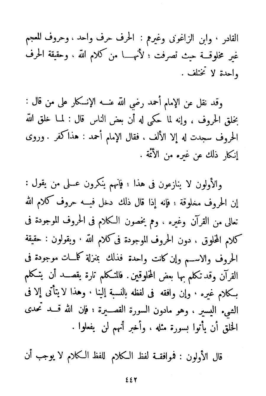 الْقَادِرِ وَابْنِ الزَّاغُونِي وَغَيْرِهِمْ: الْحَرْفُ حَرْفٌ وَاحِدٌ وَحُرُوفُ الْمُعْجَمِ غَيْرُ مَخْلُوقَةٍ حَيْثُ تَصَرَّفَتْ؛ لِأَنَّهَا مِنْ كَلَامِ اللَّهِ وَحَقِيقَةُ الْحَرْفِ وَاحِدَةٌ لَا تَخْتَلِفُ. وَقَدْ نُقِلَ عَنْ الْإِمَامِ أَحْمَد رَضِيَ اللَّهُ عَنْهُ الْإِنْكَارُ عَلَى مَنْ قَالَ: بِخَلْقِ الْحُرُوفِ وَإِنَّهُ لَمَّا حُكِيَ لَهُ أَنَّ بَعْضَ النَّاسِ قَالَ: لَمَّا خَلَقَ اللَّهُ الْحُرُوفَ سَجَدَتْ لَهُ إلَّا الْأَلِفُ فَقَالَ الْإِمَامُ أَحْمَد: هَذَا كُفْرٌ. وَرُوِيَ إنْكَارُ ذَلِكَ عَنْ غَيْرِهِ مِنْ الْأَئِمَّةِ. وَالْأَوَّلُونَ لَا يُنَازِعُونَ فِي هَذَا؛ فَإِنَّهُمْ يُنْكِرُونَ عَلَى مَنْ يَقُولُ: إنَّ الْحُرُوفَ مَخْلُوقَةٌ؛ فَإِنَّهُ إذَا قَالَ ذَلِكَ دَخَلَ فِيهِ حُرُوفُ كَلَامِ اللَّهِ تَعَالَى مِنْ الْقُرْآنِ وَغَيْرِهِ وَهُمْ يَخُصُّونَ الْكَلَامَ فِي الْحُرُوفِ الْمَوْجُودَةِ فِي كَلَامِ الْمَخْلُوقِ دُونَ الْحُرُوفِ الْمَوْجُودَةِ فِي كَلَامِ اللَّهِ وَيَقُولُونَ: حَقِيقَةُ الْحُرُوفِ وَالِاسْمِ وَإِنْ كَانَتْ وَاحِدَةً فَذَلِكَ بِمَنْزِلَةِ كَلِمَاتٍ مَوْجُودَةٍ فِي الْقُرْآنِ وَقَدْ تَكَلَّمَ بِهَا بَعْضُ الْمَخْلُوقِينَ. فَالْمُتَكَلِّمُ تَارَةً يَقْصِدُ أَنْ يَتَكَلَّمَ بِكَلَامِ غَيْرِهِ وَإِنْ وَافَقَهُ فِي لَفْظِهِ بِالنِّسْبَةِ إلَيْنَا وَهَذَا لَا يَتَأَتَّى إلَّا فِي الشَّيْءِ الْيَسِيرِ وَهُوَ مَا دُونُ السُّورَةِ الْقَصِيرَةِ؛ فَإِنَّ اللَّهَ قَدْ تَحَدَّى الْخَلْقَ أَنْ يَأْتُوا بِسُورَةِ مِثْلِهِ وَأَخْبَرَ أَنَّهُمْ لَنْ يَفْعَلُوا. قَالَ الْأَوَّلُونَ: فَمُوَافَقَةُ لَفْظُ الْكَلَامِ لِلَفْظِ الْكَلَامِ لَا يُوجِبُ أَنْ