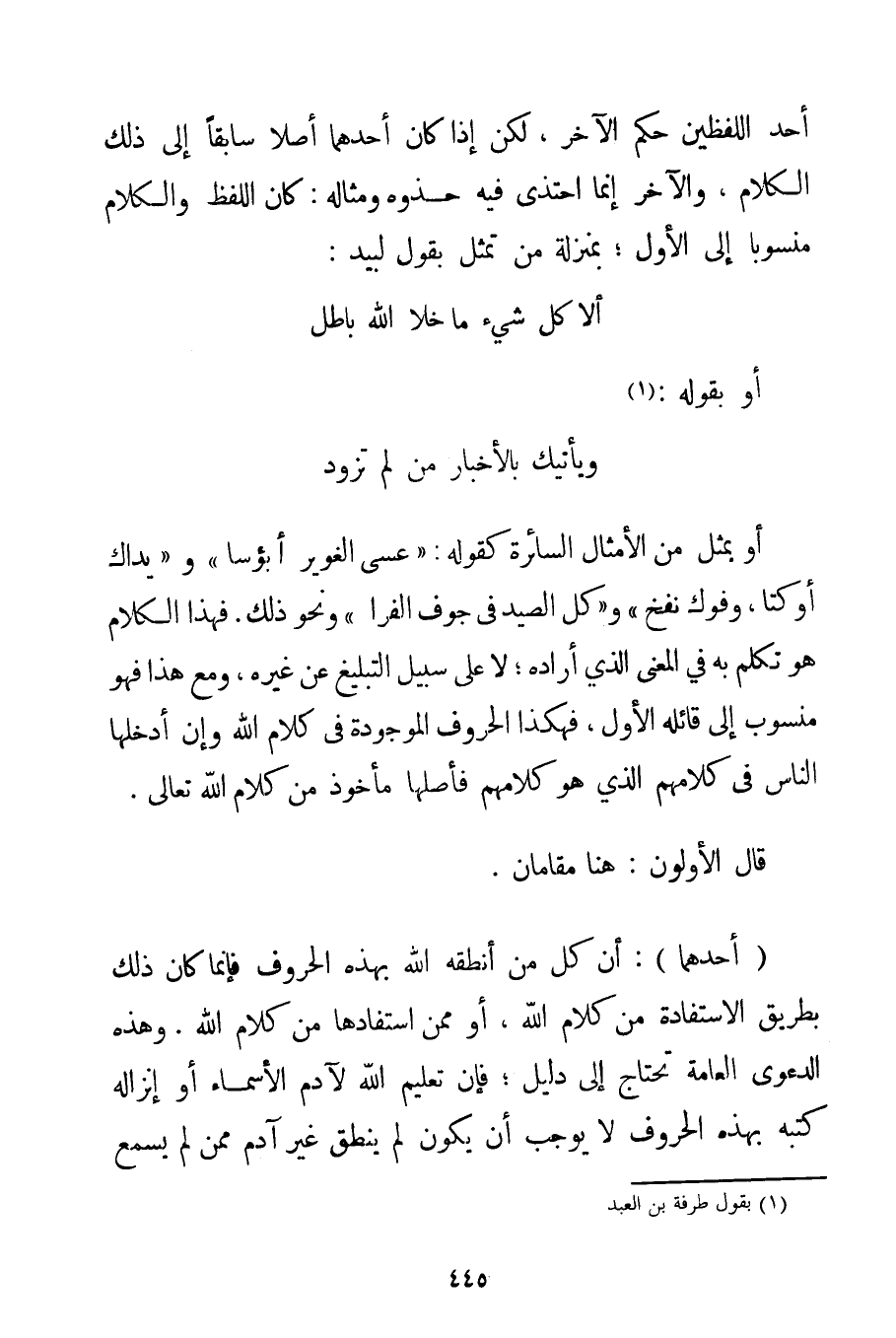 أَحَدِ اللَّفْظَيْنِ حُكْمَ الْآخَرِ لَكِنْ إذَا كَانَ أَحَدُهُمَا أَصْلًا سَابِقًا إلَى ذَلِكَ الْكَلَامِ وَالْآخَرُ إنَّمَا احْتَذَى فِيهِ حَذْوَهُ وَمِثَالُهُ: كَانَ اللَّفْظُ وَالْكَلَامُ مَنْسُوبًا إلَى الْأَوَّلِ؛ بِمَنْزِلَةِ مَنْ تَمَثَّلَ بِقَوْلِ لَبِيَدِ: أَلَا كُلُّ شَيْءٍ مَا خَلَا اللَّهَ بَاطِلٌ أَوْ بِقَوْلِهِ: وَيَأْتِيك بِالْأَخْبَارِ مَنْ لَمْ تُزَوِّدْ أَوْ بِمَثَلِ مِنْ الْأَمْثَالِ السَّائِرَةِ كَقَوْلِهِ: " عَسَى الْغُوَيْرُ أَبْؤُسًا " وَ " يَدَاك أَوْكَتَا وَفُوك نَفَخَ " وَكُلُّ الصَّيْدِ فِي جَوْفِ الْفَرَا " وَنَحْوِ ذَلِكَ. فَهَذَا الْكَلَامُ هُوَ تَكَلَّمَ بِهِ فِي الْمَعْنَى الَّذِي أَرَادَهُ؛ لَا عَلَى سَبِيلِ التَّبْلِيغِ عَنْ غَيْرِهِ وَمَعَ هَذَا فَهُوَ مَنْسُوبٌ إلَى قَائِلِهِ الْأَوَّلِ فَهَكَذَا الْحُرُوفُ الْمَوْجُودَةُ فِي كَلَامِ اللَّهِ وَإِنْ أَدْخَلَهَا النَّاسُ فِي كَلَامِهِمْ الَّذِي هُوَ كَلَامُهُمْ فَأَصْلُهَا مَأْخُوذٌ مِنْ كَلَامِ اللَّهِ تَعَالَى. قَالَ الْأَوَّلُونَ: هُنَا مَقَامَانِ. أَحَدُهُمَا: أَنَّ كُلَّ مَنْ أَنْطَقَهُ اللَّهُ بِهَذِهِ الْحُرُوفِ فَإِنَّمَا كَانَ ذَلِكَ بِطَرِيقِ الِاسْتِفَادَةِ مِنْ كَلَامِ اللَّهِ أَوْ مِمَّنْ اسْتَفَادَهَا مِنْ كَلَامِ اللَّهِ. وَهَذِهِ الدَّعْوَى الْعَامَّةُ تَحْتَاجُ إلَى دَلِيلٍ؛ فَإِنَّ تَعْلِيمَ اللَّهِ لِآدَمَ الْأَسْمَاءَ أَوْ إنْزَالَهُ كُتُبَهُ بِهَذِهِ الْحُرُوفِ لَا يُوجِبُ أَنْ يَكُونَ لَمْ يَنْطِقْ غَيْرُ آدَمَ مِمَّنْ لَمْ يَسْمَعُ