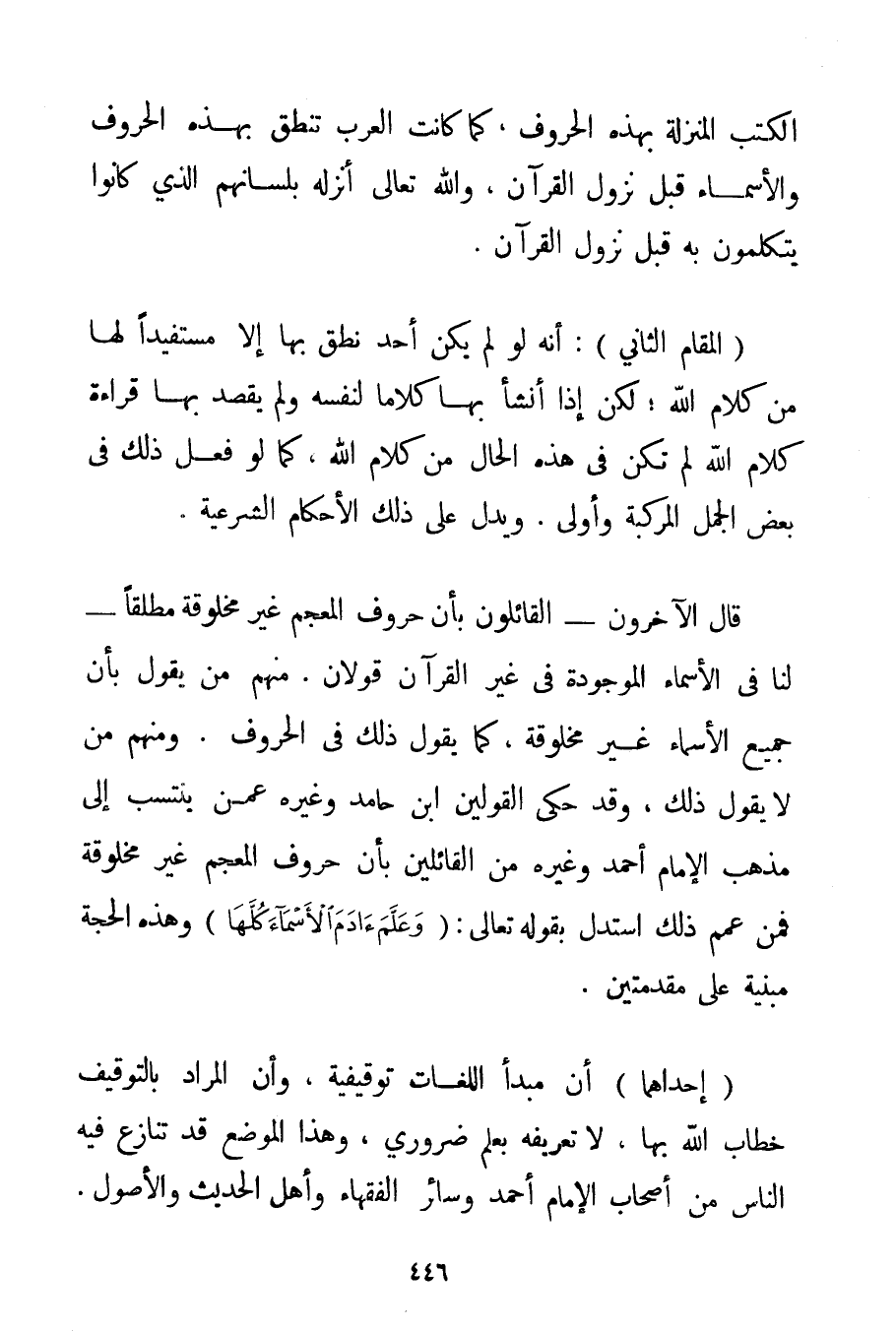 الْمَقَامُ الثَّانِي: أَنَّهُ لَوْ لَمْ يَكُنْ أَحَدٌ نَطَقَ بِهَا إلَّا مُسْتَفِيدًا لَهَا مِنْ كَلَامِ اللَّهِ؛ لَكِنْ إذَا أَنْشَأَ بِهَا كَلَامًا لِنَفْسِهِ وَلَمْ يَقْصِدْ بِهَا قِرَاءَةَ كَلَامِ اللَّهِ لَمْ تَكُنْ فِي هَذِهِ الْحَالِ مِنْ كَلَامِ اللَّهِ كَمَا لَوْ فَعَلَ ذَلِكَ فِي بَعْضِ الْجُمَلِ الْمُرَكَّبَةِ وَأَوْلَى. وَيَدُلُّ عَلَى ذَلِكَ الْأَحْكَامُ الشَّرْعِيَّةُ. قَالَ الْآخَرُونَ - الْقَائِلُونَ بِأَنَّ حُرُوفَ الْمُعْجَمِ غَيْرُ مَخْلُوقَةٍ مُطْلَقًا - لَنَا فِي الْأَسْمَاءِ الْمَوْجُودَةِ فِي غَيْرِ الْقُرْآنِ قَوْلَانِ. مِنْهُمْ مَنْ يَقُولُ بِأَنَّ جَمِيعَ الْأَسْمَاءِ غَيْرُ مَخْلُوقَةٍ كَمَا يَقُولُ ذَلِكَ فِي الْحُرُوفِ. وَمِنْهُمْ مَنْ لَا يَقُولُ ذَلِكَ وَقَدْ حَكَى الْقَوْلَيْنِ ابْنُ حَامِدٍ وَغَيْرُهُ عَمَّنْ يَنْتَسِبُ إلَى مَذْهَبِ الْإِمَامِ أَحْمَد وَغَيْرِهِ مِنْ الْقَائِلِينَ بِأَنَّ حُرُوفَ الْمُعْجَمِ غَيْرُ مَخْلُوقَةٍ فَمَنْ عَمَّمَ ذَلِكَ اسْتَدَلَّ بِقَوْلِهِ تَعَالَى: {وَعَلَّمَ آدَمَ الْأَسْمَاءَ كُلَّهَا} وَهَذِهِ الْحُجَّةُ مَبْنِيَّةٌ عَلَى مُقَدِّمَتَيْنِ. (إحْدَاهُمَا أَنَّ مَبْدَأَ اللُّغَاتِ تَوْقِيفِيَّةٌ وَأَنَّ الْمُرَادَ بِالتَّوْقِيفِ خِطَابُ اللَّهِ بِهَا لَا تَعْرِيفُهُ بِعِلْمِ ضَرُورِيٍّ وَهَذَا الْمَوْضِعُ قَدْ تَنَازَعَ فِيهِ النَّاسُ مِنْ أَصْحَابِ الْإِمَامِ أَحْمَد وَسَائِر الْفُقَهَاءِ وَأَهْلِ الْحَدِيثِ وَالْأُصُولِ.