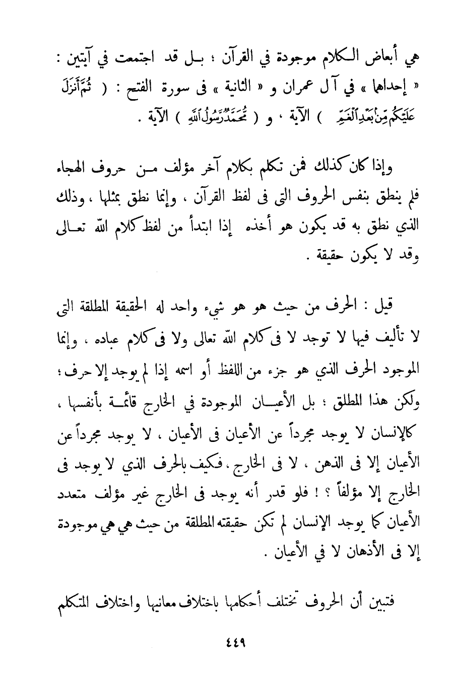 هِيَ أَبْعَاضُ الْكَلَامِ مَوْجُودَةٌ فِي الْقُرْآنِ؛ بَلْ قَدْ اجْتَمَعَتْ فِي آيَتَيْنِ: " إحْدَاهُمَا " فِي آلِ عِمْرَانَ وَ " الثَّانِيَةِ " فِي سُورَةِ الْفَتْحِ: {ثُمَّ أَنْزَلَ عَلَيْكُمْ مِنْ بَعْدِ الْغَمِّ} الْآيَةَ وَ {مُحَمَّدٌ رَسُولُ اللَّهِ} الْآيَةَ. وَإِذَا كَانَ كَذَلِكَ فَمَنْ تَكَلَّمَ بِكَلَامِ آخَرَ مُؤَلَّفٍ مِنْ حُرُوفِ الْهِجَاءِ فَلَمْ يَنْطِقْ بِنَفْسِ الْحُرُوفِ الَّتِي فِي لَفْظِ الْقُرْآنِ وَإِنَّمَا نَطَقَ بِمِثْلِهَا وَذَلِكَ الَّذِي نَطَقَ بِهِ قَدْ يَكُونُ هُوَ أَخَذَهُ وَإِذَا ابْتَدَأَ مِنْ لَفْظِ كَلَامِ اللَّهِ تَعَالَى وَقَدْ لَا يَكُونُ حَقِيقَةً. قِيلَ: الْحَرْفُ مِنْ حَيْثُ هُوَ هُوَ شَيْءٌ وَاحِدٌ لَهُ الْحَقِيقَةُ الْمُطْلَقَةُ الَّتِي لَا تَأْلِيفَ فِيهَا لَا تُوجَدُ لَا فِي كَلَامِ اللَّهِ تَعَالَى وَلَا فِي كَلَامِ عِبَادِهِ وَإِنَّمَا الْمَوْجُودُ الْحَرْفُ الَّذِي هُوَ جُزْءٌ مِنْ اللَّفْظِ أَوْ اسْمُهُ إذَا لَمْ يُوجَدْ إلَّا حَرْفٌ؛ وَلَكِنَّ هَذَا الْمُطْلَقُ؛ بَلْ الْأَعْيَانُ الْمَوْجُودَةُ فِي الْخَارِجِ قَائِمَةٌ بِأَنْفُسِهَا كَالْإِنْسَانِ لَا يُوجَدُ مُجَرَّدًا عَنْ الْأَعْيَانِ فِي الْأَعْيَانِ لَا يُوجَدُ مُجَرَّدًا عَنْ الْأَعْيَانِ إلَّا فِي الذِّهْنِ لَا فِي الْخَارِجِ فَكَيْفَ بِالْحَرْفِ الَّذِي لَا يُوجَدُ فِي الْخَارِجِ إلَّا مُؤَلَّفًا فَلَوْ قُدِّرَ أَنَّهُ يُوجَدُ فِي الْخَارِجِ غَيْرَ مُؤَلَّفٍ مُتَعَدِّدَ الْأَعْيَانِ كَمَا يُوجَدُ الْإِنْسَانُ لَمْ تَكُنْ حَقِيقَتُهُ الْمُطْلَقَةُ مِنْ حَيْثُ هِيَ هِيَ مَوْجُودَةً إلَّا فِي الْأَذْهَانِ لَا فِي الْأَعْيَانِ. فَتَبَيَّنَ أَنَّ الْحُرُوفَ تَخْتَلِفُ أَحْكَامُهَا بِاخْتِلَافِ مَعَانِيهَا وَاخْتِلَافِ الْمُتَكَلِّمِ