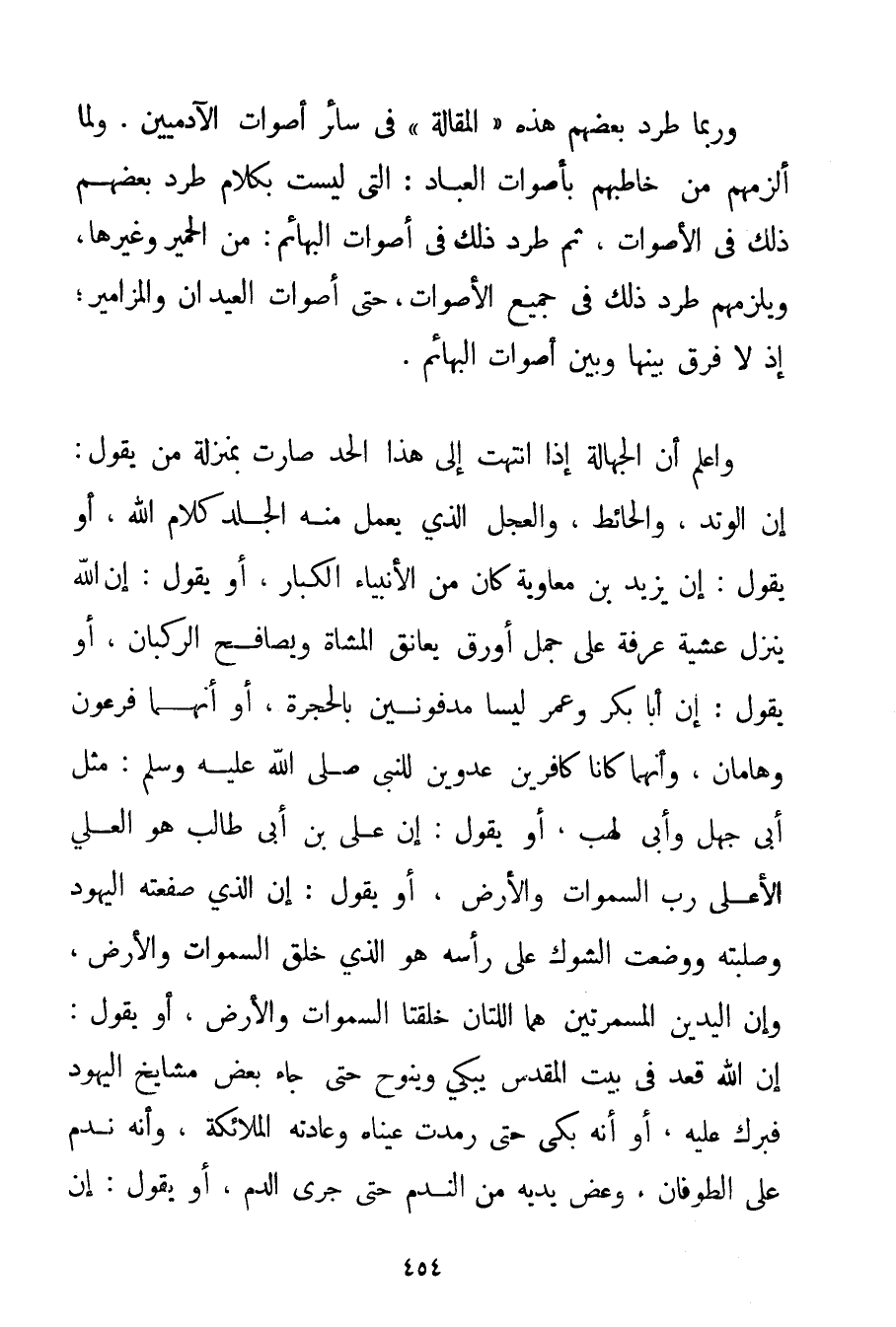 وَرُبَّمَا طَرَدَ بَعْضُهُمْ هَذِهِ " الْمَقَالَةِ " فِي سَائِر أَصْوَاتِ الْآدَمِيِّينَ. وَلَمَّا أَلْزَمُهُمْ مَنْ خَاطَبَهُمْ بِأَصْوَاتِ الْعِبَادِ؛ الَّتِي لَيْسَتْ بِكَلَامِ طَرَدَ بَعْضُهُمْ ذَلِكَ فِي الْأَصْوَاتِ ثُمَّ طَرَدَ ذَلِكَ فِي أَصْوَاتِ الْبَهَائِمِ: مِنْ الْحَمِيرِ وَغَيْرِهَا وَيَلْزَمُهُمْ طَرْدُ ذَلِكَ فِي جَمِيعِ الْأَصْوَاتِ حَتَّى أَصْوَاتُ الْعِيدَانِ وَالْمَزَامِيرِ؛ إذْ لَا فَرْقَ بَيْنَهَا وَبَيْنَ أَصْوَاتِ الْبَهَائِمِ. وَاعْلَمْ أَنَّ الْجَهَالَةَ إذَا انْتَهَتْ إلَى هَذَا الْحَدِّ صَارَتْ بِمَنْزِلَةِ مَنْ يَقُولُ: إنَّ الْوَتَدَ وَالْحَائِطَ وَالْعَجَلَ الَّذِي يُعْمَلُ مِنْهُ الْجِلْدُ كَلَامُ اللَّهِ أَوْ يَقُولُ: إنَّ يَزِيدَ بْنَ مُعَاوِيَةَ كَانَ مِنْ الْأَنْبِيَاءِ الْكِبَارِ أَوْ يَقُولُ: إنَّ اللَّهَ يَنْزِلُ عَشِيَّةَ عَرَفَةَ عَلَى جَمَلٍ أَوْرَقَ يُعَانِقُ الْمُشَاةَ وَيُصَافِحُ الرُّكْبَانَ أَوْ يَقُولُ: إنَّ أَبَا بَكْرٍ وَعُمَرَ لَيْسَا مَدْفُونَيْنِ بِالْحُجْرَةِ أَوْ أَنَّهُمَا فِرْعَوْنُ وَهَامَانُ وَأَنَّهُمَا كَانَا كَافِرَيْنِ عَدُوَّيْنِ لِلنَّبِيِّ صَلَّى اللَّهُ عَلَيْهِ وَسَلَّمَ مِثْلَ أَبِي جَهْلٍ وَأَبِي لَهَبٍ أَوْ يَقُولُ: إنَّ عَلِيَّ بْنَ أَبِي طَالِبٍ هُوَ الْعَلِيُّ الْأَعْلَى رَبُّ السَّمَوَاتِ وَالْأَرْضِ أَوْ يَقُولُ: إنَّ الَّذِي صَفَعَتْهُ الْيَهُودُ وَصَلَبَتْهُ وَوَضَعَتْ الشَّوْكَ عَلَى رَأْسِهِ هُوَ الَّذِي خَلَقَ السَّمَوَاتِ وَالْأَرْضَ وَإِنَّ الْيَدَيْنِ الْمُسَمَّرَتَيْنِ هُمَا اللَّتَانِ خَلَقَتَا السَّمَوَاتِ وَالْأَرْضَ أَوْ يَقُولُ: إنَّ اللَّهَ قَعَدَ فِي بَيْتِ الْمَقْدِسِ يَبْكِي وَيَنُوحُ حَتَّى جَاءَ بَعْضُ مَشَايِخِ الْيَهُودِ فَبَرَكَ عَلَيْهِ أَوْ أَنَّهُ بَكَى حَتَّى رَمَدَتْ عَيْنَاهُ وَعَادَتْهُ الْمَلَائِكَةُ وَأَنَّهُ نَدِمَ عَلَى الطُّوفَانِ وَعَضَّ يَدَيْهِ مِنْ النَّدَمِ حَتَّى جَرَى الدَّمُ أَوْ يَقُولُ: إنَّ