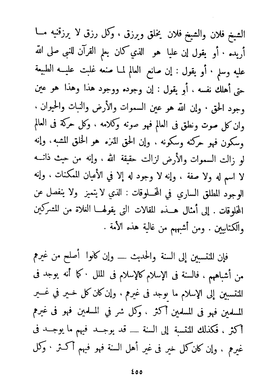 الشَّيْخَ فُلَانًا وَالشَّيْخَ فُلَانًا يَخْلُقُ وَيَرْزُقُ وَكُلُّ رِزْقٍ لَا يَرْزُقُنِيهِ مَا أُرِيدُهُ أَوْ يَقُولُ إنَّ عَلِيًّا هُوَ الَّذِي كَانَ يُعَلِّمُ الْقُرْآنَ لِلنَّبِيِّ صَلَّى اللَّهُ عَلَيْهِ وَسَلَّمَ أَوْ يَقُولُ: إنَّ صَانِعَ الْعَالَمِ لَمَّا صَنَعَهُ غَلَبَتْ عَلَيْهِ الطَّبِيعَةُ حَتَّى أَهَلَكَ نَفْسَهُ أَوْ يَقُولُ: إنَّ وُجُودَهُ وَوُجُودَ هَذَا وَهَذَا هُوَ عَيْنُ وُجُودِ الْحَقِّ وَإِنَّ اللَّهَ هُوَ عَيْنُ السَّمَوَاتِ وَالْأَرْضِ وَالنَّبَاتِ وَالْحَيَوَانِ وَأَنَّ كُلَّ صَوْتٍ وَنُطْقٍ فِي الْعَالَمِ فَهُوَ صَوْتُهُ وَكَلَامُهُ وَكُلَّ حَرَكَةٍ فِي الْعَالَمِ وَسُكُونٍ فَهُوَ حَرَكَتُهُ وَسُكُونُهُ وَإِنَّ الْحَقَّ الْمُنَزَّهَ هُوَ الْخَلْقُ الْمُشَبَّهُ وَإِنَّهُ لَوْ زَالَتْ السَّمَوَاتُ وَالْأَرْضُ لَزَالَتْ حَقِيقَةُ اللَّهِ وَإِنَّهُ مِنْ حَيْثُ ذَاتُهُ لَا اسْمَ لَهُ وَلَا صِفَةَ وَإِنَّهُ لَا وُجُودَ لَهُ إلَّا فِي الْأَعْيَانِ الْمُمْكِنَاتِ وَإِنَّهُ الْوُجُودُ الْمُطْلَقُ السَّارِي فِي الْمَخْلُوقَاتِ: الَّذِي لَا يَتَمَيَّزُ وَلَا يَنْفَصِلُ عَنْ الْمَخْلُوقَاتِ. إلَى أَمْثَالِ هَذِهِ الْمَقَالَاتِ الَّتِي يَقُولُهَا الْغُلَاة مِنْ الْمُشْرِكِينَ وَالْكِتَابِيِّينَ. وَمَنْ أَشْبَهَهُمْ مِنْ غَالِيَةِ هَذِهِ الْأُمَّةِ. فَإِنَّ الْمُنْتَسِبِينَ إلَى السُّنَّةِ وَالْحَدِيثِ - وَإِنْ كَانُوا أَصْلَحَ مِنْ غَيْرِهِمْ مِنْ أَشْبَاهِهِمْ فَالسُّنَّةُ فِي الْإِسْلَامِ كَالْإِسْلَامِ فِي الْمَلَلِ كَمَا أَنَّهُ يُوجَدُ فِي الْمُنْتَسِبِينَ إلَى الْإِسْلَامِ مَا يُوجَدُ فِي غَيْرِهِمْ وَإِنْ كَانَ كُلُّ خَيْرٍ فِي غَيْرِ الْمُسْلِمِينَ فَهُوَ فِي الْمُسْلِمِينَ أَكْثَرُ وَكُلُّ شَرٍّ فِي الْمُسْلِمِينَ فَهُوَ فِي غَيْرِهِمْ أَكْثَرُ فَكَذَلِكَ الْمُنْتَسِبَةُ إلَى السُّنَّةِ - قَدْ يُوجَدُ فِيهِمْ مَا يُوجَدُ فِي غَيْرِهِمْ وَإِنْ كَانَ كُلُّ خَيْرٍ فِي غَيْرِ أَهْلِ السُّنَّةِ فَهُوَ فِيهِمْ أَكْثَرُ وَكُلُّ