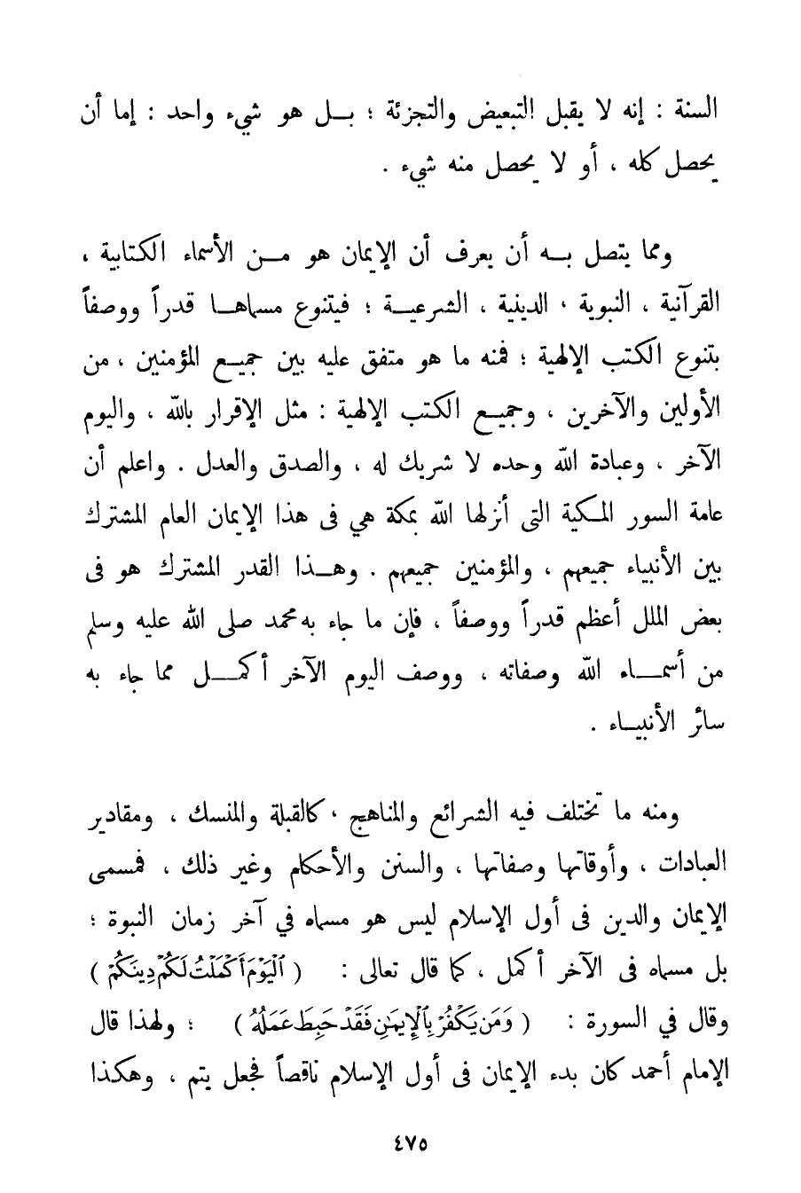 السُّنَّةِ: إنَّهُ لَا يَقْبَلُ التَّبْعِيضَ وَالتَّجْزِئَةَ؛ بَلْ هُوَ شَيْءٌ وَاحِدٌ: إمَّا أَنْ يَحْصُلَ كُلُّهُ أَوْ لَا يَحْصُلَ مِنْهُ شَيْءٌ. وَمِمَّا يَتَّصِلُ بِهِ أَنْ يُعْرَفَ أَنَّ الْإِيمَانَ هُوَ مِنْ الْأَسْمَاءِ الْكِتَابِيَّةِ الْقُرْآنِيَّةِ النَّبَوِيَّةِ الدِّينِيَّةِ الشَّرْعِيَّةِ؛ فَيَتَنَوَّعُ مُسَمَّاهَا قَدْرًا وَوَصْفًا بِتَنَوُّعِ الْكُتُبِ الْإِلَهِيَّةِ؛ فَمِنْهُ مَا هُوَ مُتَّفَقٌ عَلَيْهِ بَيْنَ جَمِيعِ الْمُؤْمِنِينَ مِنْ الْأَوَّلِينَ والآخرين وَجَمِيعِ الْكُتُبِ الْإِلَهِيَّةِ: مِثْلُ الْإِقْرَارِ بِاَللَّهِ وَالْيَوْمِ الْآخِرِ وَعِبَادَةِ اللَّهِ وَحْدَهُ لَا شَرِيكَ لَهُ وَالصِّدْقِ وَالْعَدْلِ. وَاعْلَمْ أَنَّ عَامَّةَ السُّوَرِ الْمَكِّيَّةِ الَّتِي أَنْزَلَهَا اللَّهُ بِمَكَّةَ هِيَ فِي هَذَا الْإِيمَانِ الْعَامِّ الْمُشْتَرَكِ بَيْنَ الْأَنْبِيَاءِ جَمِيعِهِمْ وَالْمُؤْمِنِينَ جَمِيعِهِمْ. وَهَذَا الْقَدْرُ الْمُشْتَرَكُ هُوَ فِي بَعْضِ الْمِلَلِ أَعْظَمُ قَدْرًا وَوَصْفًا فَإِنَّ مَا جَاءَ بِهِ مُحَمَّدٌ صَلَّى اللَّهُ عَلَيْهِ وَسَلَّمَ مِنْ أَسْمَاءِ اللَّهِ وَصِفَاتِهِ وَوَصْفِ الْيَوْمِ الْآخِرِ أَكْمَلُ مِمَّا جَاءَ بِهِ سَائِر الْأَنْبِيَاءِ. وَمِنْهُ مَا تَخْتَلِفُ فِيهِ الشَّرَائِعُ وَالْمَنَاهِجُ كَالْقِبْلَةِ وَالْمَنْسَكِ وَمَقَادِيرِ الْعِبَادَاتِ وَأَوْقَاتِهَا وَصِفَاتِهَا وَالسُّنَنِ وَالْأَحْكَامِ وَغَيْرِ ذَلِكَ فَمُسَمَّى الْإِيمَانِ وَالدِّينِ فِي أَوَّلِ الْإِسْلَامِ لَيْسَ هُوَ مُسَمَّاهُ فِي آخِرِ زَمَانِ النُّبُوَّةِ؛ بَلْ مُسَمَّاهُ فِي الْآخِرِ أَكْمَلُ كَمَا قَالَ تَعَالَى: {الْيَوْمَ أَكْمَلْتُ لَكُمْ دِينَكُمْ} وَقَالَ فِي السُّورَةِ: {وَمَنْ يَكْفُرْ بِالْإِيمَانِ فَقَدْ حَبِطَ عَمَلُهُ} وَلِهَذَا قَالَ الْإِمَامُ أَحْمَد كَانَ بَدْءُ الْإِيمَانِ فِي أَوَّلِ الْإِسْلَامِ نَاقِصًا فَجَعَلَ يَتِمُّ وَهَكَذَا