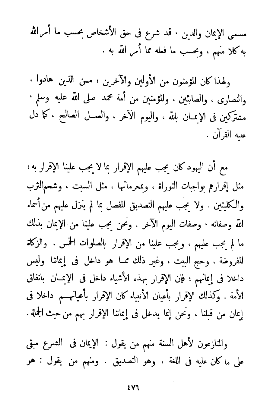 مُسَمَّى الْإِيمَانِ وَالدِّينِ قَدْ شُرِعَ فِي حَقِّ الْأَشْخَاصِ بِحَسَبِ مَا أَمَرَ اللَّهُ بِهِ كُلًّا مِنْهُمْ وَبِحَسَبِ مَا فَعَلَهُ مِمَّا أَمَرَ اللَّهُ بِهِ. وَلِهَذَا كَانَ الْمُؤْمِنُونَ مِنْ الْأَوَّلِينَ والآخرين؛ مِنْ الَّذِينَ هَادُوا وَالنَّصَارَى وَالصَّابِئِينَ وَالْمُؤْمِنِينَ مِنْ أُمَّةِ مُحَمَّدٍ صَلَّى اللَّهُ عَلَيْهِ وَسَلَّمَ مُشْتَرِكِينَ فِي الْإِيمَانِ بِاَللَّهِ وَالْيَوْمِ الْآخِرِ وَالْعَمَلِ الصَّالِحِ كَمَا دَلَّ عَلَيْهِ الْقُرْآنُ. مَعَ أَنَّ الْيَهُودَ كَانَ يَجِبُ عَلَيْهِمْ الْإِقْرَارُ بِمَا لَا يَجِبُ عَلَيْنَا الْإِقْرَارُ بِهِ؛ مِثْلُ إقْرَارِهِمْ بِوَاجِبَاتِ التَّوْرَاةِ وبمحرماتها مِثْلِ السَّبْتِ وَشَحْمِ الثَّرْبِ وَالْكُلْيَتَيْنِ. وَلَا يَجِبُ عَلَيْهِمْ التَّصْدِيقُ الْمُفَصَّلُ بِمَا لَمْ يَنْزِلْ عَلَيْهِمْ مِنْ أَسْمَاءِ اللَّهِ وَصِفَاتِهِ وَصِفَاتِ الْيَوْمِ الْآخِرِ. وَنَحْنُ يَجِبُ عَلَيْنَا مِنْ الْإِيمَانِ بِذَلِكَ مَا لَمْ يَجِبْ عَلَيْهِمْ وَيَجِبُ عَلَيْنَا مِنْ الْإِقْرَارِ بِالصَّلَوَاتِ الْخَمْسِ وَالزَّكَاةِ الْمَفْرُوضَةِ وَحَجِّ الْبَيْتِ وَغَيْرِ ذَلِكَ مِمَّا هُوَ دَاخِلٌ فِي إيمَانِنَا وَلَيْسَ دَاخِلًا فِي إيمَانِهِمْ؛ فَإِنَّ الْإِقْرَارَ بِهَذِهِ الْأَشْيَاءِ دَاخِلٌ فِي الْإِيمَانِ بِاتِّفَاقِ الْأُمَّةِ. وَكَذَلِكَ الْإِقْرَارُ بِأَعْيَانِ الْأَنْبِيَاءِ كَانَ الْإِقْرَارُ بِأَعْيَانِهِمْ دَاخِلًا فِي إيمَانِ مَنْ قَبْلَنَا وَنَحْنُ إنَّمَا يَدْخُلُ فِي إيمَانِنَا الْإِقْرَارُ بِهِمْ مِنْ حَيْثُ الْجُمْلَةُ. وَالْمُنَازِعُونَ لِأَهْلِ السُّنَّةِ مِنْهُمْ مَنْ يَقُولُ: الْإِيمَانُ فِي الشَّرْعِ مُبْقًى عَلَى مَا كَانَ عَلَيْهِ فِي اللُّغَةِ؛ وَهُوَ التَّصْدِيقُ. وَمِنْهُمْ مَنْ يَقُولُ: هُوَ