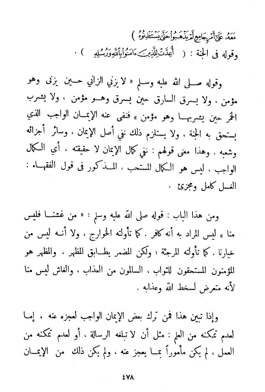 وَرَسُولِهِ وَإِذَا كَانُوا مَعَهُ عَلَى أَمْرٍ جَامِعٍ لَمْ يَذْهَبُوا حَتَّى يَسْتَأْذِنُوهُ} . وَقَوْلِهِ فِي الْجَنَّةِ: {أُعِدَّتْ لِلَّذِينَ آمَنُوا بِاللَّهِ وَرُسُلِهِ} . وَقَوْلِهِ صَلَّى اللَّهُ عَلَيْهِ وَسَلَّمَ {لَا يَزْنِي الزَّانِي حِينَ يَزْنِي وَهُوَ مُؤْمِنٌ وَلَا يَسْرِقُ السَّارِقُ حِينَ يَسْرِقُ وَهُوَ مُؤْمِنٌ وَلَا يَشْرَبُ الْخَمْرَ حِينَ يَشْرَبُهَا وَهُوَ مُؤْمِنٌ} " فَنُفِيَ عَنْهُ الْإِيمَانُ الْوَاجِبُ الَّذِي يَسْتَحِقُّ بِهِ الْجَنَّةَ وَلَا يَسْتَلْزِمُ ذَلِكَ نَفْيَ أَصْلِ الْإِيمَانِ وَسَائِر أَجْزَائِهِ وَشُعَبِهِ. وَهَذَا مَعْنَى قَوْلِهِمْ: نَفْيُ كَمَالِ الْإِيمَانِ لَا حَقِيقَتُهُ أَيْ الْكَمَالُ الْوَاجِبُ لَيْسَ هُوَ الْكَمَالُ الْمُسْتَحَبُّ الْمَذْكُورُ فِي قَوْلِ الْفُقَهَاءِ: الْغُسْلُ كَامِلٌ وَمُجْزِئٌ. وَمِنْ هَذَا الْبَابِ: قَوْلُهُ صَلَّى اللَّهُ عَلَيْهِ وَسَلَّمَ " {مَنْ غَشَّنَا فَلَيْسَ مِنَّا} " لَيْسَ الْمُرَادُ بِهِ أَنَّهُ كَافِرٌ. كَمَا تَأَوَّلَتْهُ الْخَوَارِجُ وَلَا أَنَّهُ لَيْسَ مِنْ خِيَارِنَا. كَمَا تَأَوَّلَتْهُ الْمُرْجِئَةُ؛ وَلَكِنْ الْمُضْمَرُ يُطَابِقُ الْمَظْهَرَ وَالْمَظْهَرُ هُوَ الْمُؤْمِنُونَ الْمُسْتَحِقُّونَ لِلثَّوَابِ السَّالِمُونَ مِنْ الْعَذَابِ وَالْغَاشُّ لَيْسَ مِنَّا لِأَنَّهُ مُتَعَرِّضٌ لِسُخْطِ اللَّهِ وَعَذَابِهِ. وَإِذَا تَبَيَّنَ هَذَا فَمَنْ تَرَكَ بَعْضَ الْإِيمَانِ الْوَاجِبِ لِعَجْزِهِ عَنْهُ إمَّا لِعَدَمِ تَمَكُّنِهِ مِنْ الْعِلْمِ: مِثْلُ أَنْ لَا تَبْلُغَهُ الرِّسَالَةُ أَوْ لِعَدَمِ تَمَكُّنِهِ مِنْ الْعَمَلِ لَمْ يَكُنْ مَأْمُورًا بِمَا يَعْجِزُ عَنْهُ وَلَمْ يَكُنْ ذَلِكَ مِنْ الْإِيمَانِ