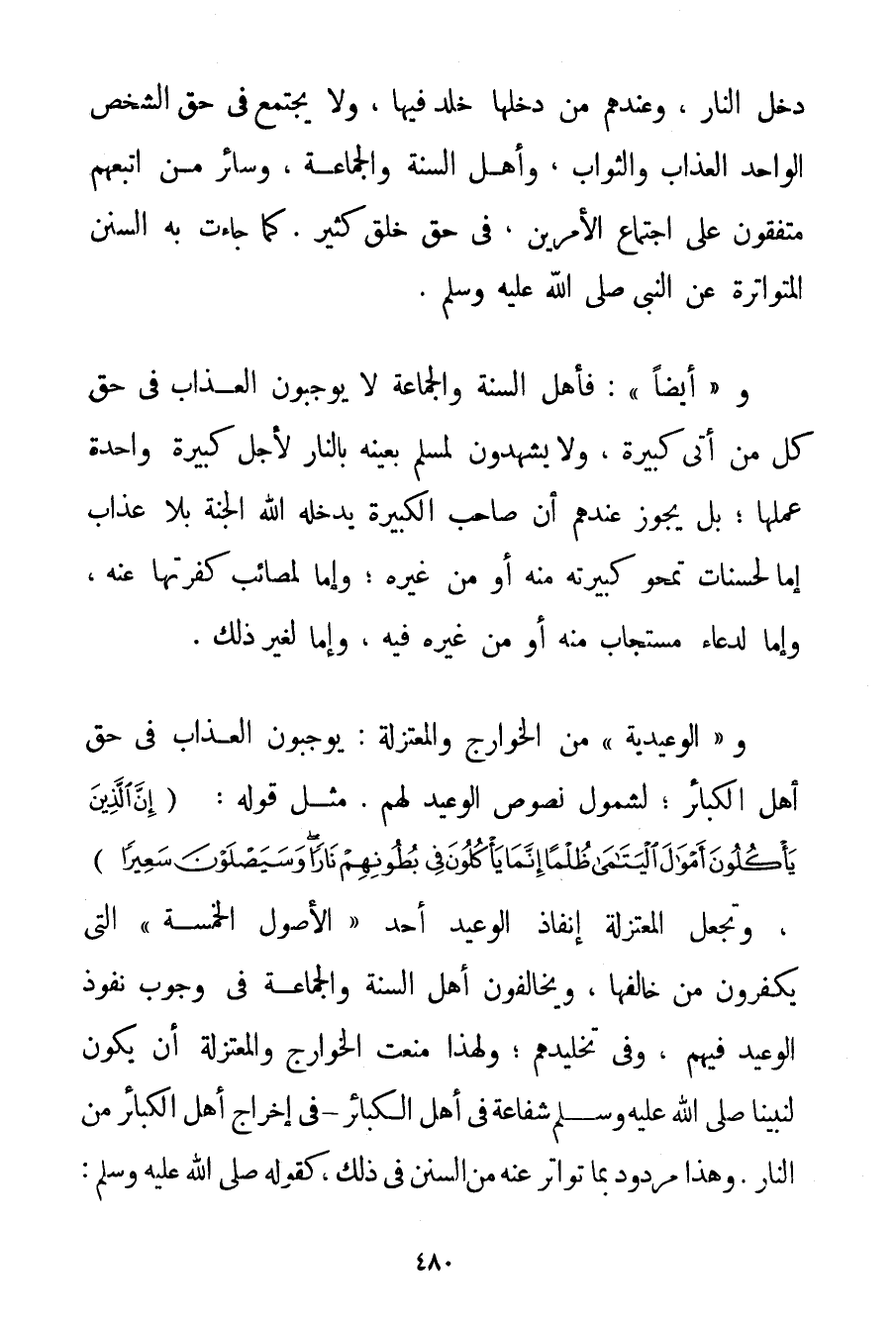 دَخَلَ النَّارَ وَعِنْدَهُمْ مَنْ دَخَلَهَا خُلِّدَ فِيهَا وَلَا يَجْتَمِعُ فِي حَقِّ الشَّخْصِ الْوَاحِدِ الْعَذَابُ وَالثَّوَابُ وَأَهْلُ السُّنَّةِ وَالْجَمَاعَةِ وَسَائِر مَنْ اتَّبَعَهُمْ مُتَّفِقُونَ عَلَى اجْتِمَاعِ الْأَمْرَيْنِ فِي حَقِّ خَلْقٍ كَثِيرٍ. كَمَا جَاءَتْ بِهِ السُّنَنُ الْمُتَوَاتِرَةُ عَنْ النَّبِيِّ صَلَّى اللَّهُ عَلَيْهِ وَسَلَّمَ. وَ " أَيْضًا ": فَأَهْلُ السُّنَّةِ وَالْجَمَاعَةِ لَا يُوجِبُونَ الْعَذَابَ فِي حَقِّ كُلِّ مَنْ أَتَى كَبِيرَةً وَلَا يَشْهَدُونَ لِمُسْلِمِ بِعَيْنِهِ بِالنَّارِ لِأَجْلِ كَبِيرَةٍ وَاحِدَةٍ عَمِلَهَا؛ بَلْ يَجُوزُ عِنْدَهُمْ أَنَّ صَاحِبَ الْكَبِيرَةِ يُدْخِلُهُ اللَّهُ الْجَنَّةَ بِلَا عَذَابٍ إمَّا لِحَسَنَاتِ تَمْحُو كَبِيرَتَهُ مِنْهُ أَوْ مِنْ غَيْرِهِ؛ وَإِمَّا لِمَصَائِبَ كَفَّرَتْهَا عَنْهُ وَإِمَّا لِدُعَاءِ مُسْتَجَابٍ مِنْهُ أَوْ مِنْ غَيْرِهِ فِيهِ وَإِمَّا لِغَيْرِ ذَلِكَ. وَ " الوعيدية " مِنْ الْخَوَارِجِ وَالْمُعْتَزِلَةِ: يُوجِبُونَ الْعَذَابَ فِي حَقِّ أَهْلِ الْكَبَائِرِ؛ لِشُمُولِ نُصُوصِ الْوَعِيدِ لَهُمْ. مِثْلُ قَوْلِهِ: {إنَّ الَّذِينَ يَأْكُلُونَ أَمْوَالَ الْيَتَامَى ظُلْمًا إنَّمَا يَأْكُلُونَ فِي بُطُونِهِمْ نَارًا وَسَيَصْلَوْنَ سَعِيرًا} وَتَجْعَلُ الْمُعْتَزِلَةُ إنْفَاذَ الْوَعِيدِ أَحَدَ " الْأُصُولِ الْخَمْسَةِ " الَّتِي يُكَفِّرُونَ مَنْ خَالَفَهَا وَيُخَالِفُونَ أَهْلَ السُّنَّةِ وَالْجَمَاعَةِ فِي وُجُوبِ نُفُوذِ الْوَعِيدِ فِيهِمْ وَفِي تَخْلِيدِهِمْ؛ وَلِهَذَا مَنَعَتْ الْخَوَارِجُ وَالْمُعْتَزِلَةُ أَنْ يَكُونَ لِنَبِيِّنَا صَلَّى اللَّهُ عَلَيْهِ وَسَلَّمَ شَفَاعَةٌ فِي أَهْلِ الْكَبَائِرِ - فِي إخْرَاجِ أَهْلِ الْكَبَائِرِ مِنْ النَّارِ. وَهَذَا مَرْدُودٌ بِمَا تَوَاتَرَ عَنْهُ مِنْ السُّنَنِ فِي ذَلِكَ كَقَوْلِهِ صَلَّى اللَّهُ عَلَيْهِ وَسَلَّمَ: