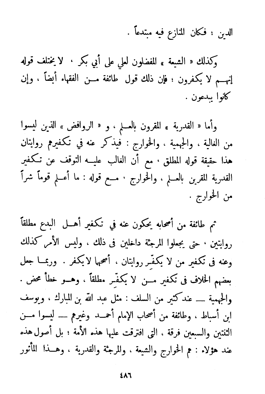 الدِّينِ؛ فَكَانَ الْمُنَازِعُ فِيهِ مُبْتَدِعًا. وَكَذَلِكَ " الشِّيعَةُ " الْمُفَضِّلُونَ لِعَلِيِّ عَلَى أَبِي بَكْرٍ لَا يَخْتَلِفُ قَوْلُهُ إنَّهُمْ لَا يُكَفَّرُونَ؛ فَإِنَّ ذَلِكَ قَوْلُ طَائِفَةٍ مِنْ الْفُقَهَاءِ أَيْضًا وَإِنْ كَانُوا يُبَدَّعُونَ. وَأَمَّا " الْقَدَرِيَّةُ " الْمُقِرُّونَ بِالْعِلْمِ وَ " الرَّوَافِضُ " الَّذِينَ لَيْسُوا مِنْ الْغَالِيَةِ وَالْجَهْمِيَّة وَالْخَوَارِجُ: فَيُذْكَرُ عَنْهُ فِي تَكْفِيرِهِمْ رِوَايَتَانِ هَذَا حَقِيقَةُ قَوْلِهِ الْمُطْلَقِ مَعَ أَنَّ الْغَالِبَ عَلَيْهِ التَّوَقُّفُ عَنْ تَكْفِيرِ الْقَدَرِيَّةِ الْمُقِرِّينَ بِالْعِلْمِ وَالْخَوَارِجِ مَعَ قَوْلِهِ: مَا أَعْلَمُ قَوْمًا شَرًّا مِنْ الْخَوَارِجِ. ثُمَّ طَائِفَةٌ مِنْ أَصْحَابِهِ يَحْكُونَ عَنْهُ فِي تَكْفِيرِ أَهْلِ الْبِدَعِ مُطْلَقًا رِوَايَتَيْنِ حَتَّى يَجْعَلُوا الْمُرْجِئَةَ دَاخِلِينَ فِي ذَلِكَ وَلَيْسَ الْأَمْرُ كَذَلِكَ وَعَنْهُ فِي تَكْفِيرِ مَنْ لَا يُكَفِّرُ رِوَايَتَانِ أَصَحُّهُمَا لَا يَكْفُرُ. وَرُبَّمَا جَعَلَ بَعْضُهُمْ الْخِلَافَ فِي تَكْفِيرِ مَنْ لَا يُكَفِّرُ مُطْلَقًا وَهُوَ خَطَأٌ مَحْضٌ. وَالْجَهْمِيَّة - عِنْدَ كَثِيرٍ مِنْ السَّلَفِ: مِثْلِ عَبْدِ اللَّهِ بْنِ الْمُبَارَكِ وَيُوسُفَ بْنِ أَسْبَاطَ وَطَائِفَةٍ مِنْ أَصْحَابِ الْإِمَامِ أَحْمَد وَغَيْرِهِمْ - لَيْسُوا مِنْهُ الثِّنْتَيْنِ وَالسَّبْعِينَ فِرْقَةً الَّتِي افْتَرَقَتْ عَلَيْهَا هَذِهِ الْأُمَّةُ؛ بَلْ أُصُولُ هَذِهِ عِنْدَ هَؤُلَاءِ: هُمْ الْخَوَارِجُ وَالشِّيعَةُ وَالْمُرْجِئَةُ وَالْقَدَرِيَّةُ وَهَذَا الْمَأْثُورُ