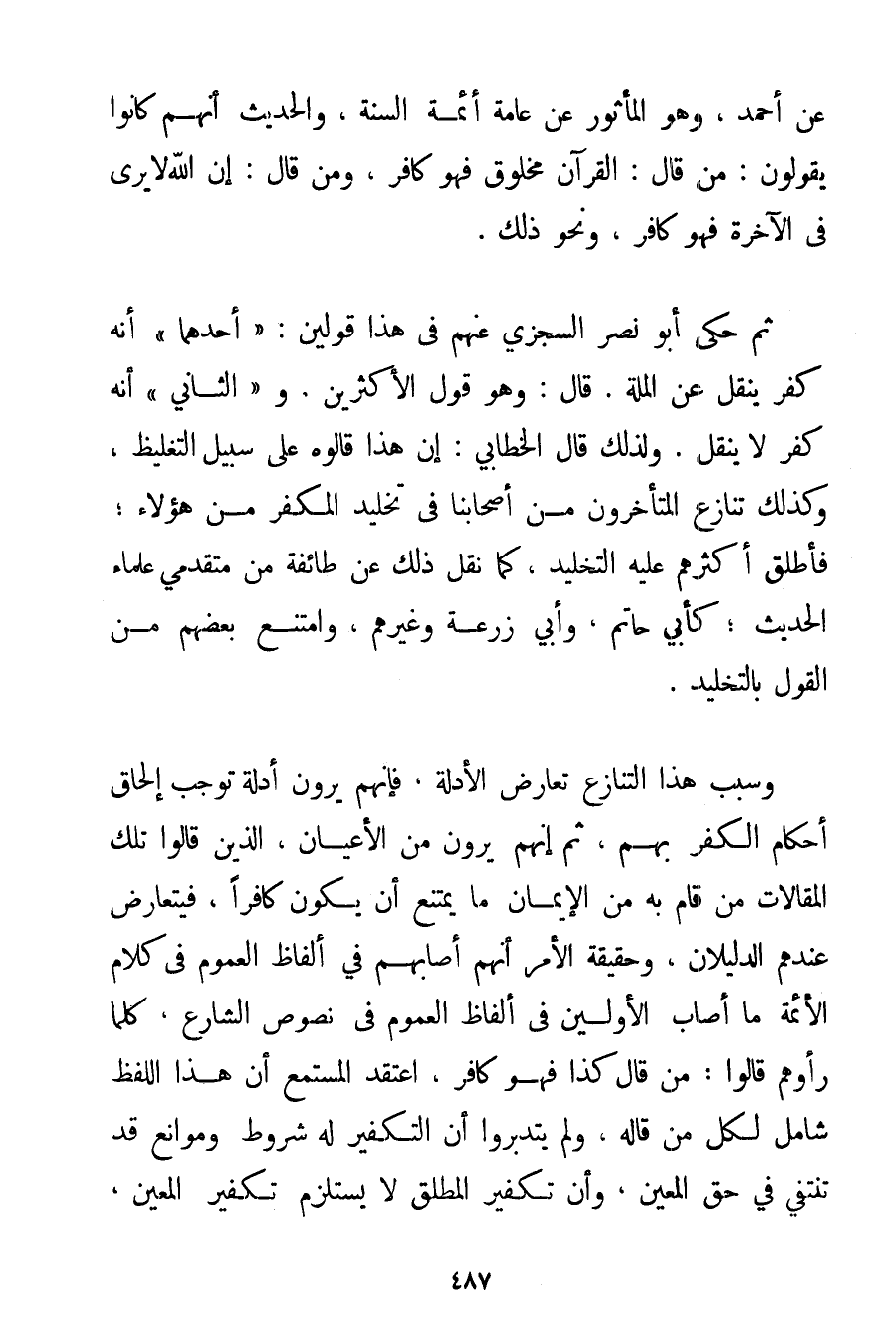 عَنْ أَحْمَد وَهُوَ الْمَأْثُورُ عَنْ عَامَّةِ أَئِمَّةِ السُّنَّةِ وَالْحَدِيثِ أَنَّهُمْ كَانُوا يَقُولُونَ؛ مَنْ قَالَ: الْقُرْآنُ مَخْلُوقٌ فَهُوَ كَافِرٌ وَمَنْ قَالَ: إنَّ اللَّهَ لَا يُرَى فِي الْآخِرَةِ فَهُوَ كَافِرٌ وَنَحْوَ ذَلِكَ. ثُمَّ حَكَى أَبُو نَصْرٍ السجزي عَنْهُمْ فِي هَذَا قَوْلَيْنِ: " أَحَدُهُمَا " أَنَّهُ كُفْرٌ يَنْقُلُ عَنْ الْمِلَّةِ. قَالَ: وَهُوَ قَوْلُ الْأَكْثَرِينَ. وَ " الثَّانِي " أَنَّهُ كُفْرٌ لَا يَنْقُلُ. وَلِذَلِكَ قَالَ الخطابي: إنَّ هَذَا قَالُوهُ عَلَى سَبِيلِ التَّغْلِيظِ وَكَذَلِكَ تَنَازَعَ الْمُتَأَخِّرُونَ مِنْ أَصْحَابِنَا فِي تَخْلِيدِ الْمُكَفَّرِ مِنْ هَؤُلَاءِ؛ فَأَطْلَقَ أَكْثَرُهُمْ عَلَيْهِ التَّخْلِيدَ كَمَا نُقِلَ ذَلِكَ عَنْ طَائِفَةٍ مِنْ مُتَقَدِّمِي عُلَمَاءِ الْحَدِيثِ؛ كَأَبِي حَاتِمٍ؟ وَأَبِي زُرْعَةَ وَغَيْرِهِمْ وَامْتَنَعَ بَعْضُهُمْ مِنْ الْقَوْلِ بِالتَّخْلِيدِ. وَسَبَبُ هَذَا التَّنَازُعِ تَعَارُضُ الْأَدِلَّةِ فَإِنَّهُمْ يَرَوْنَ أَدِلَّةً تُوجِبُ إلْحَاقَ أَحْكَامِ الْكُفْرِ بِهِمْ ثُمَّ إنَّهُمْ يَرَوْنَ مِنْ الْأَعْيَانِ الَّذِينَ قَالُوا تِلْكَ الْمَقَالَاتِ مَنْ قَامَ بِهِ مِنْ الْإِيمَانِ مَا يَمْتَنِعُ أَنْ يَكُونَ كَافِرًا فَيَتَعَارَضُ عِنْدَهُمْ الدَّلِيلَانِ وَحَقِيقَةُ الْأَمْرِ أَنَّهُمْ أَصَابَهُمْ فِي أَلْفَاظِ الْعُمُومِ فِي كَلَامِ الْأَئِمَّةِ مَا أَصَابَ الْأَوَّلِينَ فِي أَلْفَاظِ الْعُمُومِ فِي نُصُوصِ الشَّارِعِ كُلَّمَا رَأَوْهُمْ قَالُوا: مَنْ قَالَ كَذَا فَهُوَ كَافِرٌ اعْتَقَدَ الْمُسْتَمِعُ أَنَّ هَذَا اللَّفْظَ شَامِلٌ لِكُلِّ مَنْ قَالَهُ وَلَمْ يَتَدَبَّرُوا أَنَّ التَّكْفِيرَ لَهُ شُرُوطٌ وَمَوَانِعُ قَدْ تَنْتَقِي فِي حَقِّ الْمُعَيَّنِ وَأَنَّ تَكْفِيرَ الْمُطْلَقِ لَا يَسْتَلْزِمُ تَكْفِيرَ الْمُعَيَّنِ