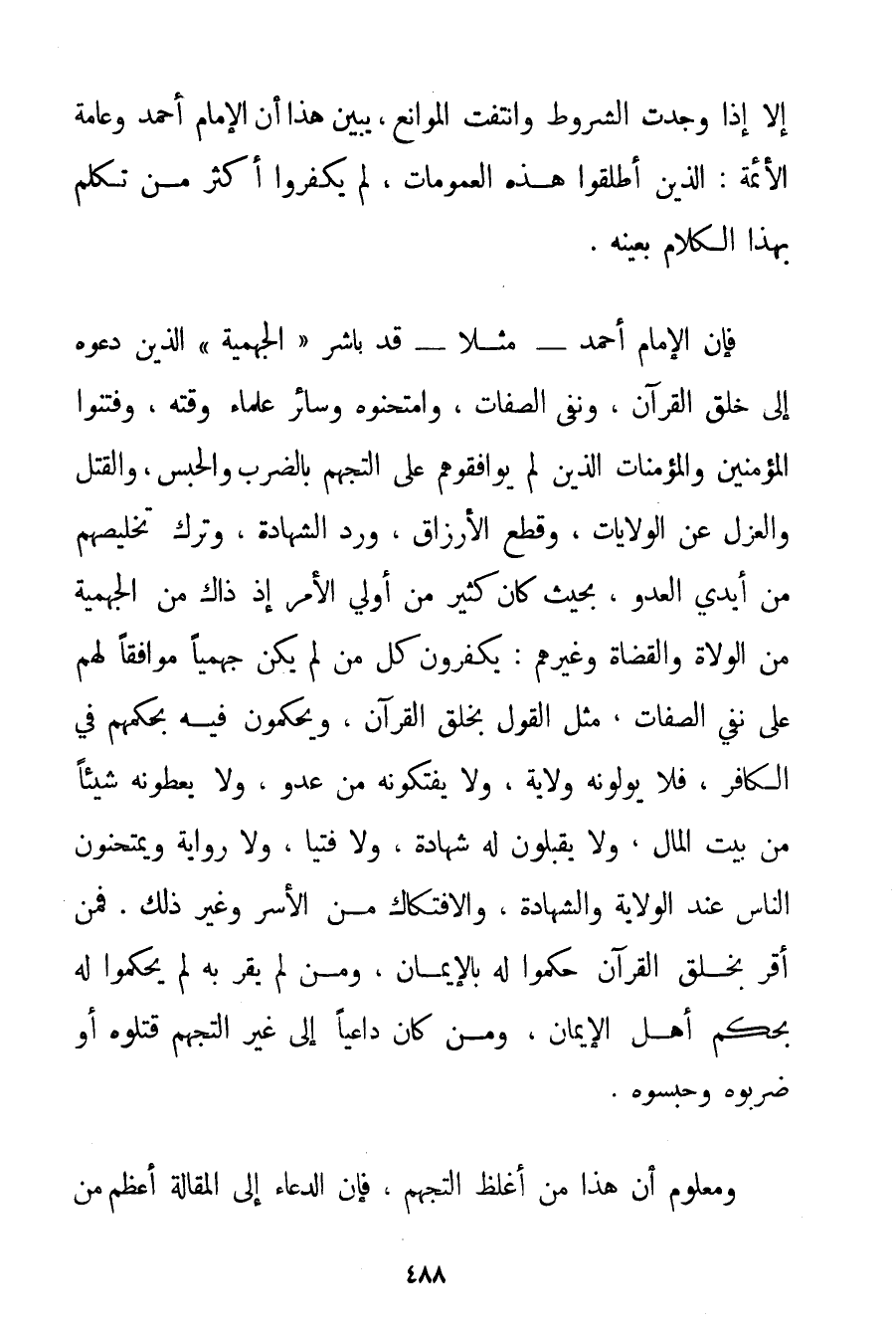 إلَّا إذَا وُجِدَتْ الشُّرُوطُ وَانْتَفَتْ الْمَوَانِعُ يُبَيِّنُ هَذَا أَنَّ الْإِمَامَ أَحْمَد وَعَامَّةَ الْأَئِمَّةِ: الَّذِينَ أَطْلَقُوا هَذِهِ العمومات لَمْ يُكَفِّرُوا أَكْثَرَ مَنْ تَكَلَّمَ بِهَذَا الْكَلَامِ بِعَيْنِهِ. فَإِنَّ الْإِمَامَ أَحْمَد - مَثَلًا - قَدْ بَاشَرَ " الْجَهْمِيَّة " الَّذِينَ دَعَوْهُ إلَى خَلْقِ الْقُرْآنِ وَنَفْيِ الصِّفَاتِ وَامْتَحَنُوهُ وَسَائِر عُلَمَاءِ وَقْتِهِ وَفَتَنُوا الْمُؤْمِنِينَ وَالْمُؤْمِنَاتِ الَّذِينَ لَمْ يُوَافِقُوهُمْ عَلَى التَّجَهُّمِ بِالضَّرْبِ وَالْحَبْسِ وَالْقَتْلِ وَالْعَزْلِ عَنْ الْوِلَايَاتِ وَقَطْعِ الْأَرْزَاقِ وَرَدِّ الشَّهَادَةِ وَتَرْكِ تَخْلِيصِهِمْ مِنْ أَيْدِي الْعَدُوِّ بِحَيْثُ كَانَ كَثِيرٌ مِنْ أُولِي الْأَمْرِ إذْ ذَاكَ مِنْ الْجَهْمِيَّة مِنْ الْوُلَاةِ وَالْقُضَاةِ وَغَيْرِهِمْ: يُكَفِّرُونَ كُلَّ مَنْ لَمْ يَكُنْ جهميا مُوَافِقًا لَهُمْ عَلَى نَفْيِ الصِّفَاتِ مِثْلِ الْقَوْلِ بِخَلْقِ الْقُرْآنِ وَيَحْكُمُونَ فِيهِ بِحُكْمِهِمْ فِي الْكَافِرِ فَلَا يُوَلُّونَهُ وِلَايَةً وَلَا يُفْتِكُونَهُ مِنْ عَدُوٍّ وَلَا يُعْطُونَهُ شَيْئًا مِنْ بَيْتِ الْمَالِ وَلَا يَقْبَلُونَ لَهُ شَهَادَةً وَلَا فُتْيَا وَلَا رِوَايَةً وَيَمْتَحِنُونَ النَّاسَ عِنْدَ الْوِلَايَةِ وَالشَّهَادَةِ وَالِافْتِكَاكِ مِنْ الْأَسْرِ وَغَيْرِ ذَلِكَ. فَمَنْ أَقَرَّ بِخَلْقِ الْقُرْآنِ حَكَمُوا لَهُ بِالْإِيمَانِ وَمَنْ لَمْ يُقِرَّ بِهِ لَمْ يَحْكُمُوا لَهُ بِحُكْمِ أَهْلِ الْإِيمَانِ وَمَنْ كَانَ دَاعِيًا إلَى غَيْرِ التَّجَهُّمِ قَتَلُوهُ أَوْ ضَرَبُوهُ وَحَبَسُوهُ. وَمَعْلُومٌ أَنَّ هَذَا مِنْ أَغْلَظِ التَّجَهُّمِ فَإِنَّ الدُّعَاءَ إلَى الْمَقَالَةِ أَعْظَمُ مِنْ