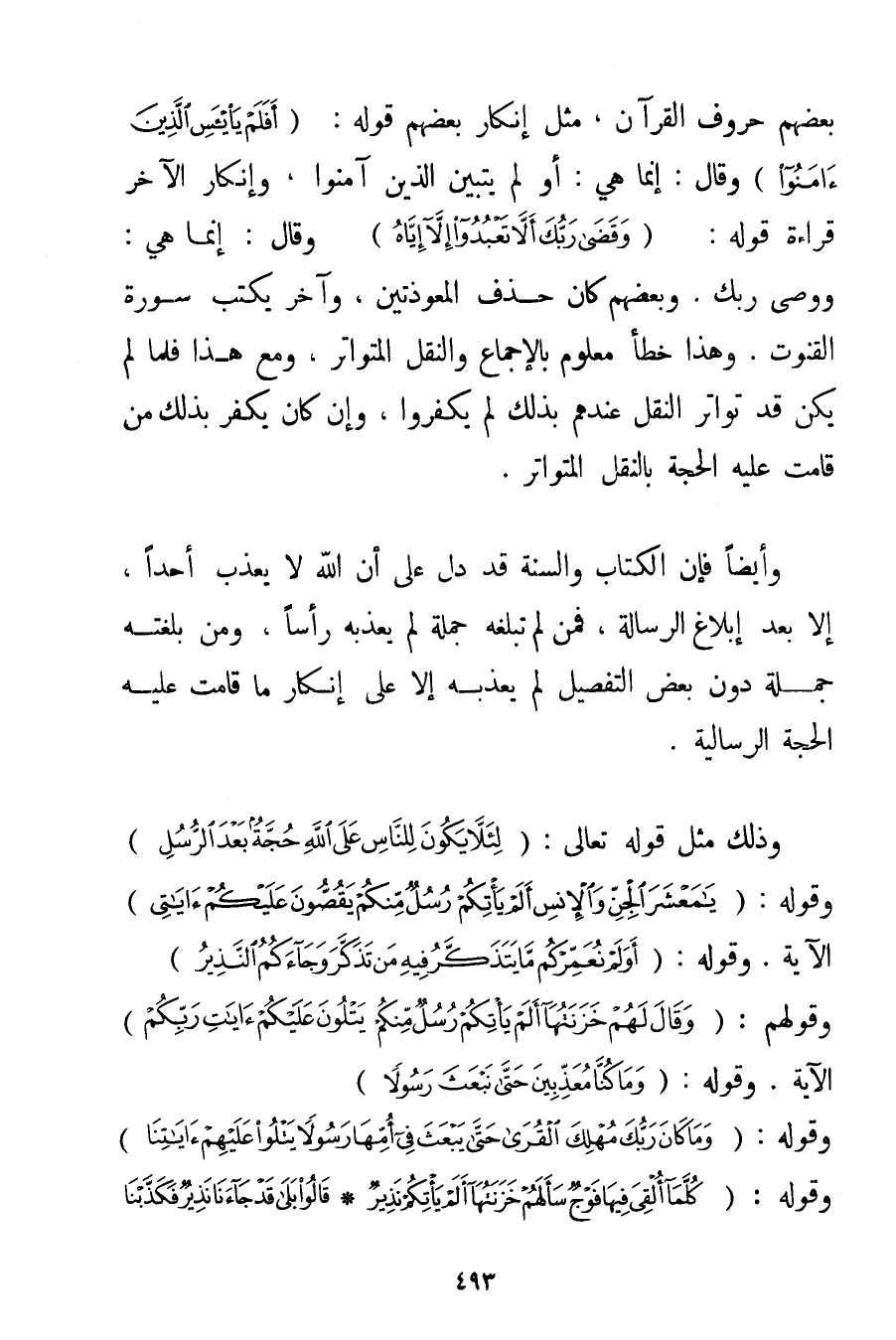 بَعْضُهُمْ حُرُوفَ الْقُرْآنِ مِثْلَ إنْكَارِ بَعْضِهِمْ قَوْلَهُ: {أَفَلَمْ يَيْأَسِ الَّذِينَ آمَنُوا} وَقَالَ: إنَّمَا هِيَ: أو لَمْ يَتَبَيَّنْ الَّذِينَ آمَنُوا وَإِنْكَارِ الْآخَرِ قِرَاءَةَ قَوْلِهِ: {وَقَضَى رَبُّكَ أَلَّا تَعْبُدُوا إلَّا إيَّاهُ} وَقَالَ: إنَّمَا هِيَ: وَوَصَّى رَبُّك. وَبَعْضُهُمْ كَانَ حَذَفَ الْمُعَوِّذَتَيْنِ وَآخَرُ يَكْتُبُ سُورَةَ الْقُنُوتِ. وَهَذَا خَطَأٌ مَعْلُومٌ بِالْإِجْمَاعِ وَالنَّقْلِ الْمُتَوَاتِرِ وَمَعَ هَذَا فَلَمَّا لَمْ يَكُنْ قَدْ تَوَاتَرَ النَّقْلُ عِنْدَهُمْ بِذَلِكَ لَمْ يُكَفَّرُوا وَإِنْ كَانَ يَكْفُرُ بِذَلِكَ مَنْ قَامَتْ عَلَيْهِ الْحُجَّةُ بِالنَّقْلِ الْمُتَوَاتِرِ. وَأَيْضًا فَإِنَّ الْكِتَابَ وَالسُّنَّةَ قَدْ دَلَّ عَلَى أَنَّ اللَّهَ لَا يُعَذِّبُ أَحَدًا إلَّا بَعْدَ إبْلَاغِ الرِّسَالَةِ فَمَنْ لَمْ تَبْلُغْهُ جُمْلَةً لَمْ يُعَذِّبْهُ رَأْسًا وَمَنْ بَلَغَتْهُ جُمْلَةً دُونَ بَعْضِ التَّفْصِيلِ لَمْ يُعَذِّبْهُ إلَّا عَلَى إنْكَارِ مَا قَامَتْ عَلَيْهِ الْحُجَّةُ الرسالية. وَذَلِكَ مِثْلُ قَوْله تَعَالَى {لِئَلَّا يَكُونَ لِلنَّاسِ عَلَى اللَّهِ حُجَّةٌ بَعْدَ الرُّسُلِ} وَقَوْلِهِ: {يَا مَعْشَرَ الْجِنِّ وَالْإِنْسِ أَلَمْ يَأْتِكُمْ رُسُلٌ مِنْكُمْ يَقُصُّونَ عَلَيْكُمْ آيَاتِي} الْآيَةَ. وَقَوْلِهِ: {أَوَلَمْ نُعَمِّرْكُمْ مَا يَتَذَكَّرُ فِيهِ مَنْ تَذَكَّرَ وَجَاءَكُمُ النَّذِيرُ} وَقَوْلِهِ: {وَقَالَ لَهُمْ خَزَنَتُهَا أَلَمْ يَأْتِكُمْ رُسُلٌ مِنْكُمْ يَتْلُونَ عَلَيْكُمْ آيَاتِ رَبِّكُمْ} الْآيَةَ. وَقَوْلِهِ: {وَمَا كُنَّا مُعَذِّبِينَ حَتَّى نَبْعَثَ رَسُولًا} وَقَوْلِهِ: {وَمَا كَانَ رَبُّكَ مُهْلِكَ الْقُرَى حَتَّى يَبْعَثَ فِي أُمِّهَا رَسُولًا يَتْلُو عَلَيْهِمْ آيَاتِنَا} وَقَوْلِهِ: {كُلَّمَا أُلْقِيَ فِيهَا فَوْجٌ سَأَلَهُمْ