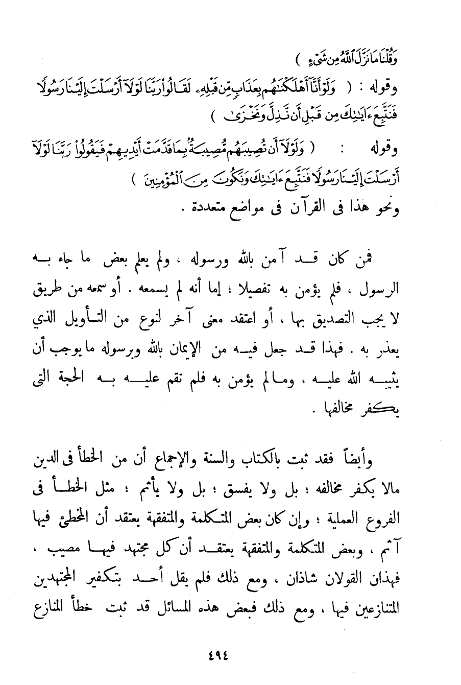 خَزَنَتُهَا أَلَمْ يَأْتِكُمْ نَذِيرٌ} {قَالُوا بَلَى قَدْ جَاءَنَا نَذِيرٌ فَكَذَّبْنَا وَقُلْنَا مَا نَزَّلَ اللَّهُ مِنْ شَيْءٍ} وَقَوْلِهِ: {وَلَوْ أَنَّا أَهْلَكْنَاهُمْ بِعَذَابٍ مِنْ قَبْلِهِ لَقَالُوا رَبَّنَا لَوْلَا أَرْسَلْتَ إلَيْنَا رَسُولًا فَنَتَّبِعَ آيَاتِكَ مِنْ قَبْلِ أَنْ نَذِلَّ وَنَخْزَى} وَقَوْلِهِ " {وَلَوْلَا أَنْ تُصِيبَهُمْ مُصِيبَةٌ بِمَا قَدَّمَتْ أَيْدِيهِمْ فَيَقُولُوا رَبَّنَا لَوْلَا أَرْسَلْتَ إلَيْنَا رَسُولًا فَنَتَّبِعَ آيَاتِكَ وَنَكُونَ مِنَ الْمُؤْمِنِينَ} وَنَحْوُ هَذَا فِي الْقُرْآنِ فِي مَوَاضِعَ مُتَعَدِّدَةٍ. فَمَنْ كَانَ قَدْ آمَنَ بِاَللَّهِ وَرَسُولِهِ وَلَمْ يَعْلَمْ بَعْضَ مَا جَاءَ بِهِ الرَّسُولُ فَلَمْ يُؤْمِنْ بِهِ تَفْصِيلًا؛ إمَّا أَنَّهُ لَمْ يَسْمَعْهُ. أَوْ سَمِعَهُ مِنْ طَرِيقٍ لَا يَجِبُ التَّصْدِيقُ بِهَا أَوْ اعْتَقَدَ مَعْنًى آخَرَ لِنَوْعِ مِنْ التَّأْوِيلِ الَّذِي يُعْذَرُ بِهِ. فَهَذَا قَدْ جُعِلَ فِيهِ مِنْ الْإِيمَانِ بِاَللَّهِ وَبِرَسُولِهِ مَا يُوجِبُ أَنْ يُثِيبَهُ اللَّهُ عَلَيْهِ وَمَا لَمْ يُؤْمِنْ بِهِ فَلَمْ تَقُمْ عَلَيْهِ بِهِ الْحُجَّةُ الَّتِي يَكْفُرُ مُخَالِفُهَا. وَأَيْضًا فَقَدْ ثَبَتَ بِالْكِتَابِ وَالسُّنَّةِ وَالْإِجْمَاعِ أَنَّ مِنْ الْخَطَأِ فِي الدِّينِ مَا لَا يَكْفُرُ مُخَالِفُهُ؛ بَلْ وَلَا يَفْسُقُ؛ بَلْ وَلَا يَأْثَمُ؛ مِثْلُ الْخَطَأِ فِي الْفُرُوعِ الْعَمَلِيَّةِ؛ وَإِنْ كَانَ بَعْضُ الْمُتَكَلِّمَةِ وَالْمُتَفَقِّهَةِ يَعْتَقِدُ أَنَّ الْمُخْطِئَ فِيهَا آثِمٌ وَبَعْضُ الْمُتَكَلِّمَةِ وَالْمُتَفَقِّهَةِ يَعْتَقِدُ أَنَّ كُلَّ مُجْتَهِدٍ فِيهَا مُصِيبٌ فَهَذَانِ الْقَوْلَانِ شَاذَّانِ وَمَعَ ذَلِكَ فَلَمْ يَقُلْ أَحَدٌ بِتَكْفِيرِ الْمُجْتَهِدِينَ الْمُتَنَازِعِينَ فِيهَا وَمَعَ ذَلِكَ فَبَعْضُ هَذِهِ الْمَسَائِلِ قَدْ ثَبَتَ خَطَأُ الْمُنَازِعِ